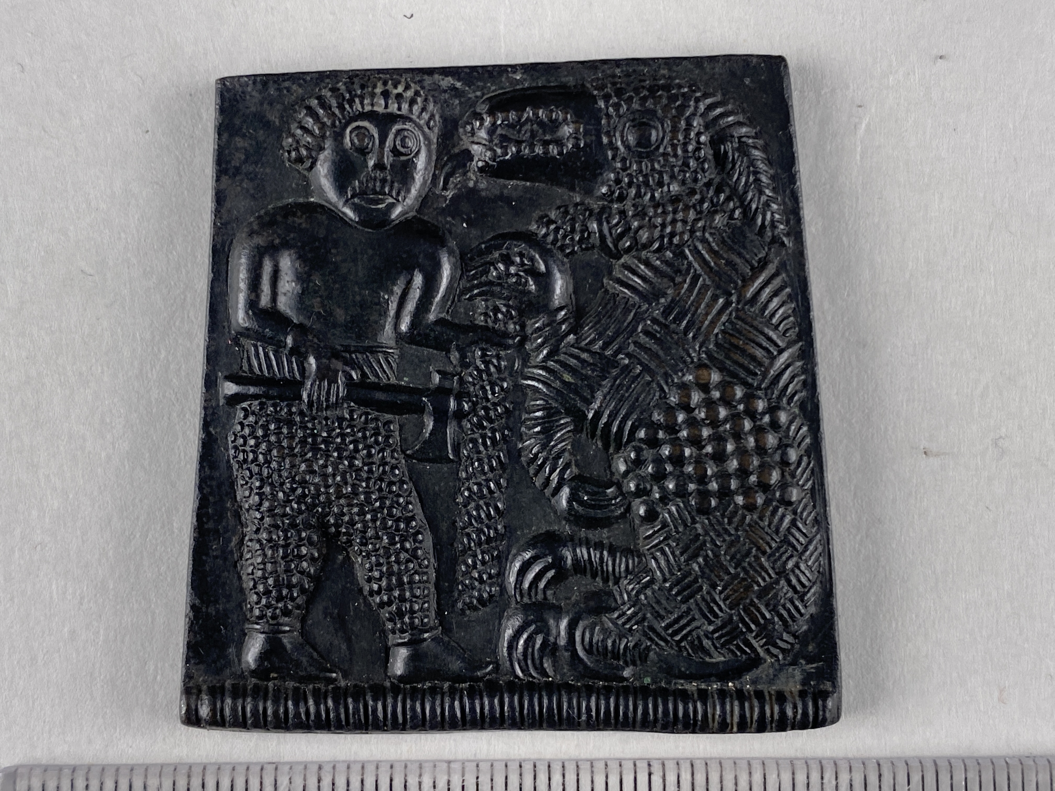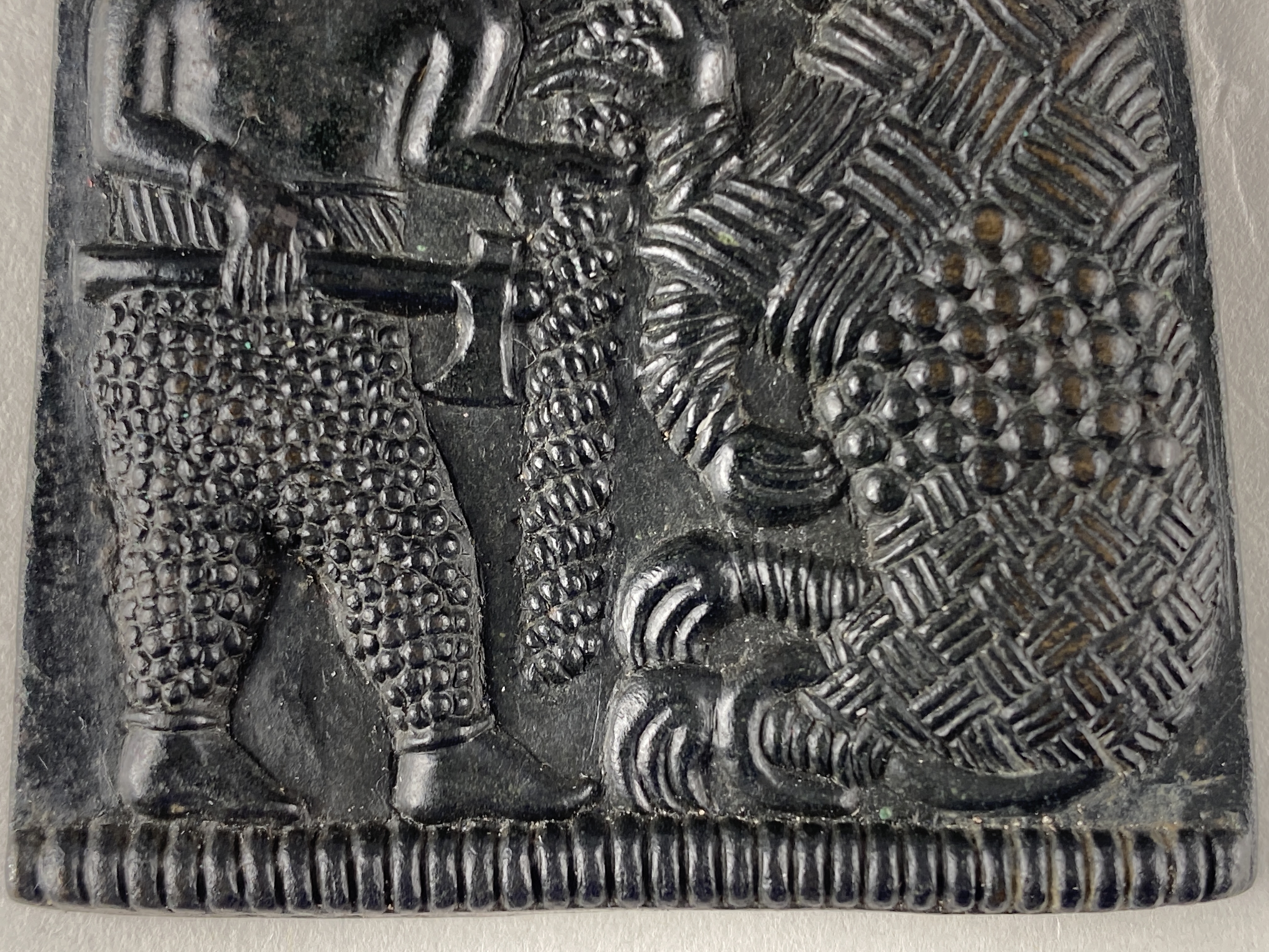 För framställning av pressblecksdekor på hjälm. En man med yxa i högra handen och i den vänstra ett tjockt rep, som omsluter halsen på ett stort djur, vilket sitter på bakbenen.
