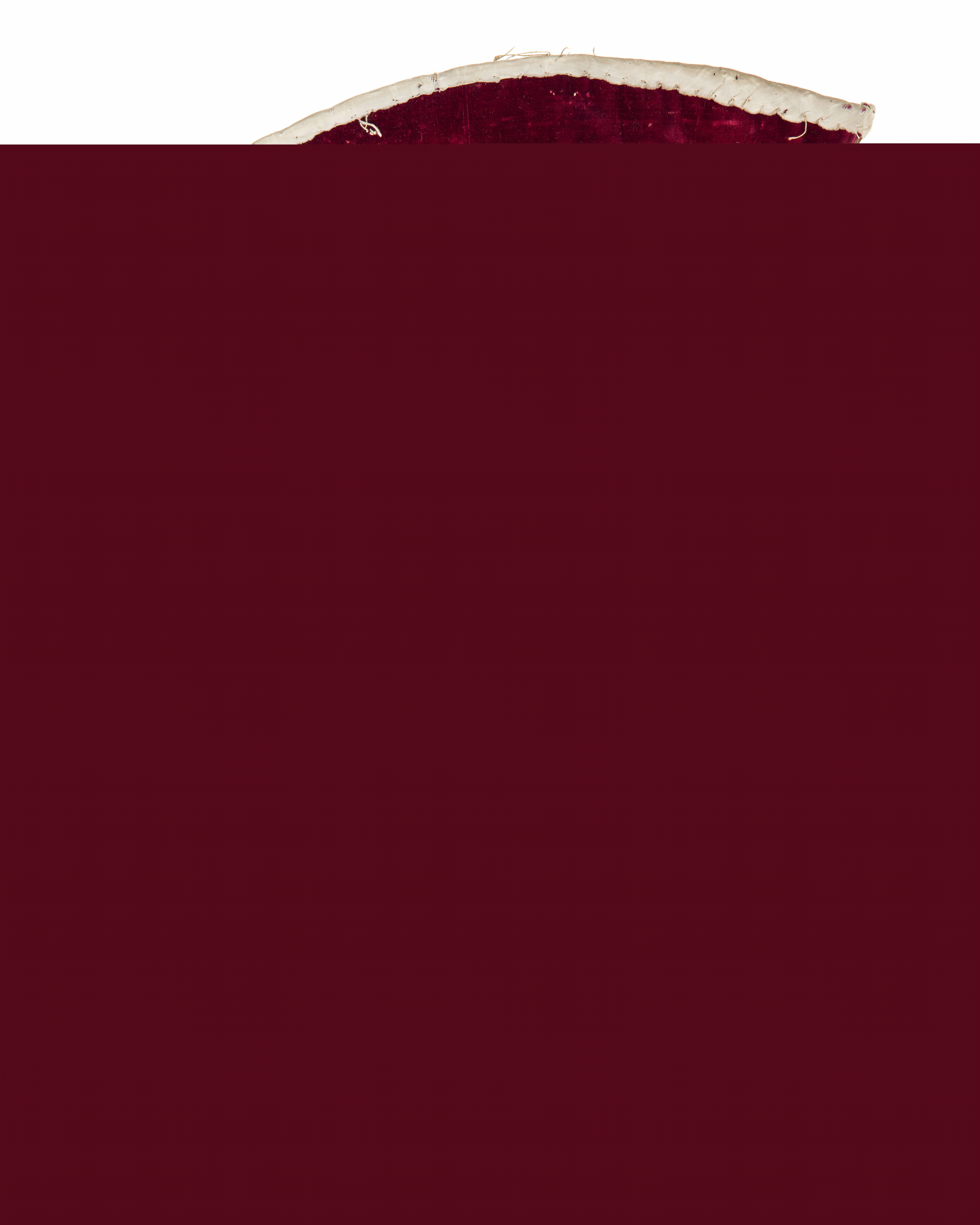 Stövel av karminröd sammet buren av Karl XIII vid kröningen 1809. Modellen har rak läst och svagt rundad tå. Skaftet med söm fram och bak har två dragstroppar av siden och kraftigt utsvängd krage. Stöveln är dekorerad med 85 broderade, öppna kronor utförda av lan, kantiljer och paljetter. Stöveln är fodrad med gråbeige siden. Den randsydda sulan är klisterputsad liksom klacken. Ovanför den sitter en stropp av guldgalon som hjälper till att hålla sporren på plats. Slitsulan har tandade pinnhålsstämplar under trampet, hålfoten och klacken.