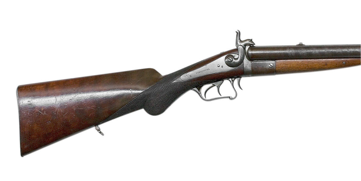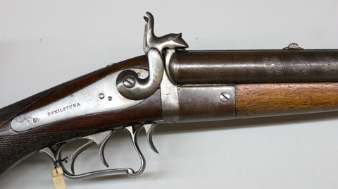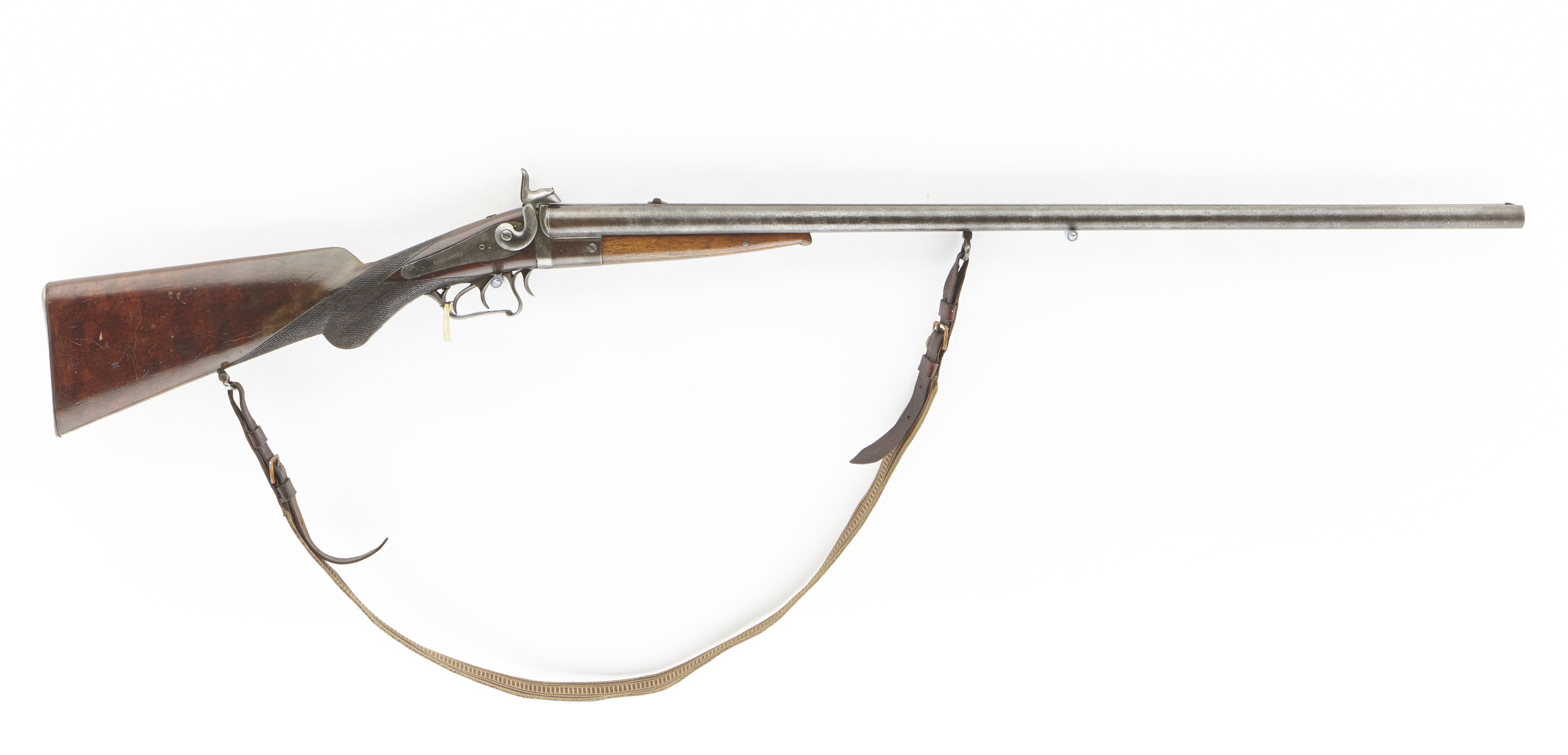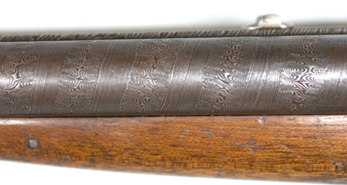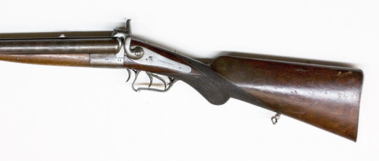 Rund, slätborrad, damaskerad, brunerad(?) dubbelpipa, laminettedamask, skålad, damaskerad överspång, plan, damaskerad underspång. Vid pipbasen urtag för patronernas tändstift. På pipornas undersida fastlött ett invändigt gängat stålrör, l: 41 mm, inre d: ca 20 mm. På rörets h sida stoppskruv för vridningen. På underspången därframför fäst ett häfte, mitt under pipan en rembygel av stål. Riktmedel: På överspången sitter en oval siktplatta med U-formigt sikte av stål, spolformigt korn av silver. Baskyl av stål med öron. På v sida nedanför örat stämplat: PATENT och 26. Baskylblad som går längs hela kolvryggen, avsmalnat i en avsats, rund ände, tre skruvar. På baskylen framtill fäst en gängad stålstav på vilken pipan skruvas, l: 31 mm, på framänden två stoppstift för pipans vridning, ovanför staven ett litet låsstift som påverkas av fingergrepp framför varbygeln. Hanlås med bakåtliggande slagfjädrar, plana låsbleck, stämplad signering: "C. G. GRANBERG", på h bleck "ESKILSTUNA". S-formiga, välvda hanar, slaghuvuden i räta vinklar, nätskurna tumgrepp. Länk nöt-slagfjäder. Hanarna på insidan av halsen stämplade 26, låsblecken på insidan framtill stämplade 6. Fästning: En låsskruv från v sida. Dubbla avtryckare. Avtryckarbleck framtill fastskruvat i baskylen, bakåt utdraget längs pistolgreppets undersida, tre fästskruvar. Halvstock med kolv av valnöt(?), halvt pistolgrepp, nätskuren kolvhals och grepp samt fortsättning i spets på kolvens undersida. Förstock av ljusare trä (utbytt?). Beslag av gråanlöpt stål, bakplåt med liten spets på kolvryggen, två skruvar. På kolvens undersida sitter en rembygel av stål. På avtryckarblecket fäst en varbygel med kluvna stolpar, framstolpen s-formigt svängd.