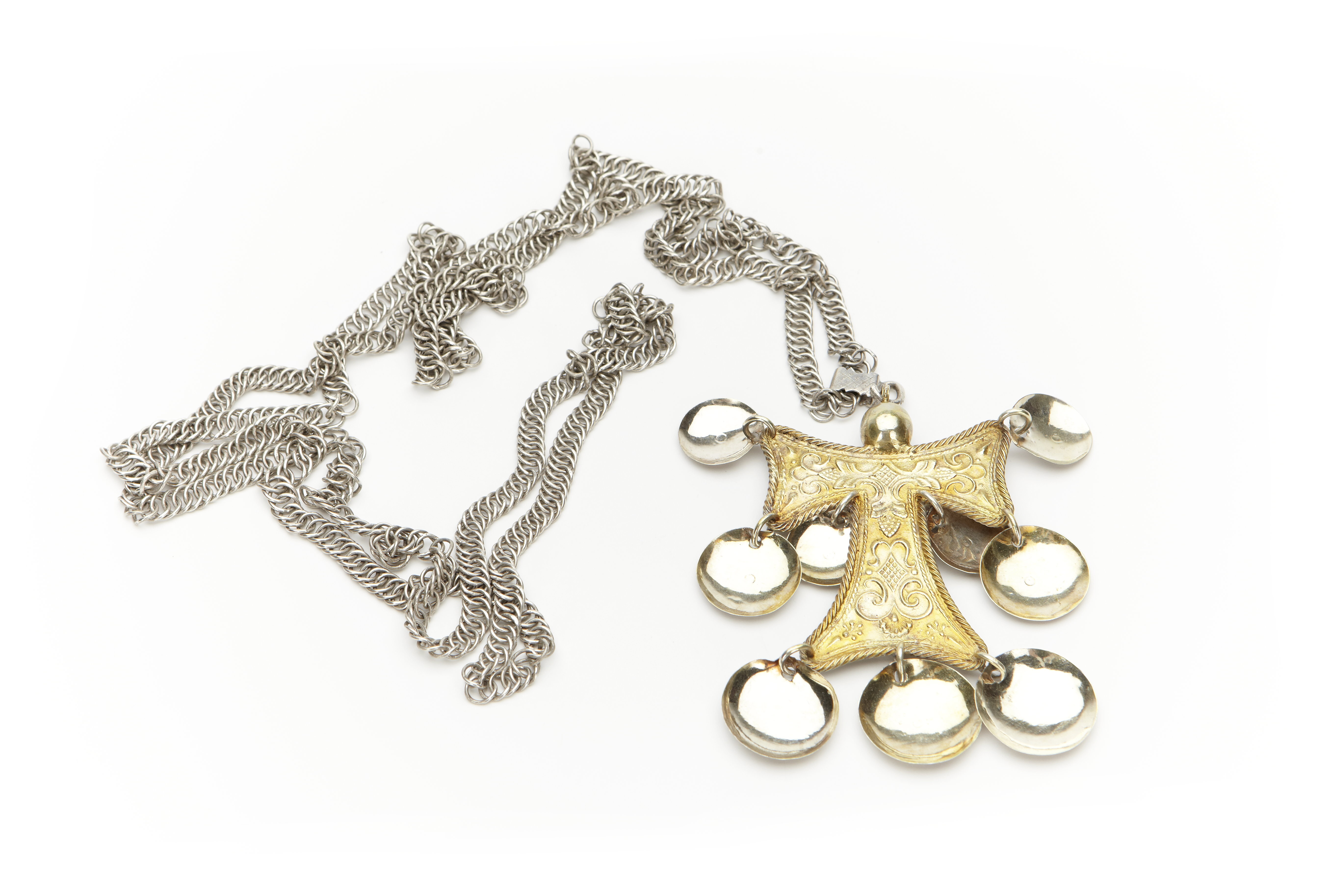 T-formigt kors, striglakors, av förgyllt silver med nio runda, kupiga hängen.