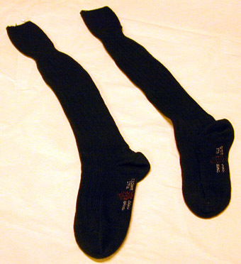 Knästrumpa av grönt yllegarn. Ovansidan av foten samt skaftet med bred ribbstickning omfyra räta och fyra aviga. Häl, tå och fot slätstickade. 165 mm bred krage medresårstickning, en avig och en rät. På undersidan av foten svagt synligt, brittiskttillverkarnamn och firmamärke.