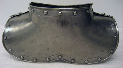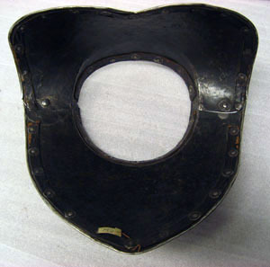Av driven stålplåt med utsidan blankpolerad. Bestående av ett fram- och ett bakstycke, sammanfogade med över vänster axel en genomgående nit och över höger nyckelhålsformat hål över utstående nit. Plåtarna välvda över axlarna, upptill med rundade urtagningar för halsen med kanten vinklad uppåt till en 24 mm hög krage. Bakstycket brant med i nedre kantens mitt mjukt V-formad urtagning. Framstycket flackare och neddraget över bröstet med svagt rundade sidor nertill mötandes i bred spets. Alla yttre kanter omvikta och rundsmidda med nitar i rad och skuren kantlinje. Insidan brunsvart och obehandlad med svärtade läderband längs kanterna.