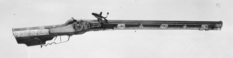 Åttsidig, räfflad pipa av stål med kort, nästan rakt, baktill tvärt avskuret svansskruvblad, streckdekor. På sidofaserna kedjedekor. På mittfasen 17 mm från pipbasen en rektangulär stämpel liknande ett H med ettT-streck på v.stapel och ett O på h.stapel (LRK vägl.1921:356, Stöckelnr 4581-4582, otydligare än på nr 16290). Riktmedel: längs hela svansskruvbladets mitt förbi stämpeln en 64 mm lång, tunn siktlinje avslutad med ett litet blad. 132 mm från pipbasen ett inlaxat klaffsikte av stål (extraklaffen saknas). Vid mynningen ett inlaxat stolpkorn av koppar. Fästning: två häften av stål, främre häftet saknas. Pipan fäst med krysskruv underifrån samt två pipstift av trä. Hjullås av tysk typ med plant låsbleck, något svängd bakände. Utanpåliggande hjul fäst med hjärtformig ring fäst med skruvar kl. 3 och 9. Fängpanna med profilerad gavel, krutskärm med horisontell, triangulär topplatta och svängt mellanparti. Blånerat fängpannelock med rörlig arm, profilerat grepp med ringformig avslutning. Tryckknapp utan huvud. Hane med fasad kropp, balusterformig nedre del. Ringformig hals. Lös blånerad överkäke, kluvet fingergrepp med upprullade ändar, käkskruv med fyrsidigt huvud, liten ändkula, skärm i form av bakåtseende odjurshuvud framför hanskruven. Blånerad hanfjäder med rund skålning i vinkeln, fyra rundade fasningar och punsade rankor, fjäderlövet avbrutet. Låset invändigt blankt. Fästning: Två låsskruvar med välvda huvuden. Avtryckare på rektangulärt bleck med snälltryck. Helstock av tysk typ av valnöt, kolvlåda och vinge. Beslag och inläggningar av ben med graverad dekor av skiftande kvalité. På kolv och framstock kantlister. Bakplåt av horn med rester av etikett, stödkula av ben. Längs bakkanten liksom på kolvryggen benlister med enkel bladdekor. Vid svansskruvbladet plattor med runda ändplattor. På kolvens h. sida ovanför två plattor i form av fyrblad, däremellan oval platta med blad. Kolvlådelock helt täckt av benplatta med graverad dekor, beslagsornamentik mot streckad bakgrund, ovalt mittfält med springande hind. På anslaget en naivistisk scen med en släde med hög framände, dragen av häst med hög bjällerkrans, i (på?) släden sitter en man i vid rock med axelkarmar, nedvikt krage, axelgehäng, toppluva, i h. hand en slingrande pisksnärt. På bakänden står en page som håller två nedanför släden (på samma benplatta) springande hundar. Två låsskruvbrickor i form av fiskar-drakar vända från varandra. På kolvens undersida två runda, blomformiga plattor (NB den bakre genombruten av 7 hål in till låsurtaget !). Spetsrörka i form av benplatta med blad- och fruktdekor, topprörka med rektangulärt mitthål. Ovala pipstiftbrickor med springande djur, baktill hundar med halsband, i mitten rävar (?),framtill harar. Däremellan benplattor i form av fyrblad. Näsband med bladdekor. Varbygel med tre fingerlägen. Tillbehör: Laddstock, l: 650 mm, framtill skoning av ben, skålad framände, graverad streckdekor, tre hornringar, två infällda in benet, den bakre vid skoningens bakände. Baktill stålskoning.