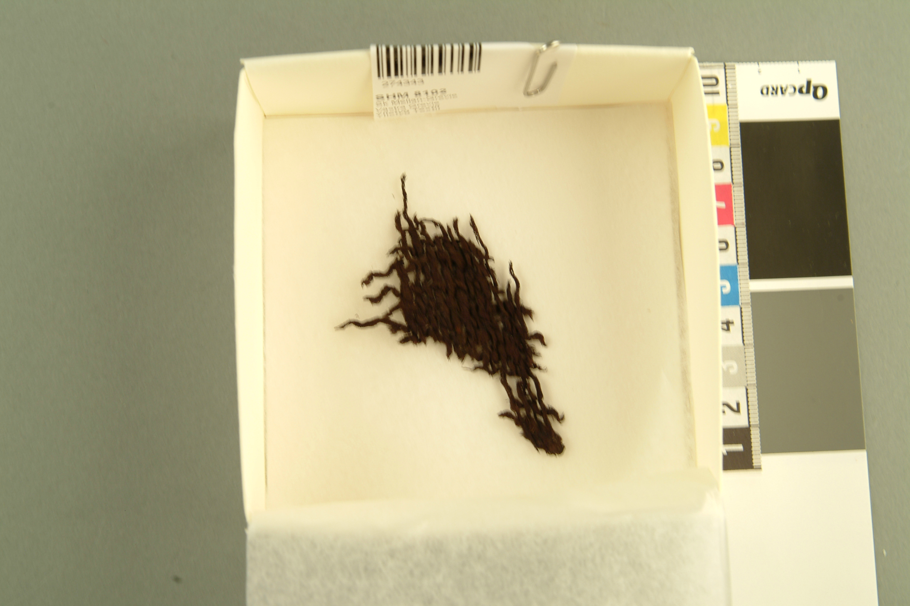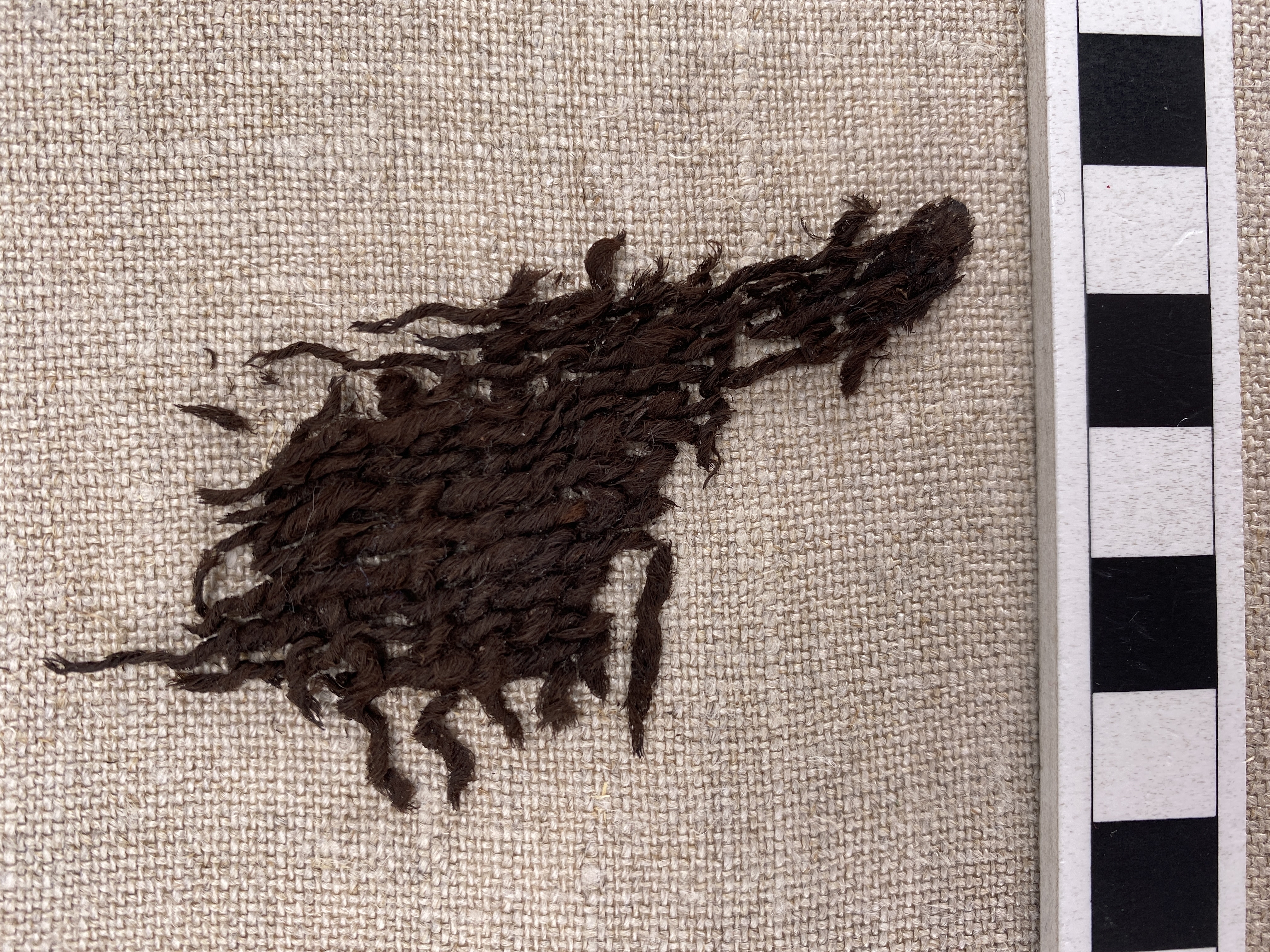 Fragment av ylletyg, tuskaft. Amica Sundström 2007: Fiber ull / ull. Spinnriktning S / Z. Trådantal 4,5 / 3. Garndiameter 1-2 / 2. Bindning tuskaft. Fragment av ylletyg vävt i tuskaft.