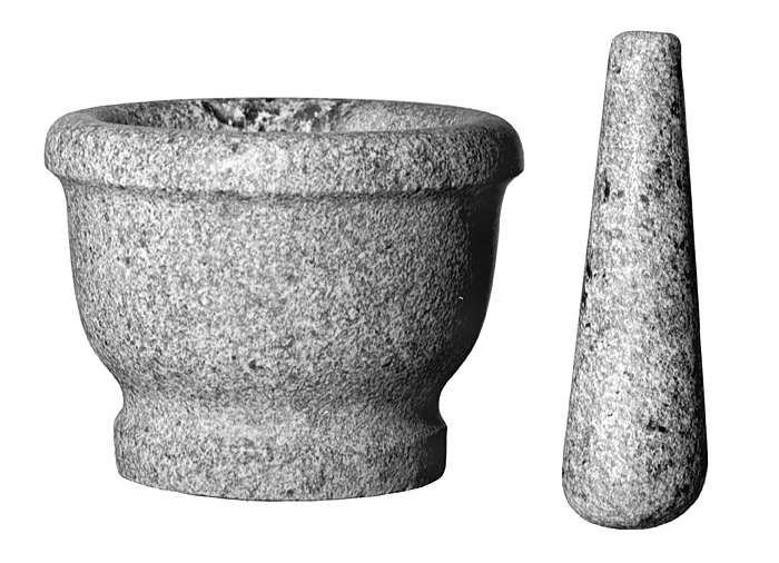 MORTEL med stöt Av brun- och gråspräcklig marmor (Mölnbo). Svagt skålformig, på hög fotplatta. Bräddkanten vulstigt utsvälld och något utstående; fotplattan med rak kant, över denna en kälformig hals Höjd: 12,3 cm.; diameter: 16,5 cm. Stöt: Konisk, med rundad nederända och platt överända. Längd: 16,8 cm.; diameter: 4,9 cm.