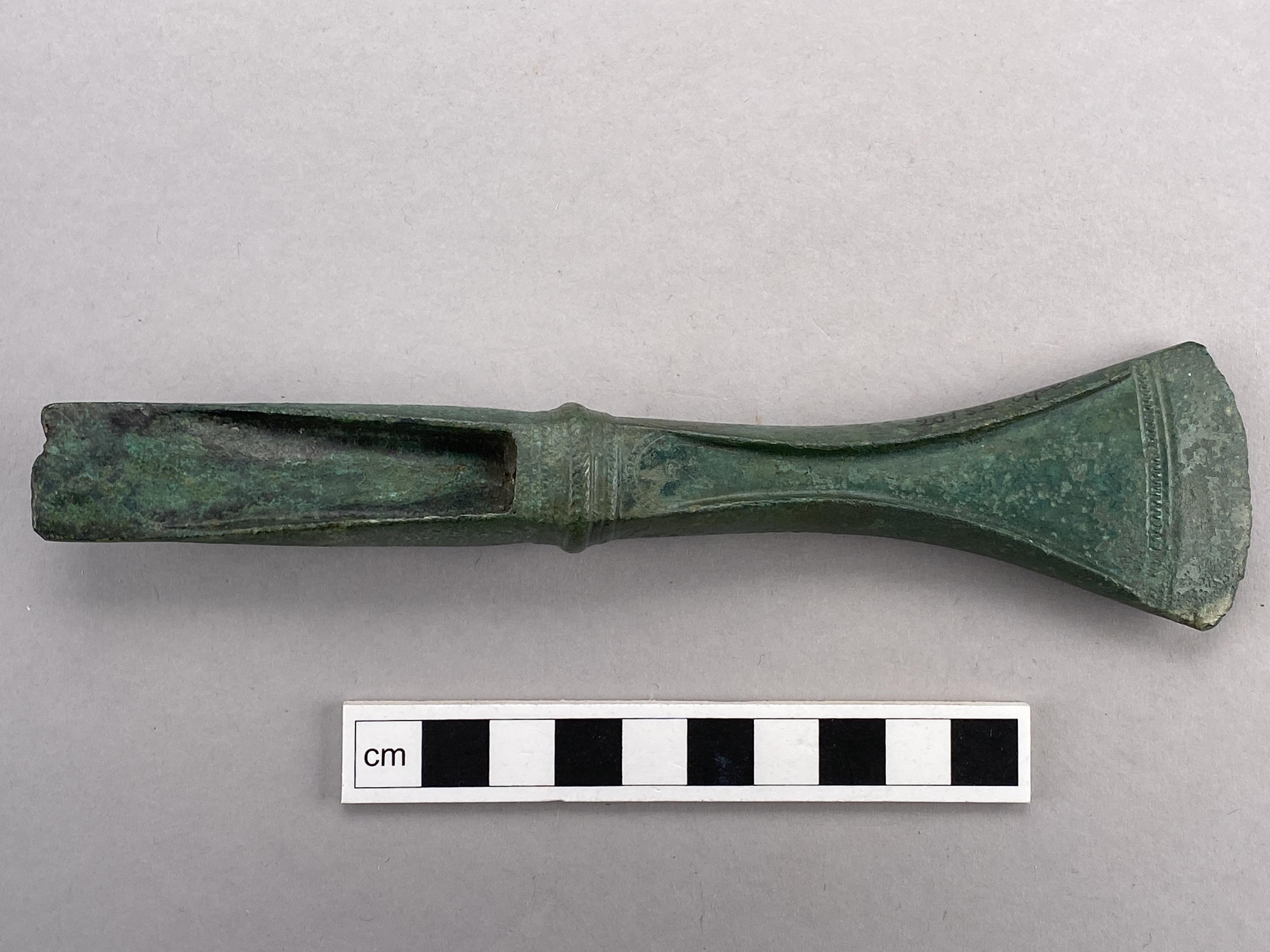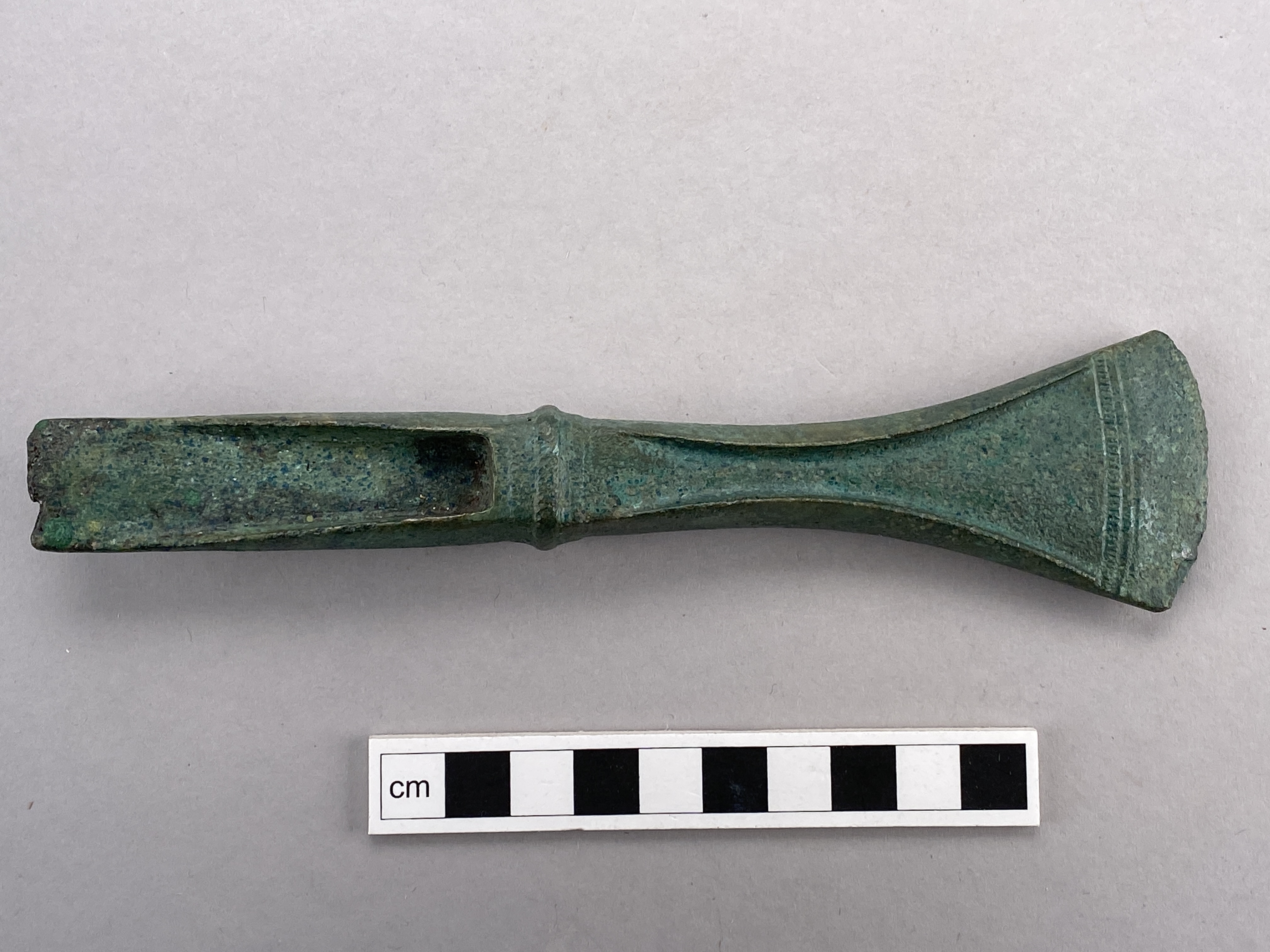 Avsatsyxa av brons. Avsatsen är ornerad med streckade vulster medan eggen är ornerad med en streckad zon. På smalsidorna finns inpunsade spiraler.