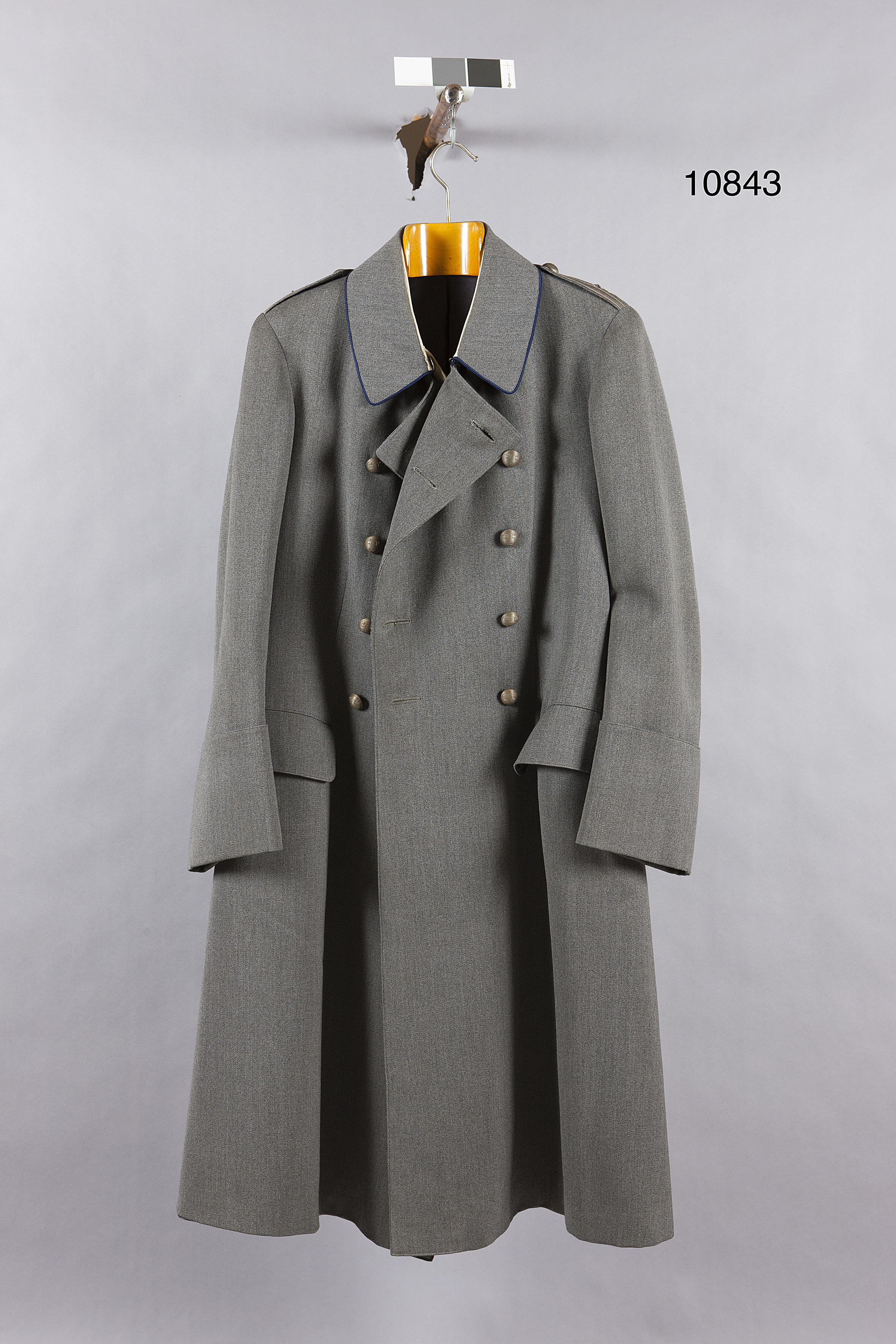 Kappa av grå diagonal, tvåradig med fällkrage. Varje knapprad med fem grå knappar på insidan med firmamärke: "C.C. SPORRONG & Co, STOCKHOLM", d: 22 mm. Fickor med lock, v. ficka med genomgående hål (för sabelbärrem). Ärmuppslag 140 mm breda. Axelklaffarmed broderad vit arabisk 1, en stjärna av silver samt en smal silvergalon utmed kanten. Utmed kragens kant blå passpoal. Foder av tjockt mörkgrått siden, två innerfickor. I den högra firmamärke: "Solberg & Hultgren // 13 10 Stockholm 26 // Herr Löjtn. Greve // F. Bernadotte." På kragens insida vitt kläde med sju tryckknappar (för fästande av pälskrage). Ärmfoder av grönaktigt siden. Då kappan syddes tillhörde F. Bernadotte Livregementets dragoner vilka efter 1 jan. 1927 sammanslogs med Livregementets husarer och Livgardet till häst till Livregementet till häst.