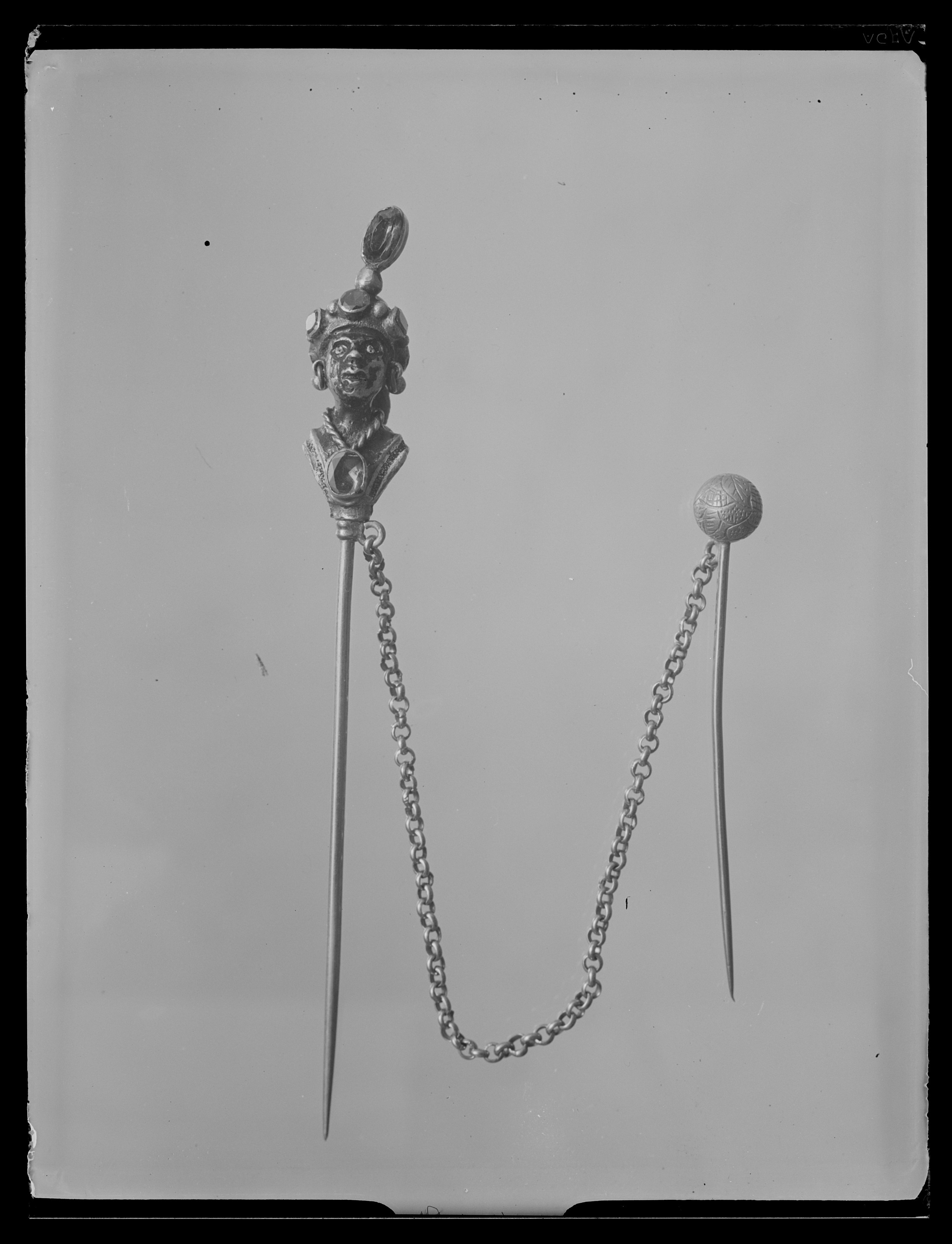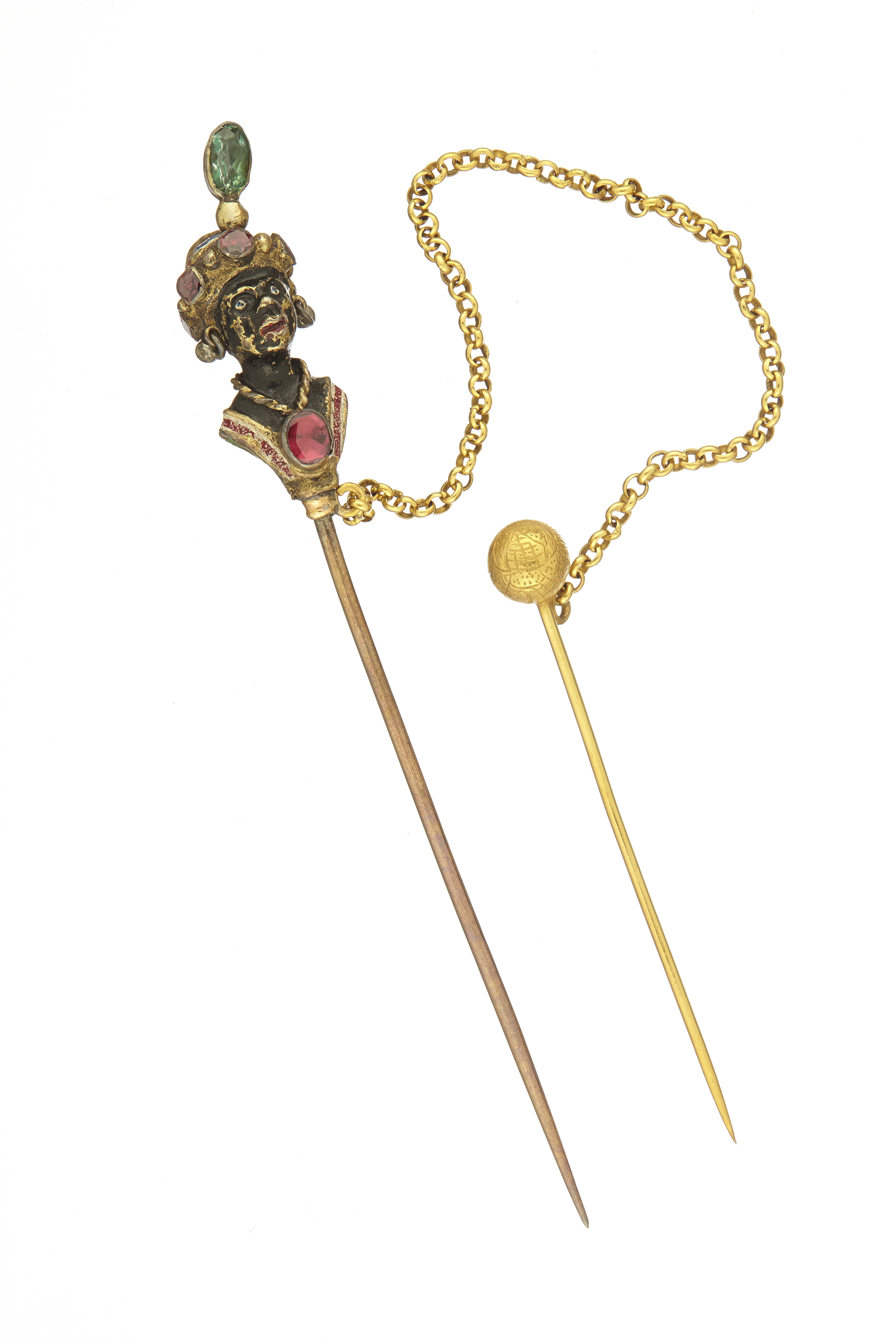 Huvud i form av en byst av en turbanprydd morian, h: 31 mm, av guld, täckt med svart emalj, guldturban med blå emaljrand, längs kanten sex fasettslipade rubiner i slät fattning, på turbanens hjässa en rund månsten. På en agraff framtill en oval, fasettslipad smaragd, i kedja om halsen en oval rubin, i öronen ringar med silverkulor nertill. Dräkt med rosa emalj, på bystens undersida röd, grön och blå, spräcklig emalj. Rak nål av guld, l: 60 mm, upptill en ring, däri fäst en kedja av guld, l: 110 mm, i vars andra ände är fäst en mindre nål av guld, l: 52 mm, kulformigt huvud, d: 6 mm, graverat bladmönster.