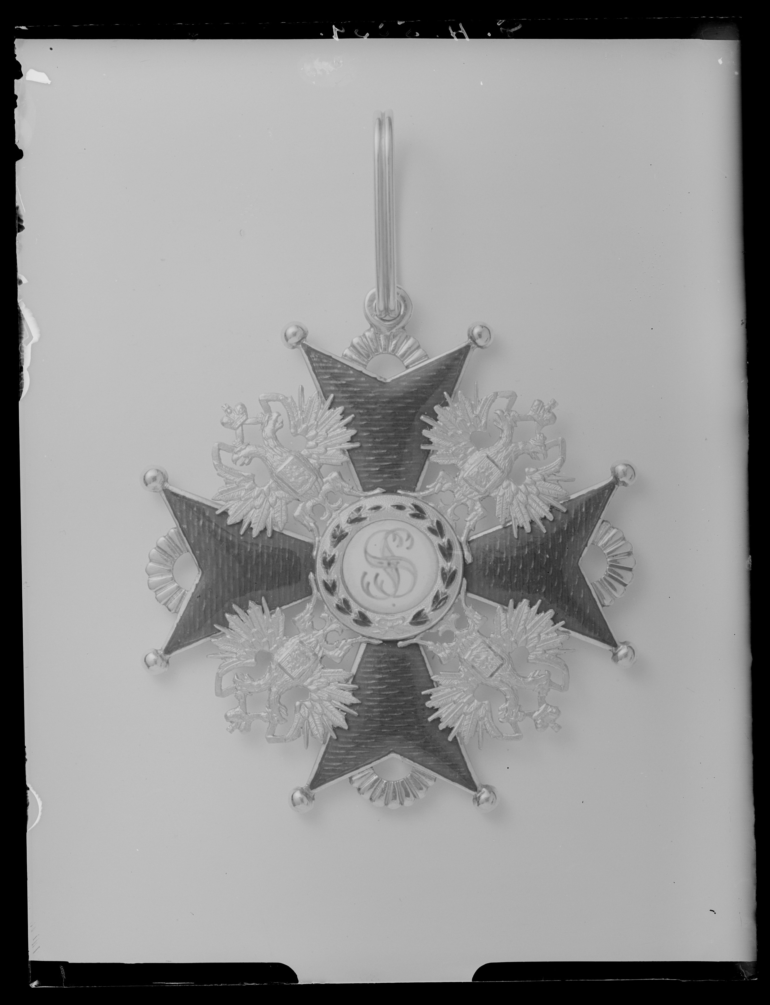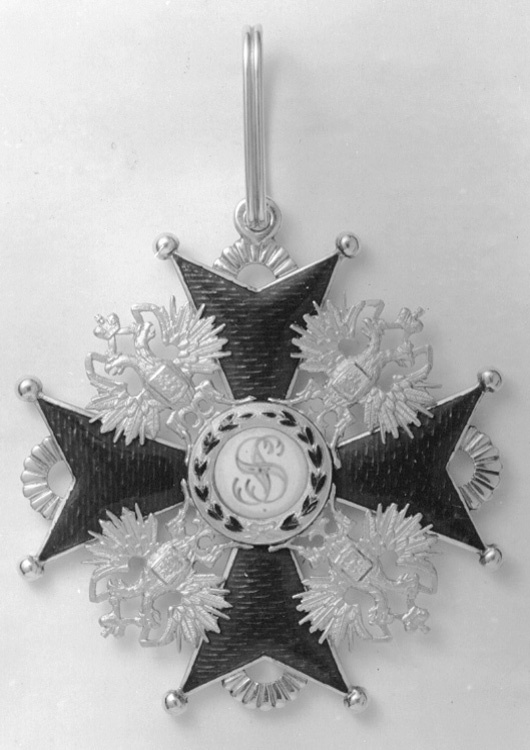 Rödemaljerat malteserkors av guld, kulor på spetsarna, mellan och delvis på armarna ryska dubbelörnar av guld. Vitemaljerad medaljong, därpå målat rött namnchiffer: SS. Däromkring guldring med grönemaljerad lagerkrans. Mellan korsarmarnas spetsar räfflade cirkelbågar av guld, åtsidans medaljong, på övre korsarmen otydlig stämpel. Vid den övre cirkelbågen fästring, däri fäst oval bandring av guld.