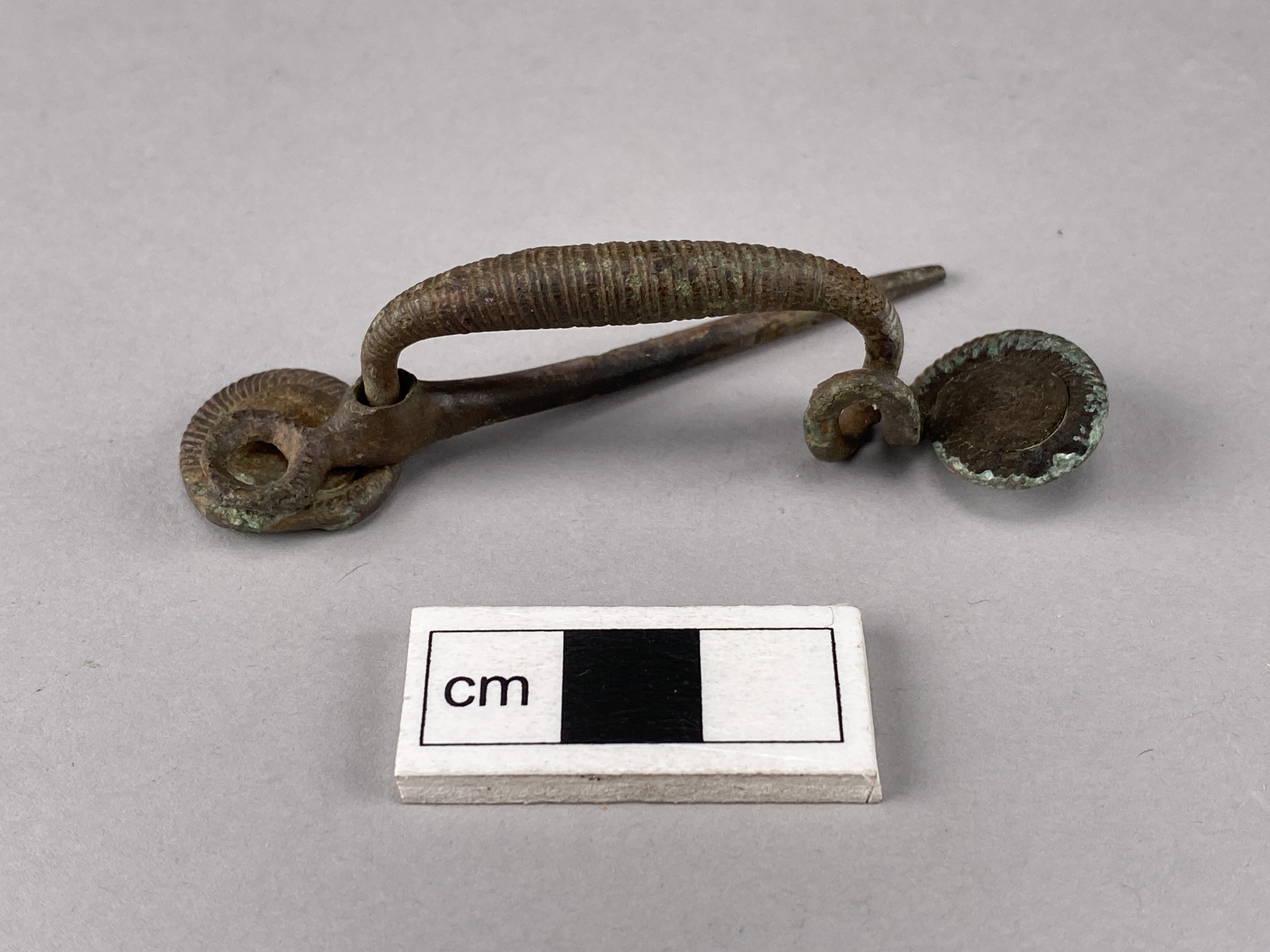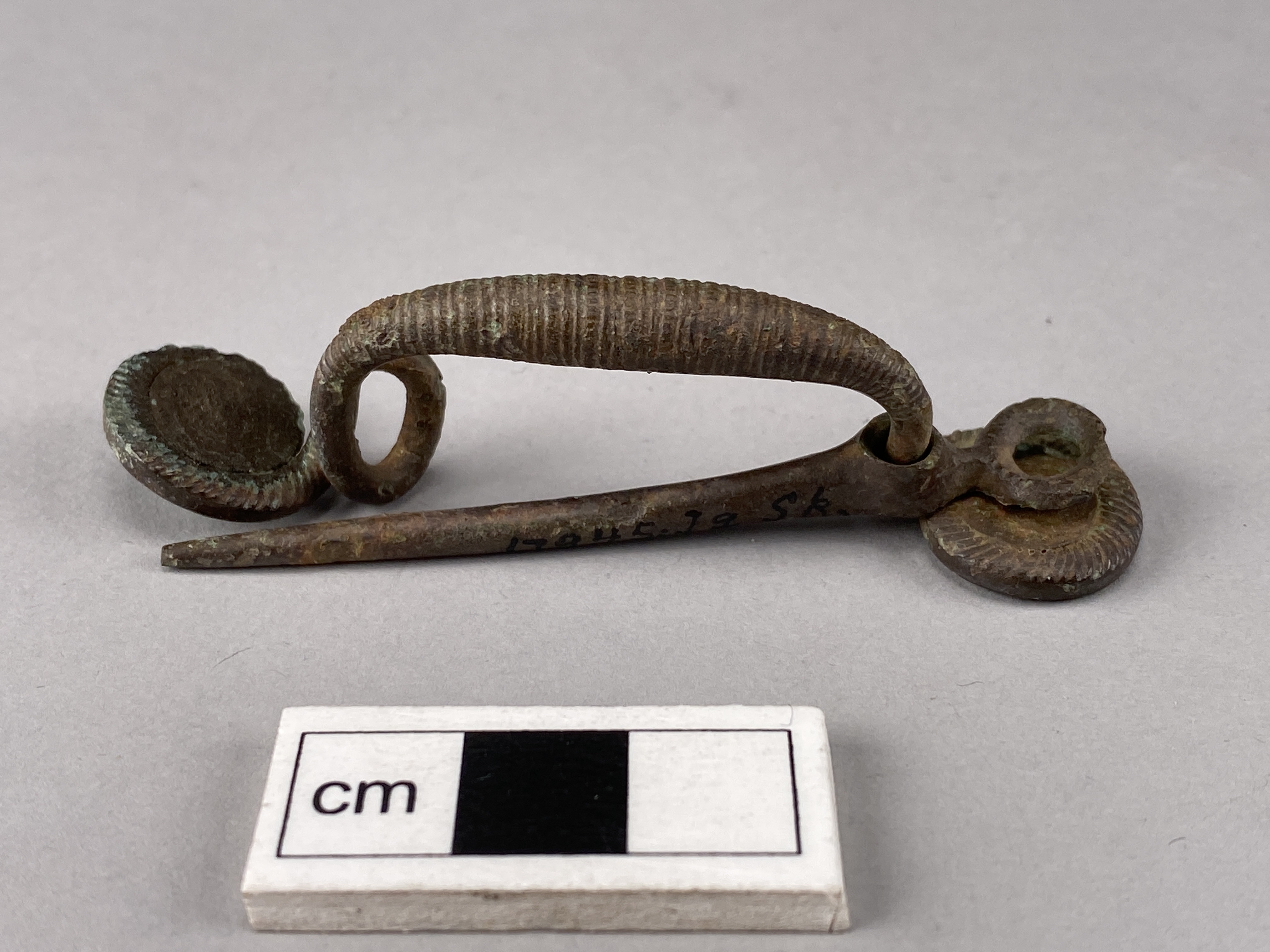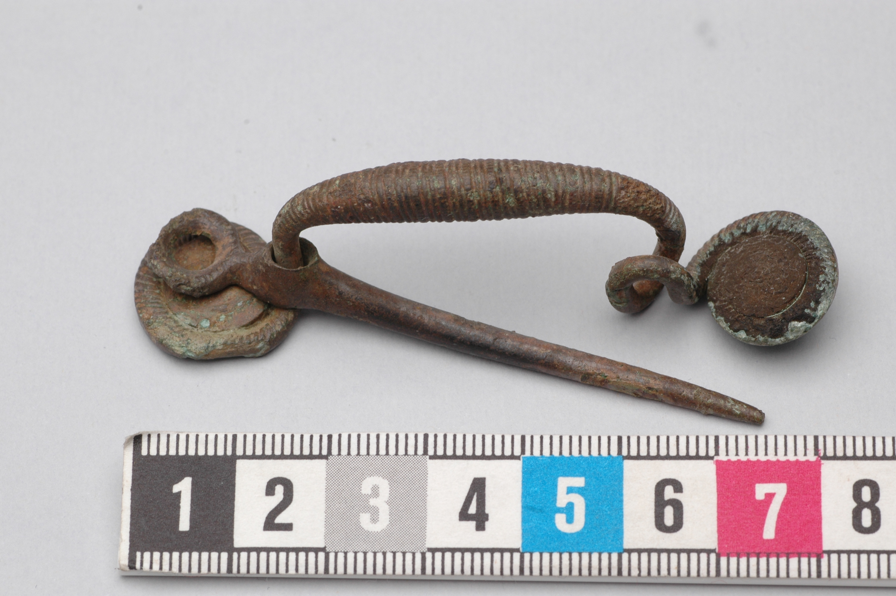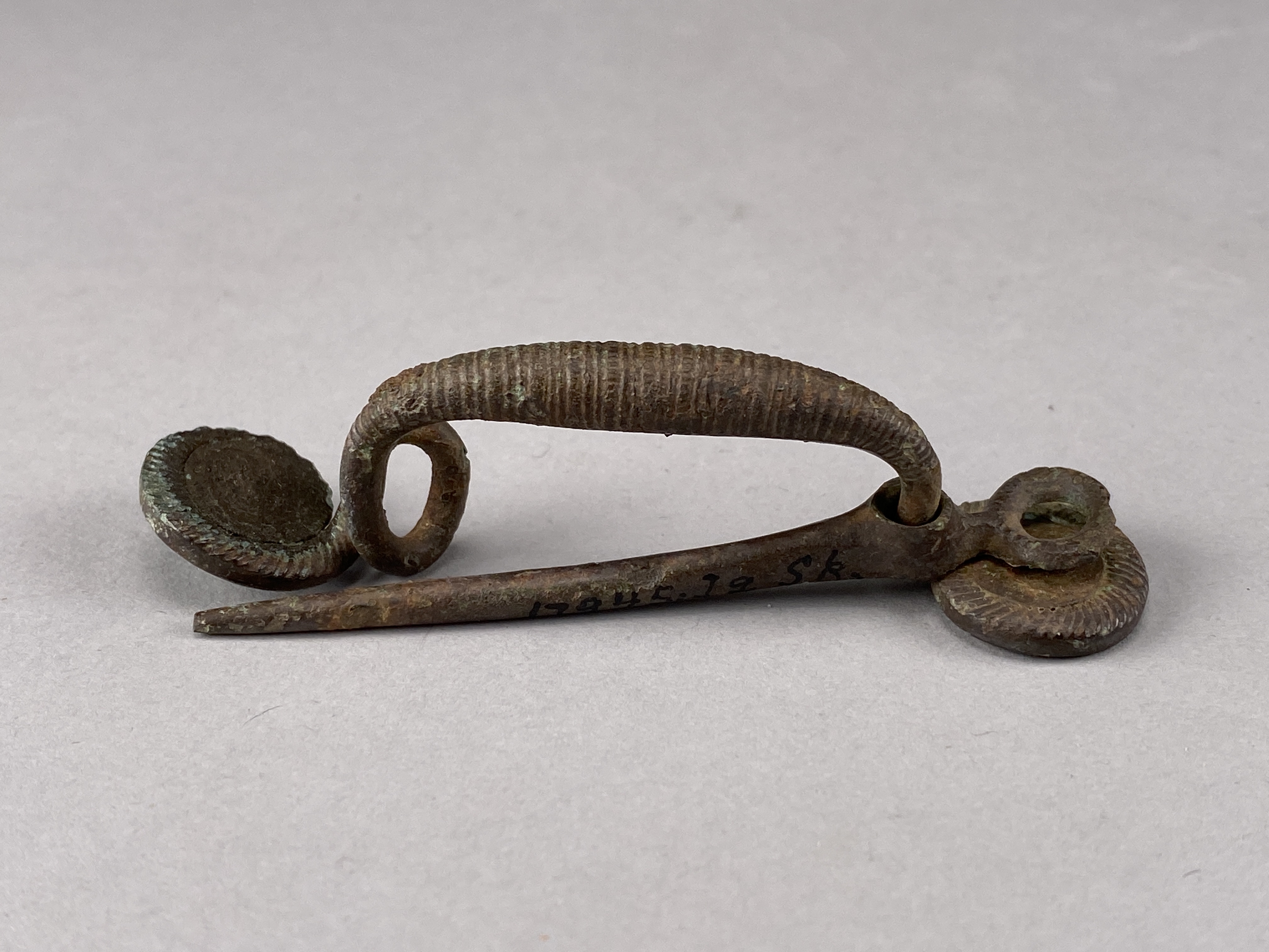 Spänne av brons. Ringformigt nålhuvud med längsgående arm. Tämlingen kort bygel, med punsad tvärräfflad ornering. Spiralskivorna är något tillplattade. Från grav 3 i hög I