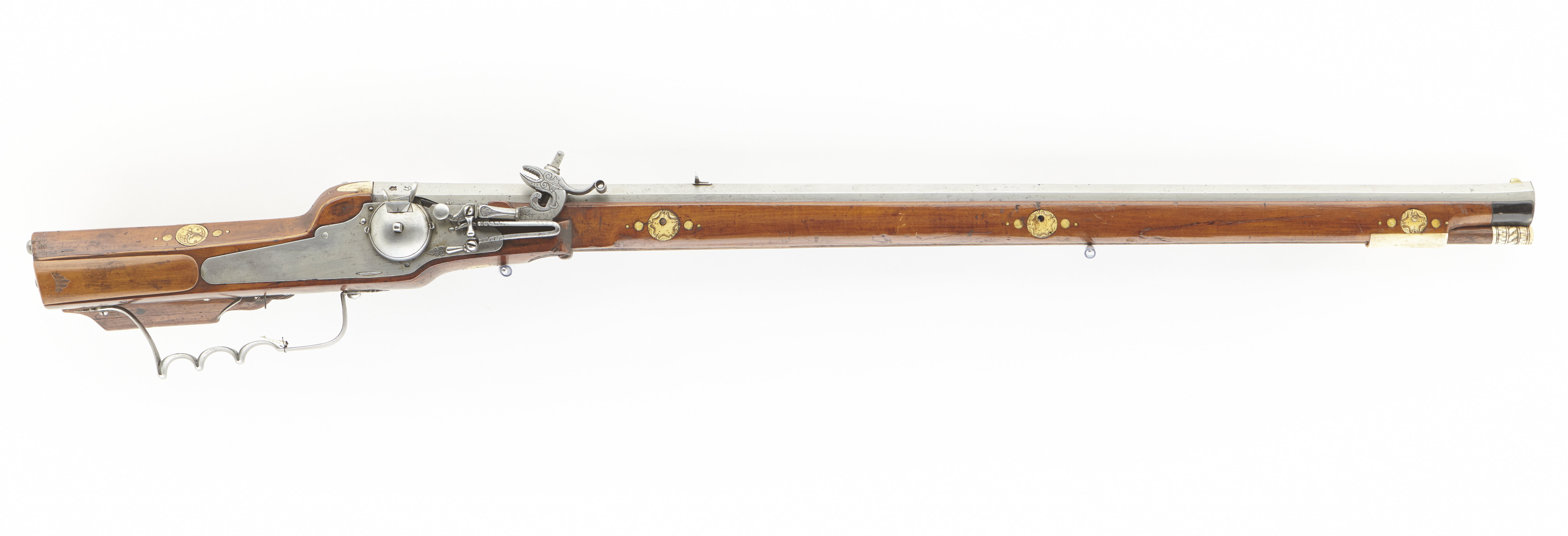 Åttsidig, tioräfflad pipa med trumf, kort, baktill tvärt avskuret svansskruvblad med graverad kanlinje vid änden. På kammarens sidofaser stämplar: S H (Stöckelnr 495) samt två sköldformiga stämplar (Stöckelnr 492-493). På båda sidor om siktet liksom bakom kornet ornamentsstämplar, framför sikte datering: 1630. På kammarens undersida stämplat 9 (eller 6) vid pipbasen. Riktmedel: 240 mm lång, framåt avsmalnande skålad siktränna från krysskruvens hål. Inlaxat ståndsikte av stål med graverad rankdekor på plattan, inlaxat stolpkorn av mässing. Fästning: Tre häften. Pipan fäst med krysskruv underifrån (främre varbygelskruven) samt ett pipstift av ben och ett av trä. Hjullås med plant låsbleck, rundad bakände. Utvändigt hjul täckt av välvd hjulkapsel i fas med ring fäst med små skruvar kl. 3 och 9. Fängpanna med fasetterad gavel, låg, svag böjd eldskärm med rundad överkant. Fängpannelock med styv arm, litet, skivformigt grepp med rundad överkant. På låsbleckets överkant fastskruvad täckplatta från fängpannelocket till låsbleckets framände, streckdekor. Tryckknapp med svagt välvd platta, balusterformig kropp. Hane med kort kropp, droppformig, plan, graverad yta baktill, framtill åsning, plan, graverad hals i form av öppen ring. Överkäken lös, läpparna svagt svängda, graverad-filad tanddekor, i mungipan palmett, uppåtsvängd arm med rörformig avslutning, käkskruv med fyrsidigt huvud, rundad överkant. Hanfjäder med fasade kanter, enkel bladdekor, fjäderlöv med lång, rundad fot och platt, liljeliknande, graverad spets, balusterformig hanstudel. Enkel, filad och punsad dekor på insidan. Samma stämpel 9 på insidan av båda käkar samt på käkskruven. Fästning: Två låsskruvar. Avtryckare med snälltryck på rektangulärt avtryckarbleck. Kraftig helstock av brunt trä, kolv av tysk typ med kolvlåda och vinge med volut, plan kolvrygg. Inläggningar och kantlister av ben och trä, många benplattor ersatta. På kolven kantlister av ljusare ben, inga lister på framstocken. Bakplåten saknas, stödkula av stål. Vingen delvis kompletterad, ristad korsskraffering. Vid bakänden på anslaget stämplad dekor av cirklar och streck. Ej ursprungligt, slätt kolvlådelock av trä utan dekor, skuret grepp i form av fem skålningar. På kolvryggen baktill två ersatta benplattor, den främre med rundad ände, därframför två runda plattor, en stor och en liten samt fyra i träet nedskurna skålningar av något olika längd, flankerade av stämplad dekor. Vid svansskruvbladet tre ersatta benplattor med rundade ändar bakåt, de yttre åtföljs av en liten och den i mitten av två olika stora benpunkter. Runda låsskruvbrickor med graverad blomdekor av något olika utförande, den främre har blomblad ut till kanten, den bakre har blomman innanför en kantring av punkter och ovaler, båda åtföljs av stora och små benpunkter. På kolvens undersida framför varbygeln en rund platta med ytterligare en blomvariant, åtföljd av benpunkter. Vid laddstocksnotens bakändenen fint skuren palmett. Pipstiftbrickor med blomdekor somt täcker hela plattorna, alla åtföljda av en stor och en liten benpunkt på vardera sidan. Slät, odekorerad, ersatt topprörka av kraftigt ben, näsband av mörkt horn. Varbygel med tre fingerlägen, profilerade löv i båda ändar. Tillbehör: Laddstock av mörkare olackerat trä, l: 930 mm, i framänden en enkelt graverad benskoning, l: 32 mm, i andra änden ett invändigt gängat stålrör, l: 110 mm.