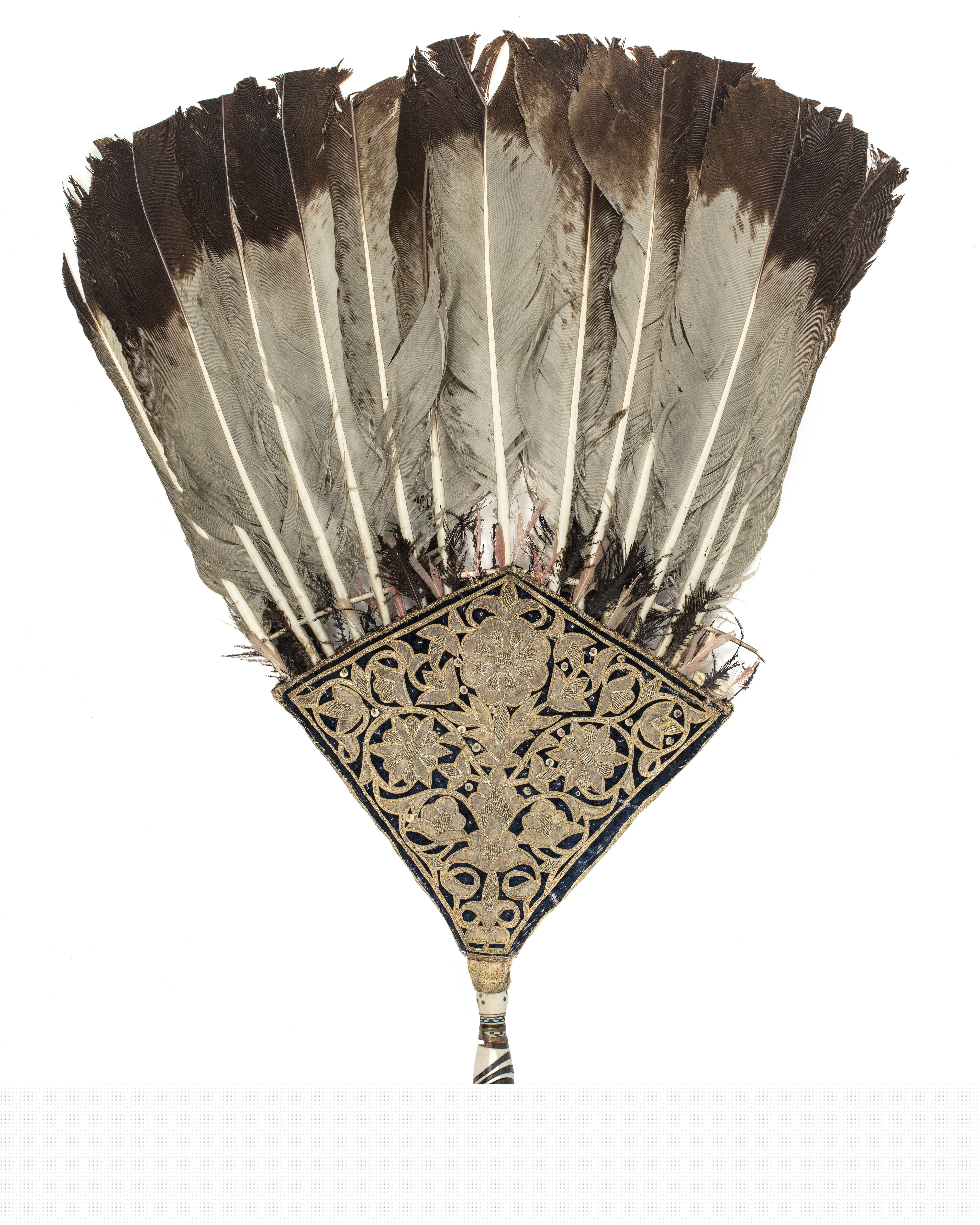 Solfjädern har ett svarvat skaft i vitt ben (elfenben?) med spiralformade intarsiainläggningar i mörkt trä, även mindre svarta inläggningar på skaftet. Skaftet går sedan upp i ett rombformat handtag av pressat skinn i två lager, klätt med svart/mörk blå sidensammet. På sammeten är det broderat med metalltråd(antagligen ursprungligen förgyllt), mellan broderiet och sammeten ligger ett lager av figurskuret skinn. Delar av metallbroderiet är gjort av kantiljtråd. Det finns även förgyllda paljetter i broderiet.På undersidan syns resterna av någon typ av lim/stadga material. Mellan de båda lagren av skinnhandtaget sitter solskärmens "skärm", denna består av strutsfjädrar? dessa är färgade längst ut vid spetsarna. Gåva till drottning Ulrika Elonora d.y 1731 från dejen Abdi Pascha av Alger. Samtidigt fick Fredrik I två berberhingstar och ett sto, två strutsar, en bössa och ett par pistoler samt fyra svenska slavar.