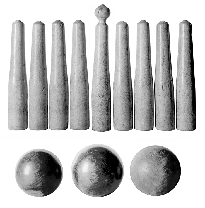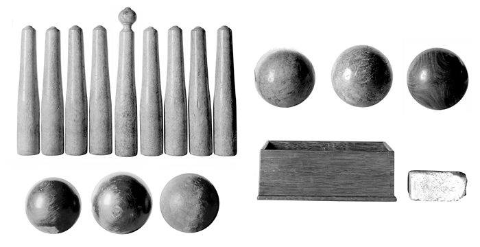 KÄGELSPEL Bestående av nio käglor (en sats), sex klot samt en kritlåda. Käglor (kung och åtta gemene): Av masurbjörk, svarvade, nedre delen cylindrisk med skålformigt urholkad botten, övre delen konisk. Kung, höjd: 54,6 cm Gemene, höjd: 47 cm Diameter: 8,4 cm Klot: Tre stycken av pockenholts, två av masurbjörk och ett av furu, alla svarvade. Klot av pockenholts, diameter: 18, 21 och 23 cm Klot av björk, diameter: 17 och 18,2 cm Klot av furu, diameter: 22 cm Låda (till krita): Av ek, polerad. Rektangulär, med sinkade hörn. Höjd: 8,5 cm; längd: 23,7 cm; bredd: 16,8 cm Käglor och klot utförda efter beställning av Walther von Hallwyl hos Lundell & Zetterberg, Lager av utländska träslag för snickeribehov, Stockholm. Lådan utförd efter beställning av Wilhelmina von hallwyl hos snickaren C H Benckert J:r, Stockholm.