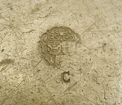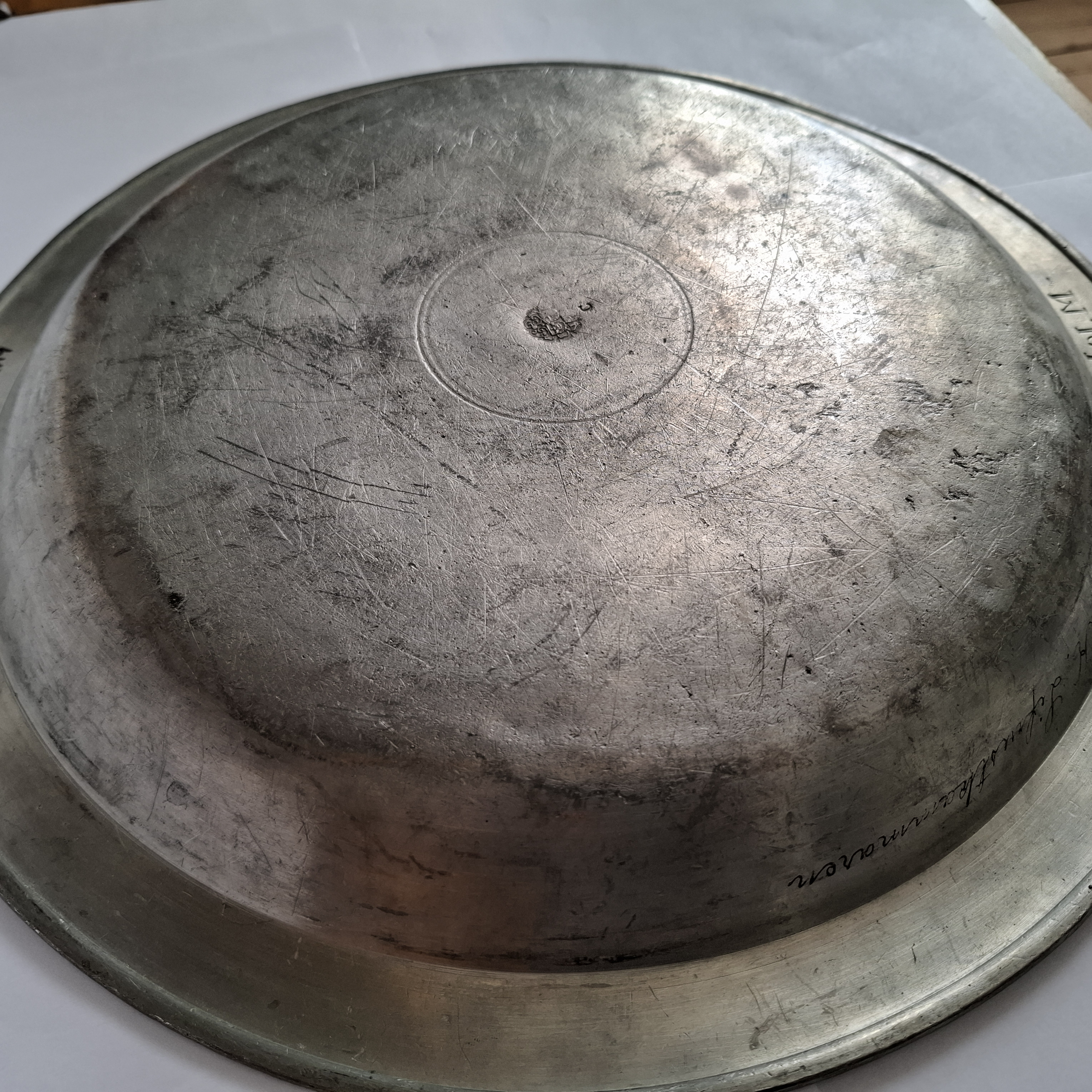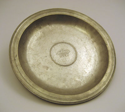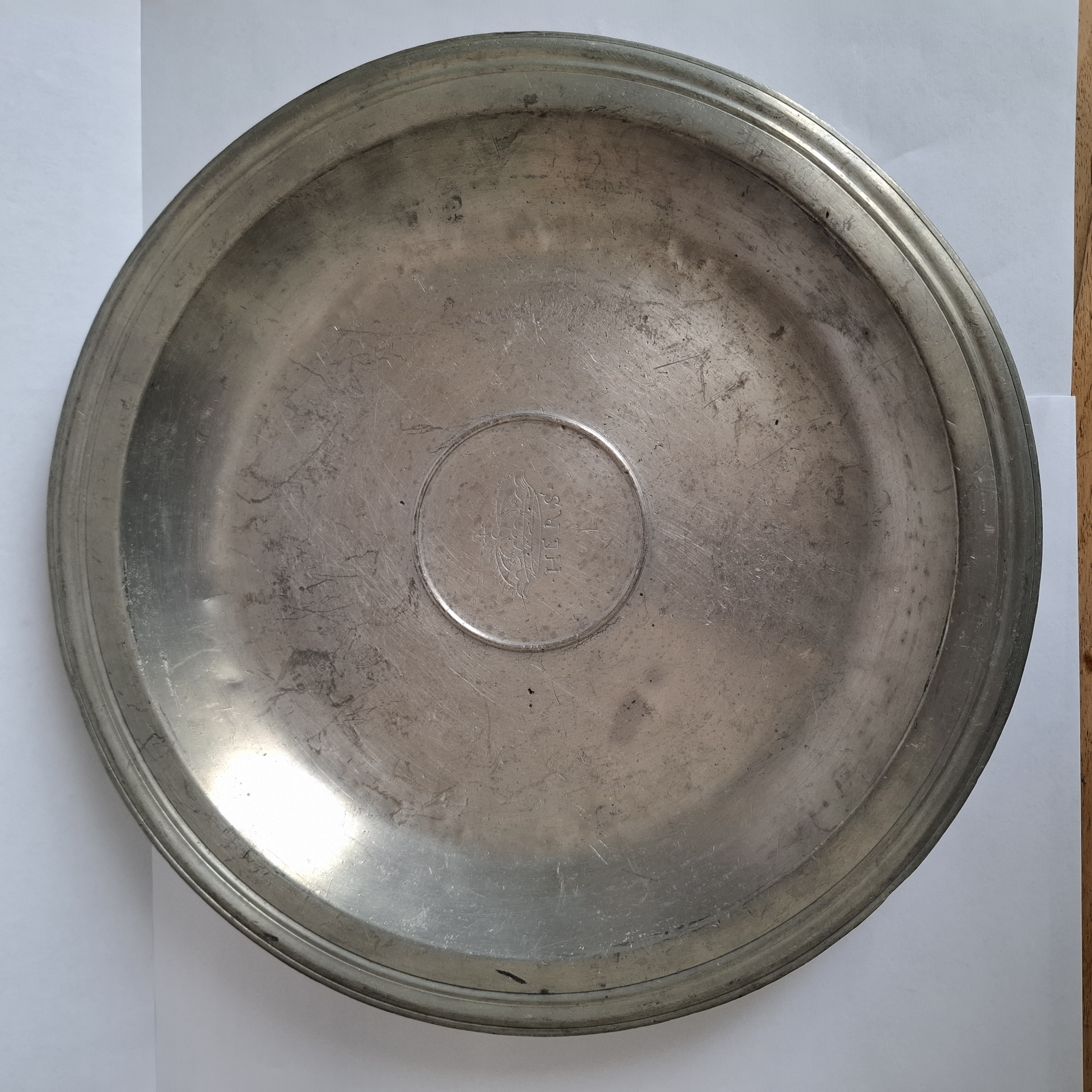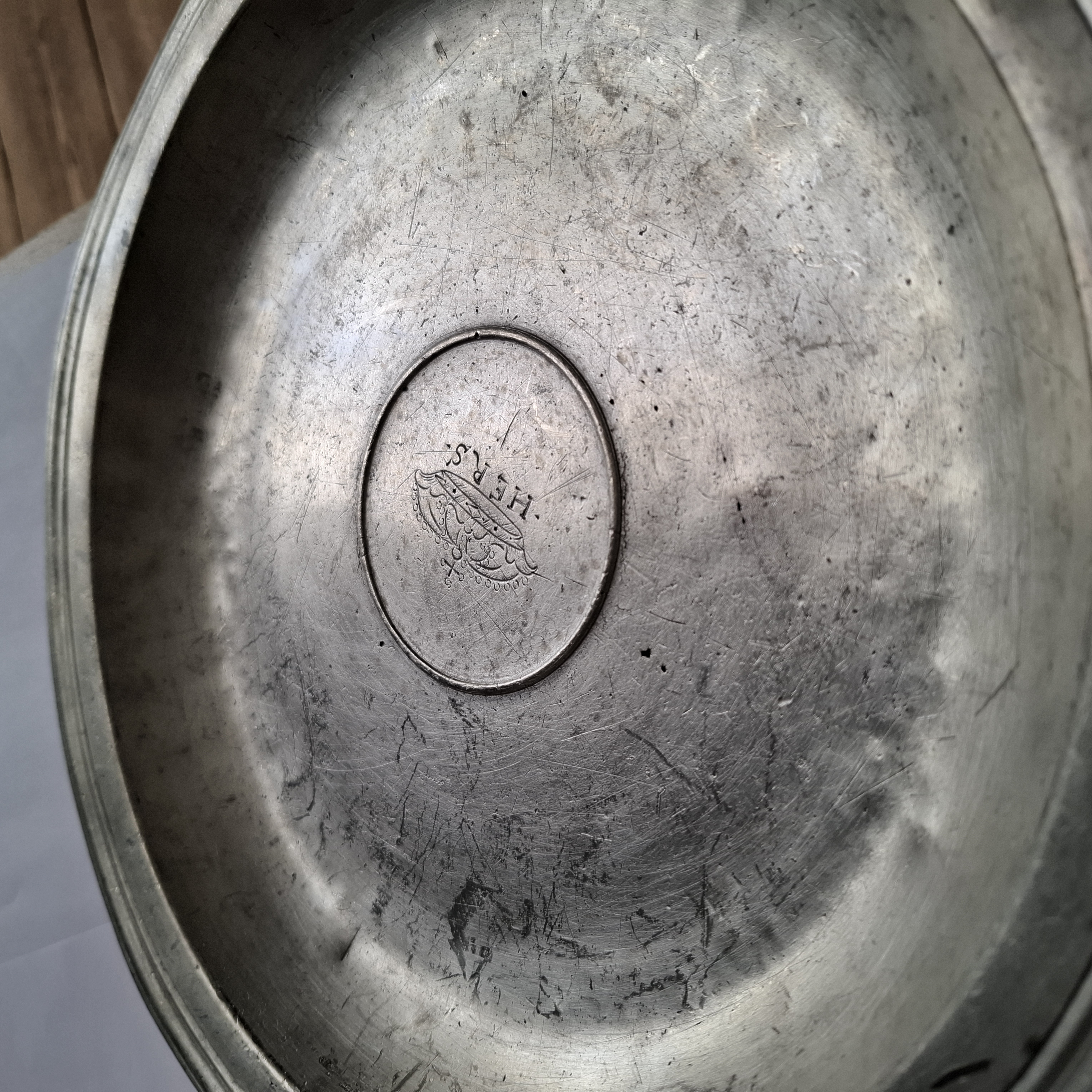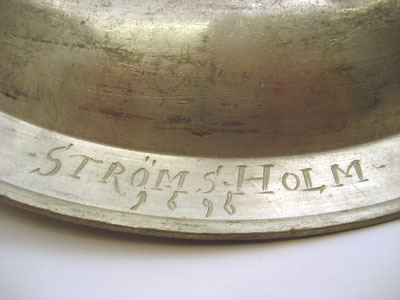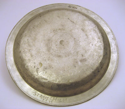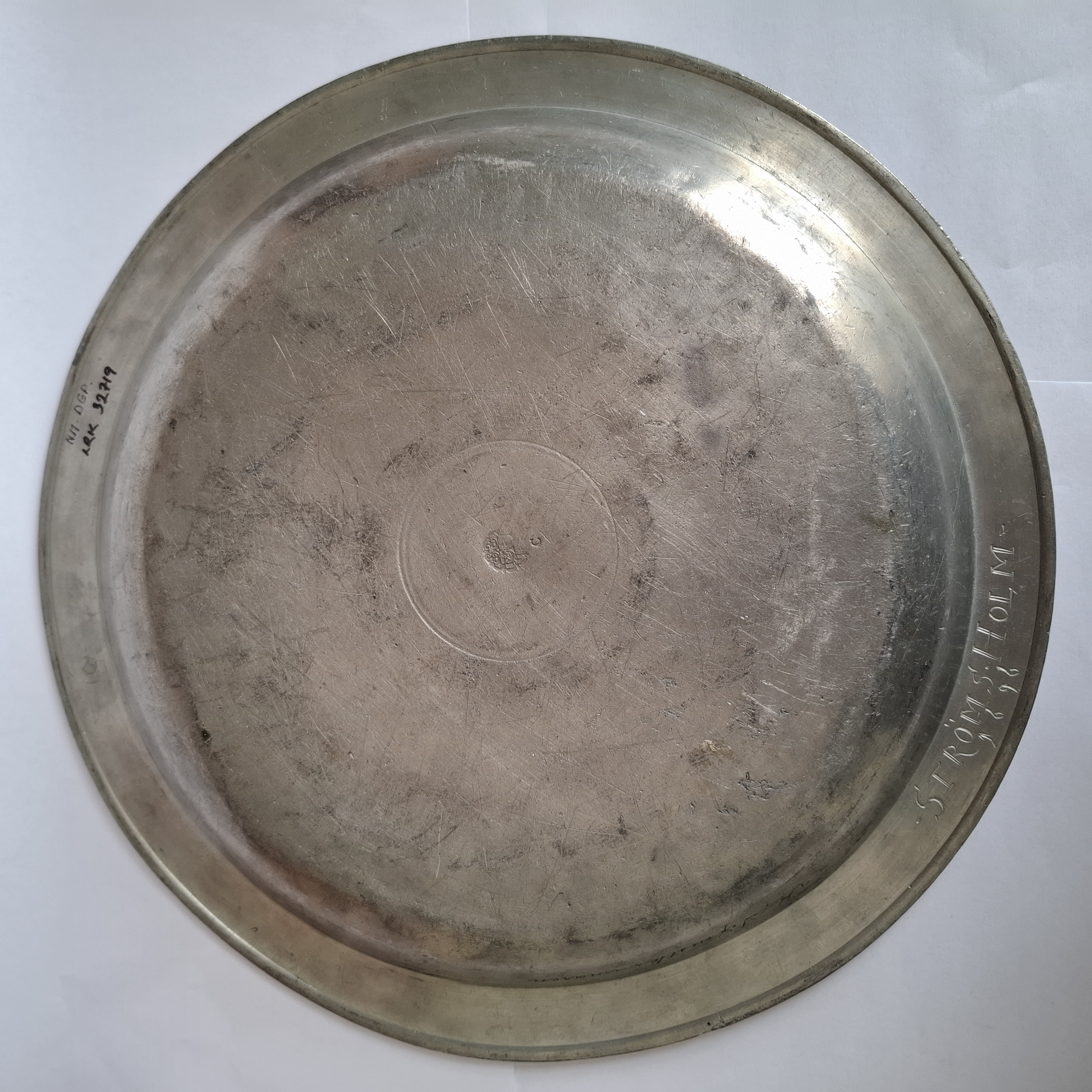 Utfört av tenngjutaren Johan Johansson, mästare i Stockholm 1677-1715. Ingår i Strömsholmsservisen. Ytterligare delar finns bl a på Nationalmuseum och på Nordiska museet. Runt tennhandfat med profilerat brätte. I spegeln en upphöjd koncentrisk cirkellist. I mitten av denna graverat med ägarinitialer "HERS" (Hedvig Eleonora Regina Sueciae) under kunglig krona. På brättets undersida graverat "STRÖMS HOLM // 1696". Kombinationsstämpel (A 73 i Bruzelli och känd i Johan Johanssons produktion sedan 1679, enligt samma källa). I kombinatinsstämpeln följande trestämpling: 1) 2) Antikvaversalerna II flankerande huvudet på en man med ceremonistav i normalsköld. 3) Stockholms stadsstämpel i form av öppen krona (Bruzelli A 77?)