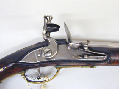 Rund, slätborrad pipa med åttsidig kammare, kanterna framtill fasade, vid övergången till den runda delen samt 45 mm därframför en dubbel, filad ring. Svagt böjt, bakåt breddat och tvärt avskuret svansskruvblad. Riktmedel: Skålat sikte på svansskruvbladet, stolpkorn av mässing. Fästning: Ett, urspr. två häften, det främre saknas. Framför det bakre laxning för ett äldre häfte. Pipan fäst med krysskruv ovanifrån samt ett pipstift av stål. Flintlås med plant låsbleck med fasade kanter, försänkt bakspets. S-formigt svängd, platt hane med fasade kanter, lös överkäke, päronformigt käkskruvhuvud, profilerad hangren. Rundad fängpanna med mjuk övergång till falsen, markerad gavel. Batteri med fasad eldstålsrygg, komma-formig häl. Batterifjäder utan studel, svagt fasade kanter, treflikigt, blånerat (?) fjäderlöv. Fästning och avtryckare: Två låsskruvar. Avtryckare med upprullad ände. Ovalt avtryckarbleck av stål. Helstock av valnöt, avkortad, snidad treflikig blomma vid svansskruvbladet. Bakom sidblecket stämplat P DS krönt av sluten krona(?). ,Beslag av förgylld mässing. Kolvkappa med ovalt tvärsnitt, långa flikar, släta kantlister samt graverad blomdekor. S-formigt svängt, plant sidbleck med fasade kanter. Två profilerade rörkor, slät spets. Slätt, ej ursprungligt näsband av oförgylld mässing. Välvd varbygel med bakre arm till kolvänden, främre, åtta-formig arm avslutad med treflikigt blad. Tillbehör: Laddstock av trä, l: 240 mm, framtill skodd med horn, l: 20 mm.