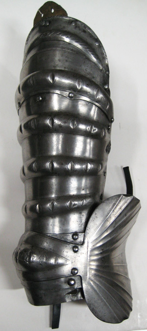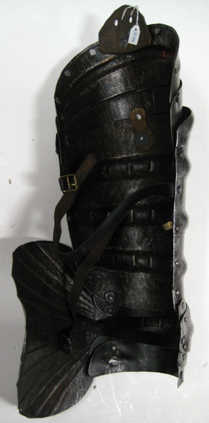 Driven stålplåt, sammanlagt sju delar. Över låret en större plåt med upptill två skenor, rörliga via avlånga spår i mitten, den nedre även i sidorna. Plåten har fyra slitsade puffar varav den översta består av en lös plåt nitad vid den större. Ytterkanten omvikt inåt och därunder en 15 mm bred ås, bägge med dekor av snedställda linjer. I mitten läderstycke med två hål för rem. Knäbuckla, B 80 mm på mitten, med horisontell slitsad puff. Åt utsidan en oval mycket stor mussla med strålformig räffling och insvängd mitt. H 208 B 150 mm. Över bucklan en skena och under två, den nedre med nyckelhåls-hål i sidorna. Mot insidan mässingssöljor och mot utsidan svärtade läderremmar. Söljan på musslans insida är av svärtat stål med filade flikar på ramen. Fäst i sämskad läderbit. Nitskallen platt med i mitten i relief utförd sjärna omgärdad av prickar.