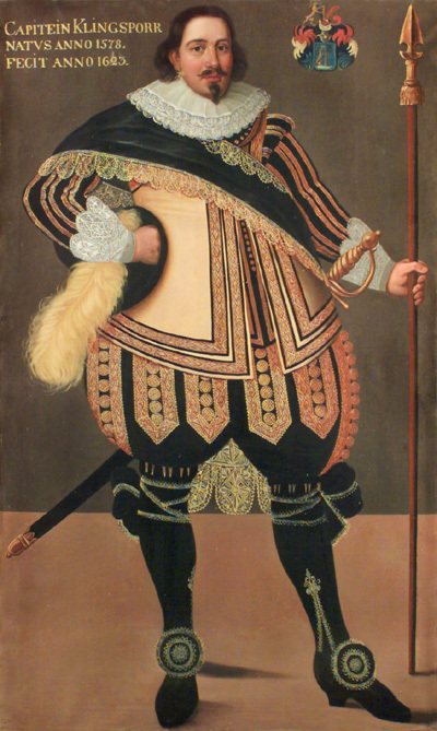 Porträtt av Johan Klingspor, född 1587, kapten (tidigare kallad Ernst Klingspor, 1578-1636). Stående, helfigur, fas höger, höger hand i sidan, håller plymagerad hatt, i vänster hand sponton. Svart jacka och pluderhosen med guldgaloner. Gult kyller. Svart bindel, värja, svarta strumpor och skor. Inskrift i övre vänstra hörnet: "CAPITEIN KLINGSPORR NATVS ANNO 1578. FECIT ANNO 1623". I övre högra hörnet vapensköld med hjort med frambenen lyfta mot ett träd. Kopia efter ett original från 1623. Spännram. Insatt i väggfält.