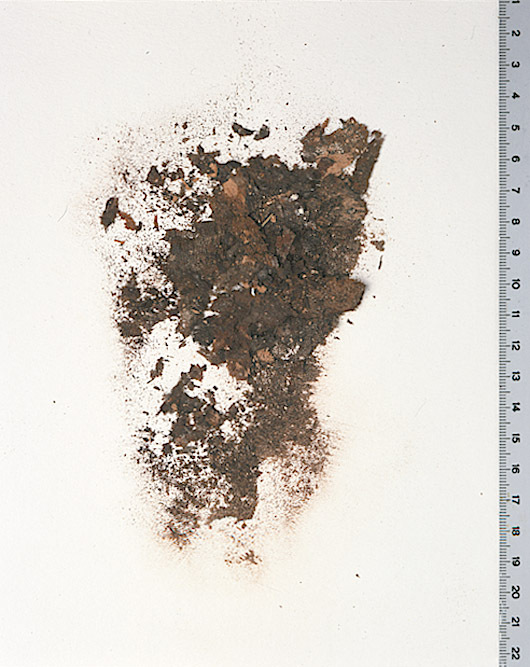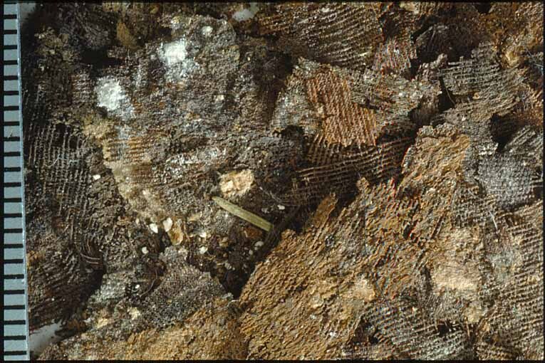 Fragment av varprips, sannolikt mantelrester, slöjan vid höger sida om huvudet. Fragmentet ingår i en samling fragment tagna som prov ur drottning Kristinas kistavid gravöppningen den 13-14 december 1965. Varp: 2-trådigt silke med s-snodd. Trådtäthet: 68 trådar/cm. Inslag: Parallellt liggande fibrer utan snodd, grövre än varpen. Trådtäthet: 30 trådar/cm. Material: Silke. Teknik: Varprips, fr. gros de Tours. Kommentar: Vid fotodokumentationen hamnade hela fragmentet på golvet så därför kan damm o dylikt från golvet kommit med. Förmodligen samma som 32971, 32972 och 32980. Nuvarande färg är brun