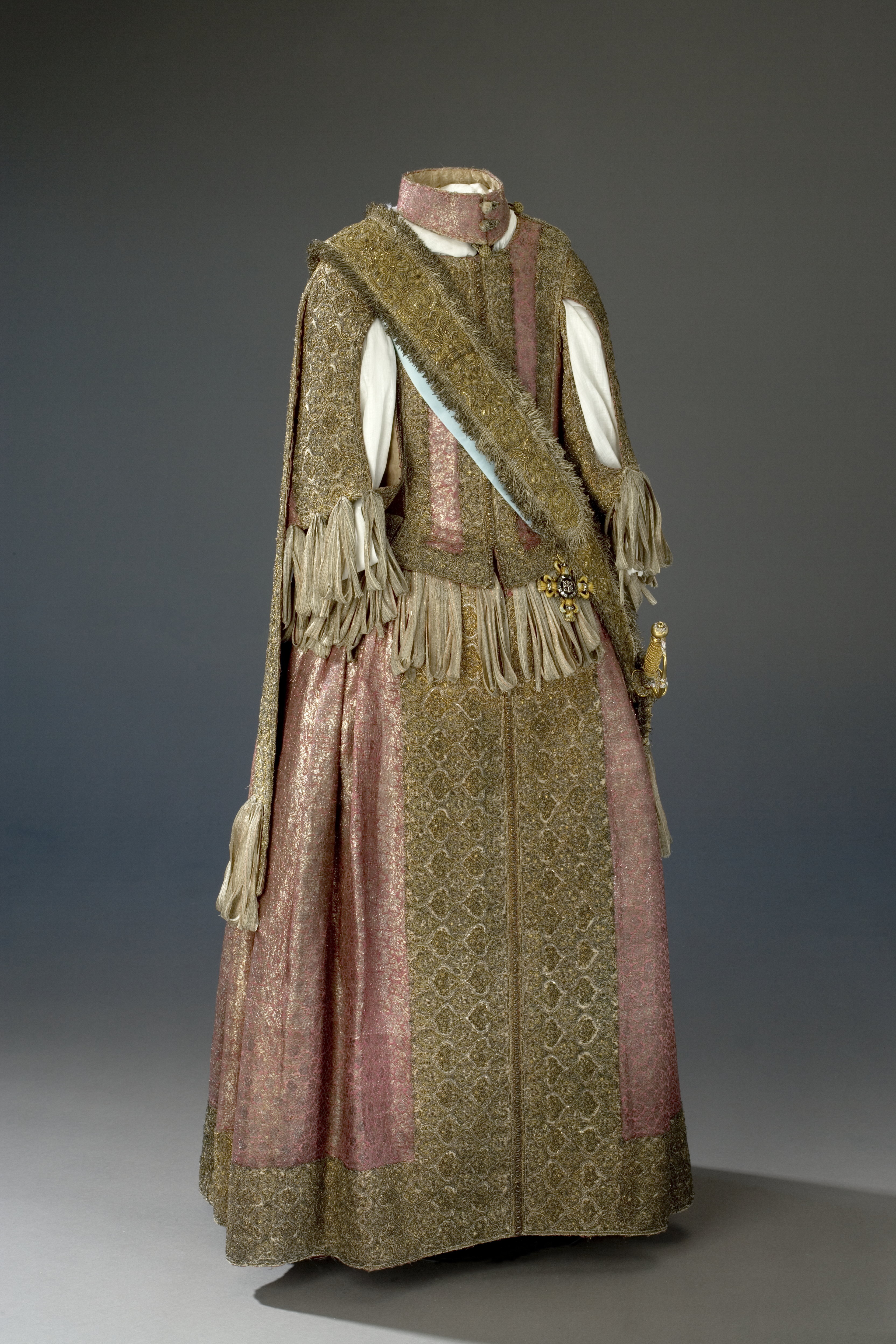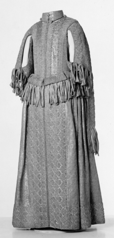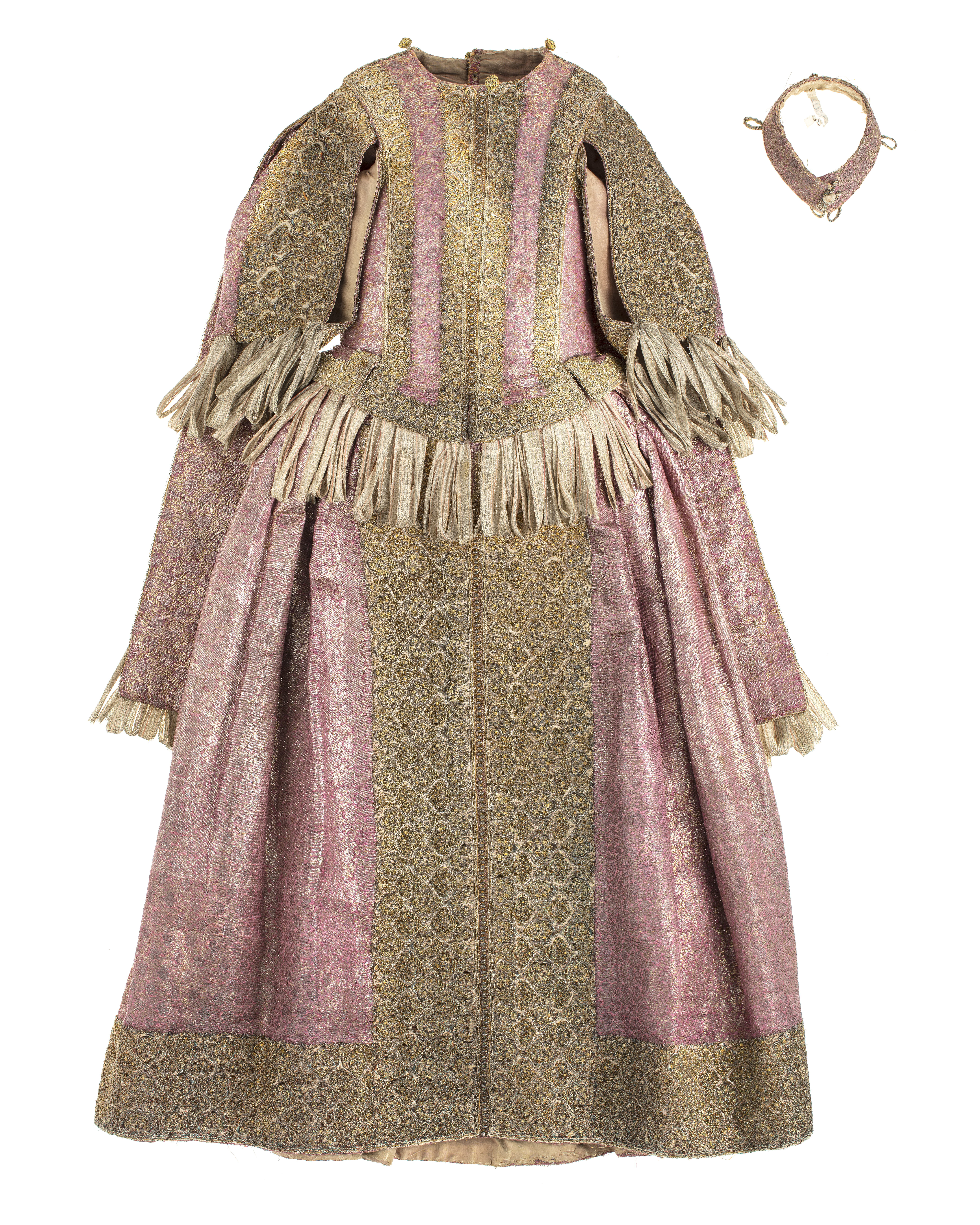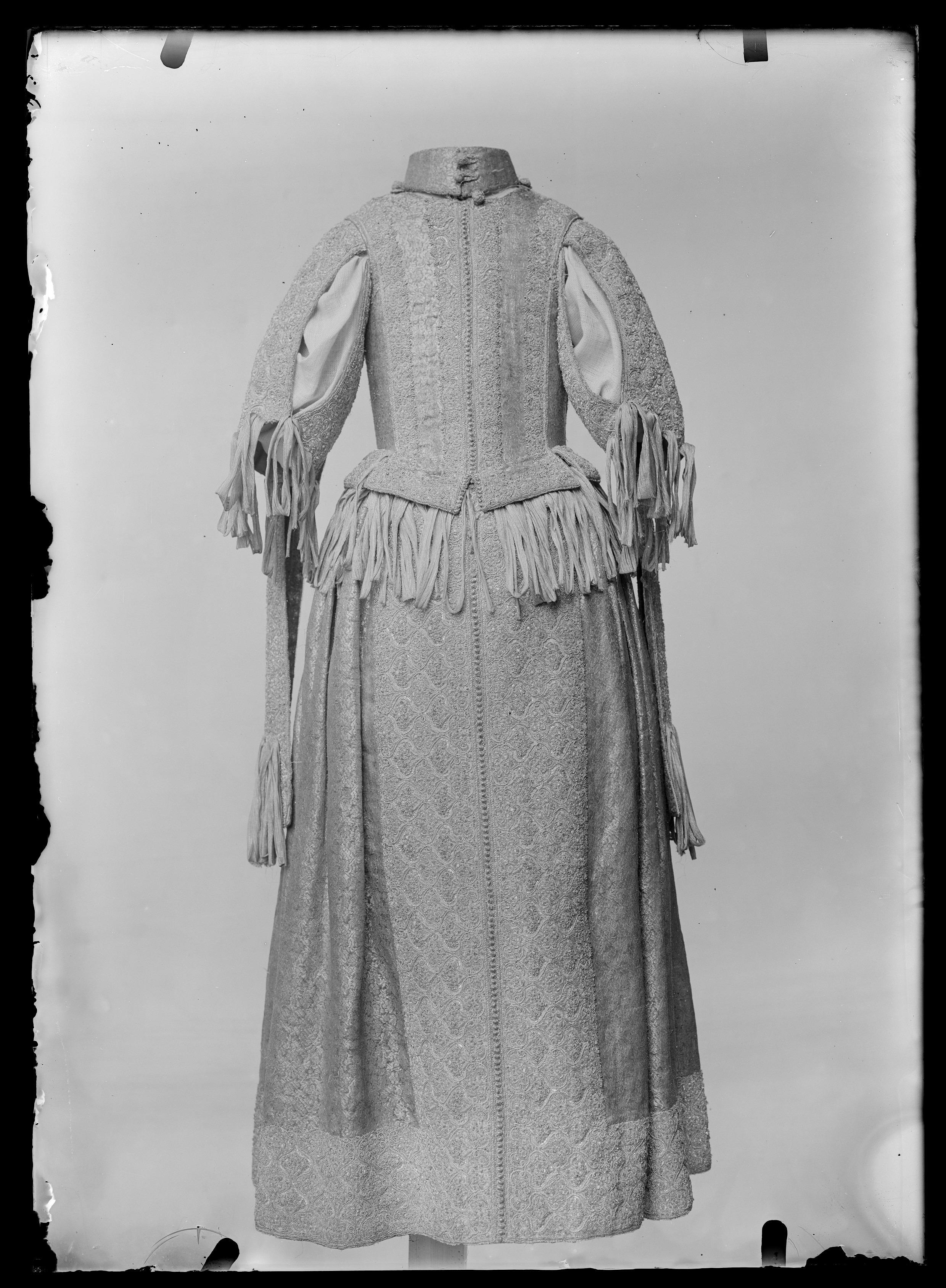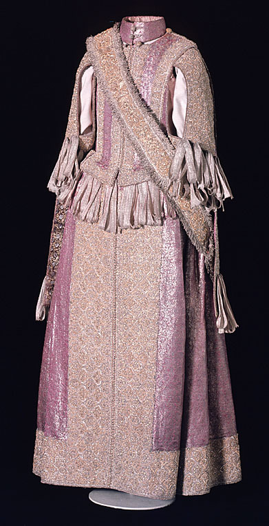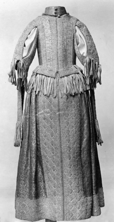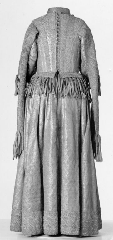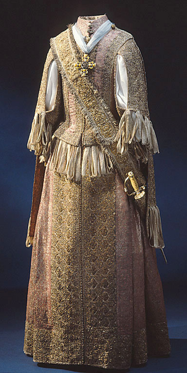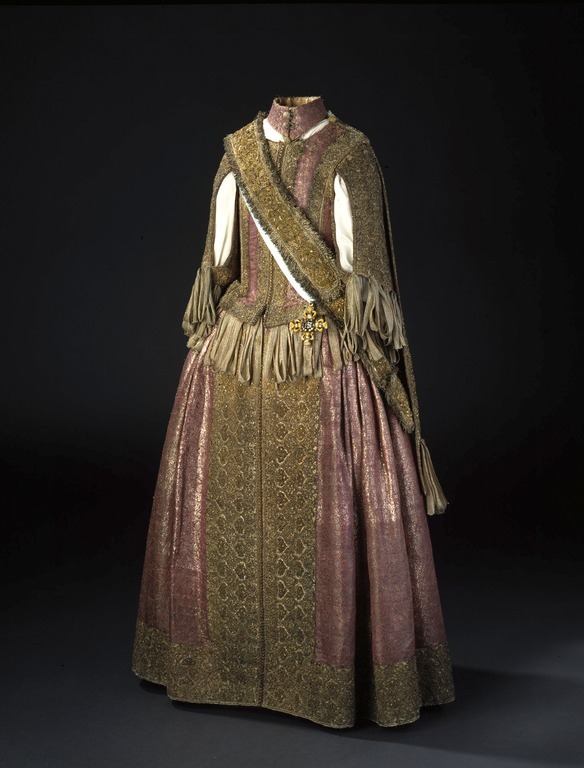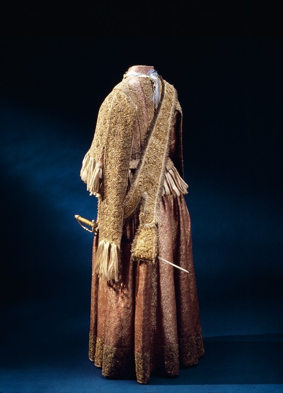 Klänning av purpurfärgad gyllenduk med bårder av silver? och guldbroderi (silverblommor l lövverk av guld). Höjd från axel och ned 95 cm. Lös ståndkrage höjd fram 4,5 cm. bak 3 cm. Klänningen består av ett markerat 30 cm långt liv med 6 små skörtflikar. varav de 2 främre gå i ett med framstycket. Kjolen som börjar framtill i midjan är här 64,5 cm lång och bak 69 cm. Den lösa ståndkragen är fastknäppt med 4 knappar (fram. bak och en på varje axel) av trä. Ursprungligen knäpptes kragen framtill med 2 knappar men den ena har fallit bort. På kragen finnas 5 öglor för fastsättning. Kjolen är i nederkanten broderad med en 9,5 cm bred bård, mitt fram äro 2 sådana bårder broderade vertikalt från midjan och ner till kantbården. Kjolens omkrets nertill är 237 cm. Kjolen är sydd av 5 st. 45,5 cm breda våder (synlig vidd) ? 2 våder stöta mot varandra mitt fram. Mitt bak har kjolen ett 25 cm långt sprund från midjan (en våd har sprättats upp i mitten). I sidsömmarna ha 2 fickor med vardera 13 cm långt sprund passats in (underkanten av ficksäcken sitter 34,5 cm från kjolens nederkant). Livet har broderats med smalare bårder; fram c:a 5,5 cm bred med markerad mittrad. samt c:a 2.,8 cm breda bårder markerande falsk sidsöm från axeln och ner så att avslutningen bildas i de 2 främsta skörten. Livet snöres samman baktill med 16 snörhål (26 cm). Under midjeskörten löper runt hela midjan bandrosetter (silverband med rosa inslag) bildande 2 öglor och 2 band (tampar) i varje grupp. Bandöglorna äro c:a 12 cm långa (varje ögla = 6 x 12 :t 72 cm. Inalles är det 46 rosetter, som alltså dragit en ungefärlig längd band av 33,12 meter. ? Den flätade snodd av guld? och silvertråd som snör samman livet i ryggen är 102 cm lång och i ena änden finns den urspr. 2 cm lång "doppskon" kvar. De 2 korta ärmarna äro framtill öppna (längd fram 18,5 cm). De ha utefter de öppna kanterna. vertikalt broderade bårder som dräkten i övrigt. 7 st. rosettgrupper äro fastsydda nertill på varje ärm. Vid ärmarnas bakre söm äro 2 "hängband" (Flügelärmar) fastsatta. De äro 56 ? 57 cm långa (resp. V och H) och 9,6 cm breda. De äro broderade på utsidan såsom bårderna i övr. och på undersidan fodrade med gyllenduken. 8,5 cm från nederkanten har 3 grupper bandrosetter ) öglorna äro nu c:a 12 cm långa) fastsatts. "Hänghandens" främre sida börjar vid axelsömmen. Framsidan är något längre än den bakre, då sömmen är något sned. (Flügelärmarna äro en rest från det spanska dräkt modet. som eg. upphör omkr. 1625. Dessa kunde bara ifrågakomma när man hade styvt snörliv.) Klänningen är helt fodrad med purpurfärgad (nu blekt) taft. Troligen har samma tyg begagnats som grund för de broderade partierna. Fodrets vådbredd är 105 cm ( 62 varptr x 44 insltr/cm2. Skörtflikarna äro fodrade med taft. C:a 1.95 ? 2 cm under skört flikarnas fästsöm vid livet ha bandrosetterna sytts fast (26 bandgrupper runt midjan något ojämnt placerade). Under det V midjeskörtet baktill sitter en knapp. trol. placerad för värjgehängets skull. Den sitter cm från midjan , och 6,5 cm från sömmen mitt baktill. Knapparna äro små halvklotformiga träknappar med ett hål tvärs igenom, klädda med silver? och guldtråd. Diam. Höjd Å kjolens mittvåd baktill har man inte brytt sig om att öka i något stycke i midjan utan nöjt sig med den 68 cm långa våden och blott låtit underfodret gå ner i livet och detta sitter bart ett stycke under skörtflikarna. I midjan ? under livets nederkant? har men till foder begagnat samma (ljusare) tyg som begagnats till underlag på de broderade partierna, som alltså aldrig sytts genom brokaden. I midjan mitt bak ? under snörningen? knäppes livet med en urspr. hyska och en ny hake. I midjan är foderskarven 3,5 ? 5,5 cm bred (inre midjemått: 51 cm.) Livet är styvt genom foder av kanfas och fiskben. Guldbrokaden har en vådbredd av c:a 51 cm. Den är vävd med inslag av guldtrådar (guldlan spunna över gult silke) och silvertrådar (silverlan spunna över vitt silke) samt platta silverlan och varp av purpurfärgat otvinnat silke. Mönsterrapport: höjd 6 cm bredd 4 cm. (mönster: blommor av silver, bladverk av guld). Sidenbanden äro 14 mm. breda och vävda av vitt silke, smala silverlansomspunna trådar och smala, platta silverlan samt rosa silkestrådar i varpen; glest inslag av smala silveromspunna trådar (14 insltr/cm).