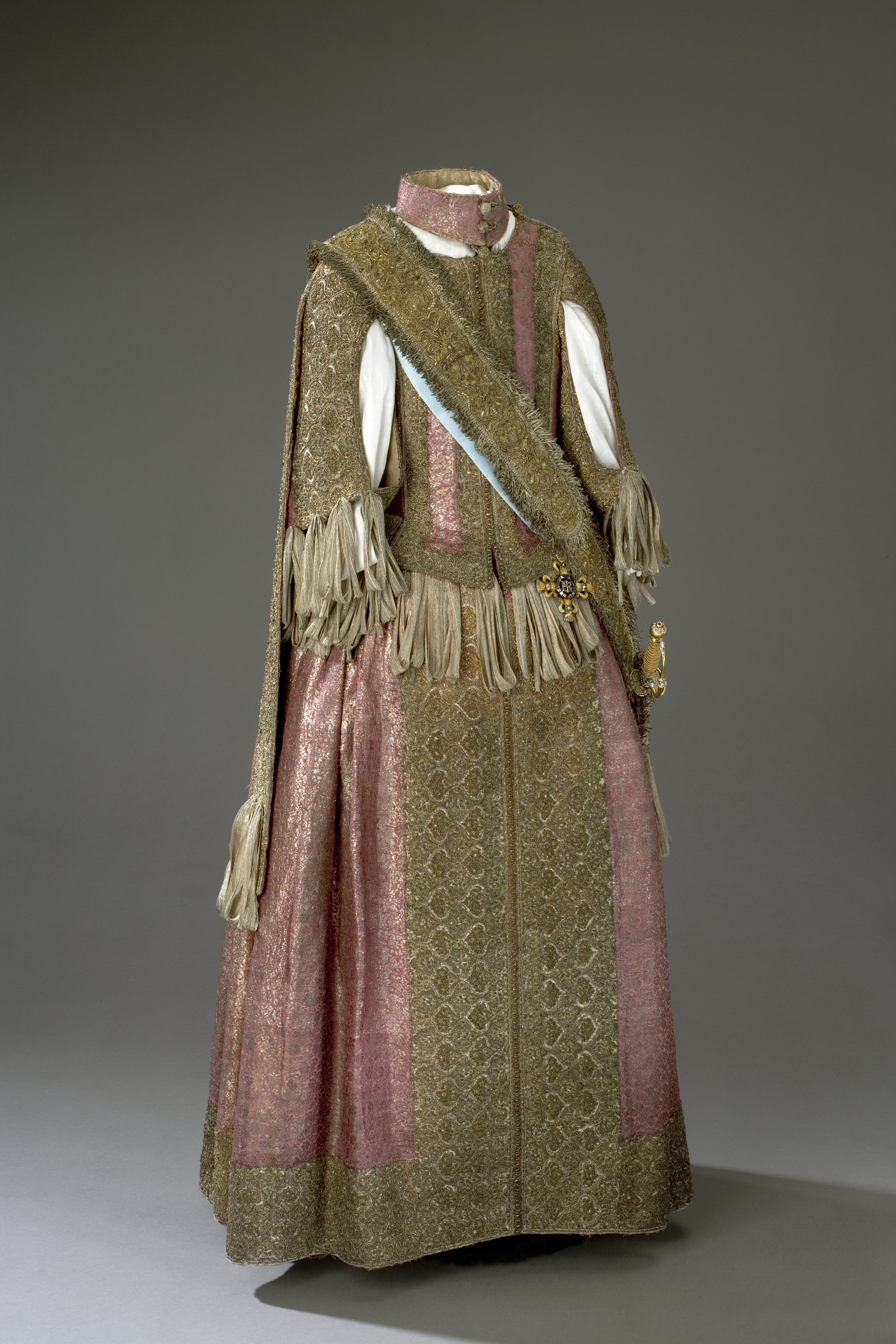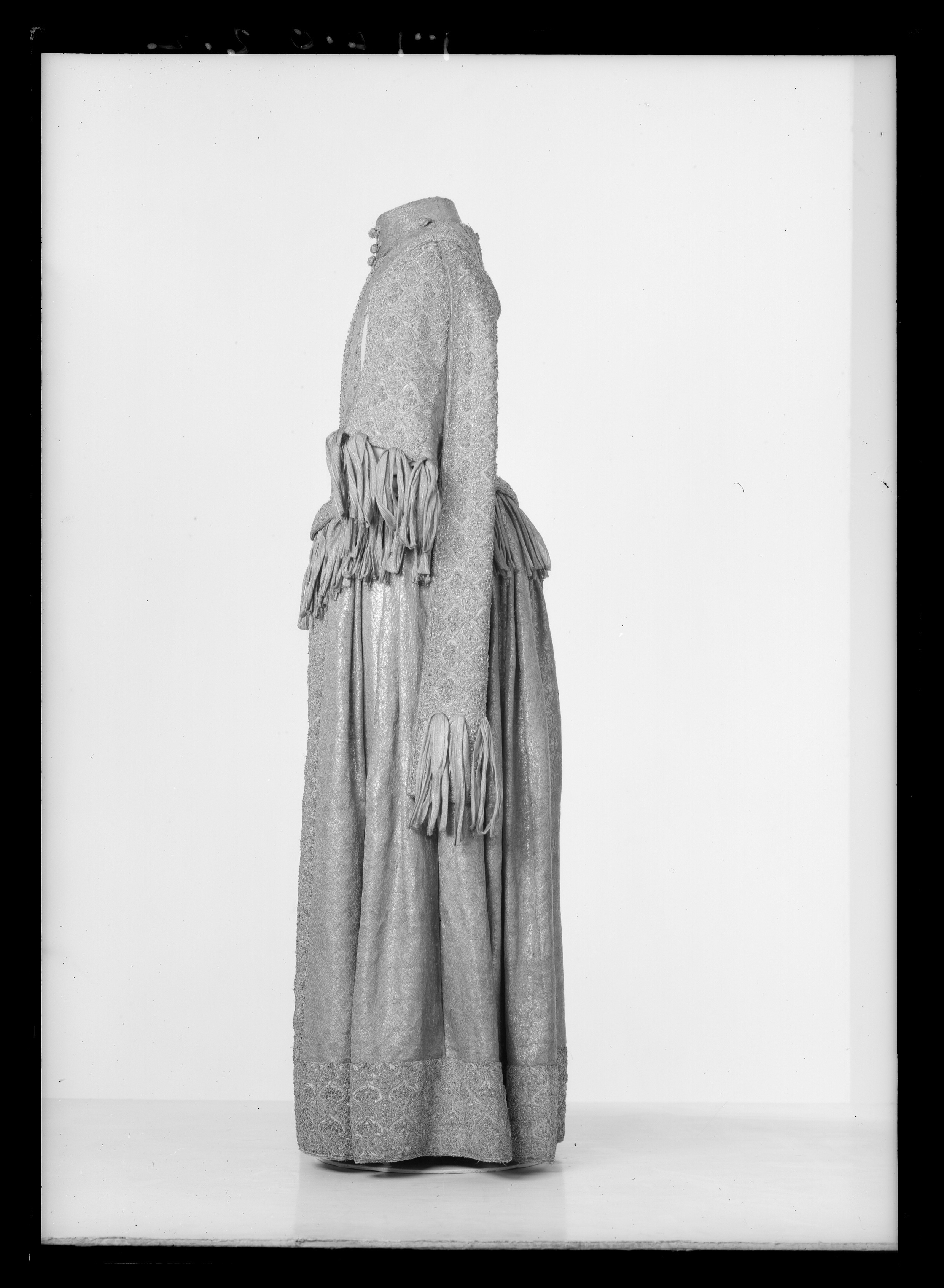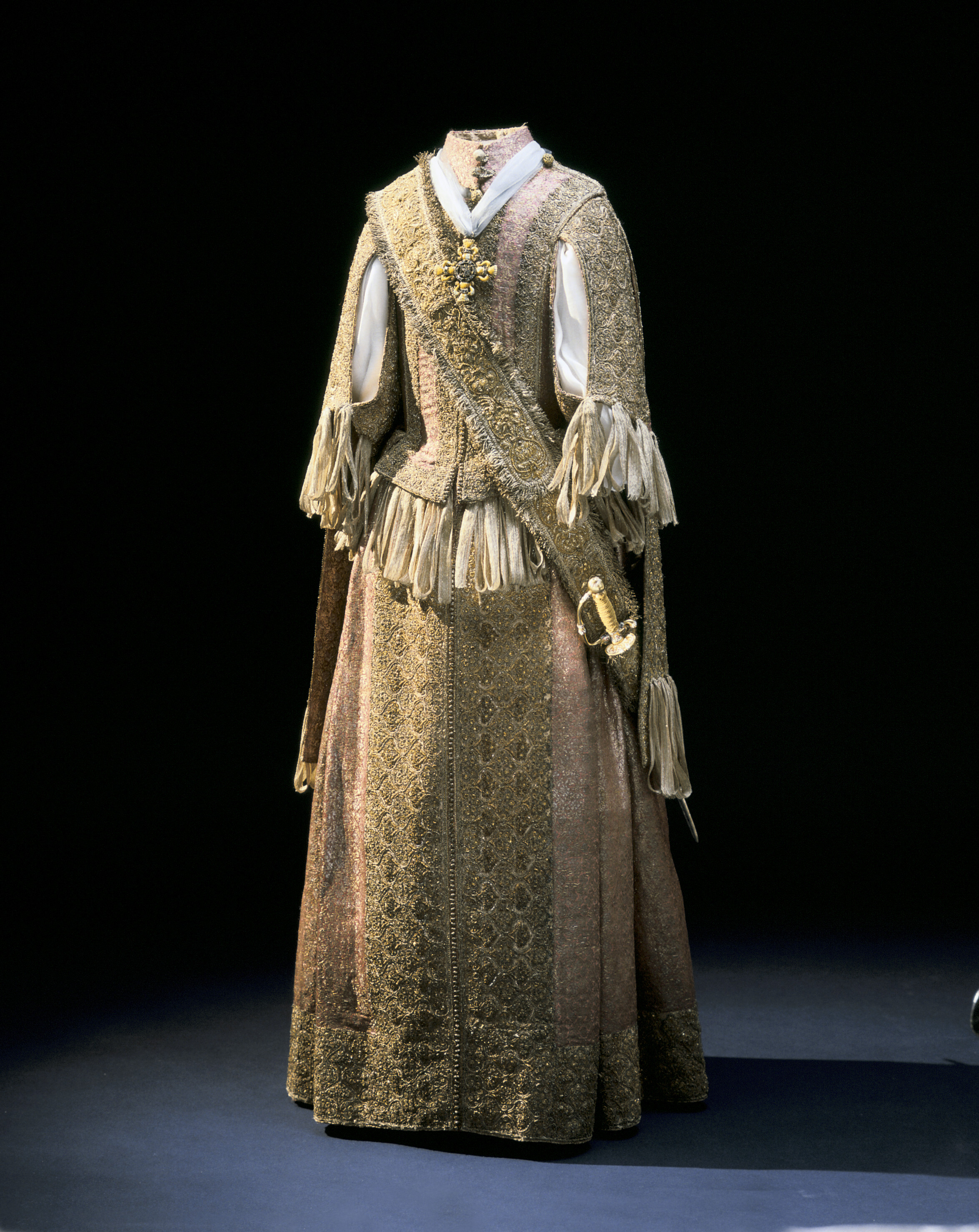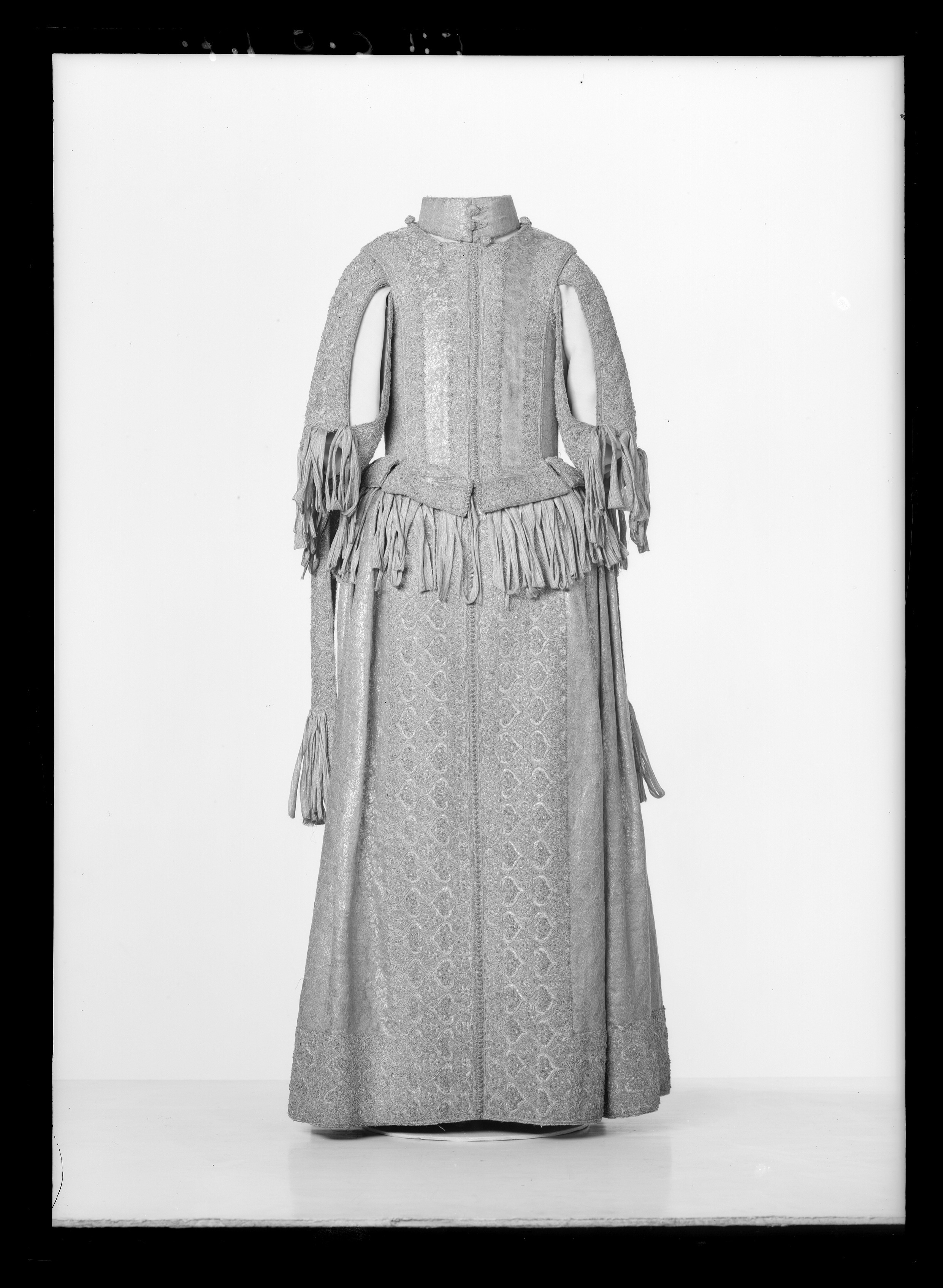 Klänning av purpurfärgad gyllenduk med bårder av silver? och guldbroderi (silverblommor l lövverk av guld). Höjd från axel och ned 95 cm. Lös ståndkrage höjd fram 4,5 cm. bak 3 cm. Klänningen består av ett markerat 30 cm långt liv med 6 små skörtflikar. varav de 2 främre gå i ett med framstycket. Kjolen som börjar framtill i midjan är här 64,5 cm lång och bak 69 cm. Den lösa ståndkragen är fastknäppt med 4 knappar (fram. bak och en på varje axel) av trä. Ursprungligen knäpptes kragen framtill med 2 knappar men den ena har fallit bort. På kragen finnas 5 öglor för fastsättning. Kjolen är i nederkanten broderad med en 9,5 cm bred bård, mitt fram äro 2 sådana bårder broderade vertikalt från midjan och ner till kantbården. Kjolens omkrets nertill är 237 cm. Kjolen är sydd av 5 st. 45,5 cm breda våder (synlig vidd) ? 2 våder stöta mot varandra mitt fram. Mitt bak har kjolen ett 25 cm långt sprund från midjan (en våd har sprättats upp i mitten). I sidsömmarna ha 2 fickor med vardera 13 cm långt sprund passats in (underkanten av ficksäcken sitter 34,5 cm från kjolens nederkant). Livet har broderats med smalare bårder; fram c:a 5,5 cm bred med markerad mittrad. samt c:a 2.,8 cm breda bårder markerande falsk sidsöm från axeln och ner så att avslutningen bildas i de 2 främsta skörten. Livet snöres samman baktill med 16 snörhål (26 cm). Under midjeskörten löper runt hela midjan bandrosetter (silverband med rosa inslag) bildande 2 öglor och 2 band (tampar) i varje grupp. Bandöglorna äro c:a 12 cm långa (varje ögla = 6 x 12 :t 72 cm. Inalles är det 46 rosetter, som alltså dragit en ungefärlig längd band av 33,12 meter. ? Den flätade snodd av guld? och silvertråd som snör samman livet i ryggen är 102 cm lång och i ena änden finns den urspr. 2 cm lång "doppskon" kvar. De 2 korta ärmarna äro framtill öppna (längd fram 18,5 cm). De ha utefter de öppna kanterna. vertikalt broderade bårder som dräkten i övrigt. 7 st. rosettgrupper äro fastsydda nertill på varje ärm. Vid ärmarnas bakre söm äro 2 "hängband" (Flügelärmar) fastsatta. De äro 56 ? 57 cm långa (resp. V och H) och 9,6 cm breda. De äro broderade på utsidan såsom bårderna i övr. och på undersidan fodrade med gyllenduken. 8,5 cm från nederkanten har 3 grupper bandrosetter ) öglorna äro nu c:a 12 cm långa) fastsatts. "Hänghandens" främre sida börjar vid axelsömmen. Framsidan är något längre än den bakre, då sömmen är något sned. (Flügelärmarna äro en rest från det spanska dräkt modet. som eg. upphör omkr. 1625. Dessa kunde bara ifrågakomma när man hade styvt snörliv.) Klänningen är helt fodrad med purpurfärgad (nu blekt) taft. Troligen har samma tyg begagnats som grund för de broderade partierna. Fodrets vådbredd är 105 cm ( 62 varptr x 44 insltr/cm2. Skörtflikarna äro fodrade med taft. C:a 1.95 ? 2 cm under skört flikarnas fästsöm vid livet ha bandrosetterna sytts fast (26 bandgrupper runt midjan något ojämnt placerade). Under det V midjeskörtet baktill sitter en knapp. trol. placerad för värjgehängets skull. Den sitter cm från midjan , och 6,5 cm från sömmen mitt baktill. Knapparna äro små halvklotformiga träknappar med ett hål tvärs igenom, klädda med silver? och guldtråd. Diam. Höjd Å kjolens mittvåd baktill har man inte brytt sig om att öka i något stycke i midjan utan nöjt sig med den 68 cm långa våden och blott låtit underfodret gå ner i livet och detta sitter bart ett stycke under skörtflikarna. I midjan ? under livets nederkant? har men till foder begagnat samma (ljusare) tyg som begagnats till underlag på de broderade partierna, som alltså aldrig sytts genom brokaden. I midjan mitt bak ? under snörningen? knäppes livet med en urspr. hyska och en ny hake. I midjan är foderskarven 3,5 ? 5,5 cm bred (inre midjemått: 51 cm.) Livet är styvt genom foder av kanfas och fiskben. Guldbrokaden har en vådbredd av c:a 51 cm. Den är vävd med inslag av guldtrådar (guldlan spunna över gult silke) och silvertrådar (silverlan spunna över vitt silke) samt platta silverlan och varp av purpurfärgat otvinnat silke. Mönsterrapport: höjd 6 cm bredd 4 cm. (mönster: blommor av silver, bladverk av guld). Sidenbanden äro 14 mm. breda och vävda av vitt silke, smala silverlansomspunna trådar och smala, platta silverlan samt rosa silkestrådar i varpen; glest inslag av smala silveromspunna trådar (14 insltr/cm).