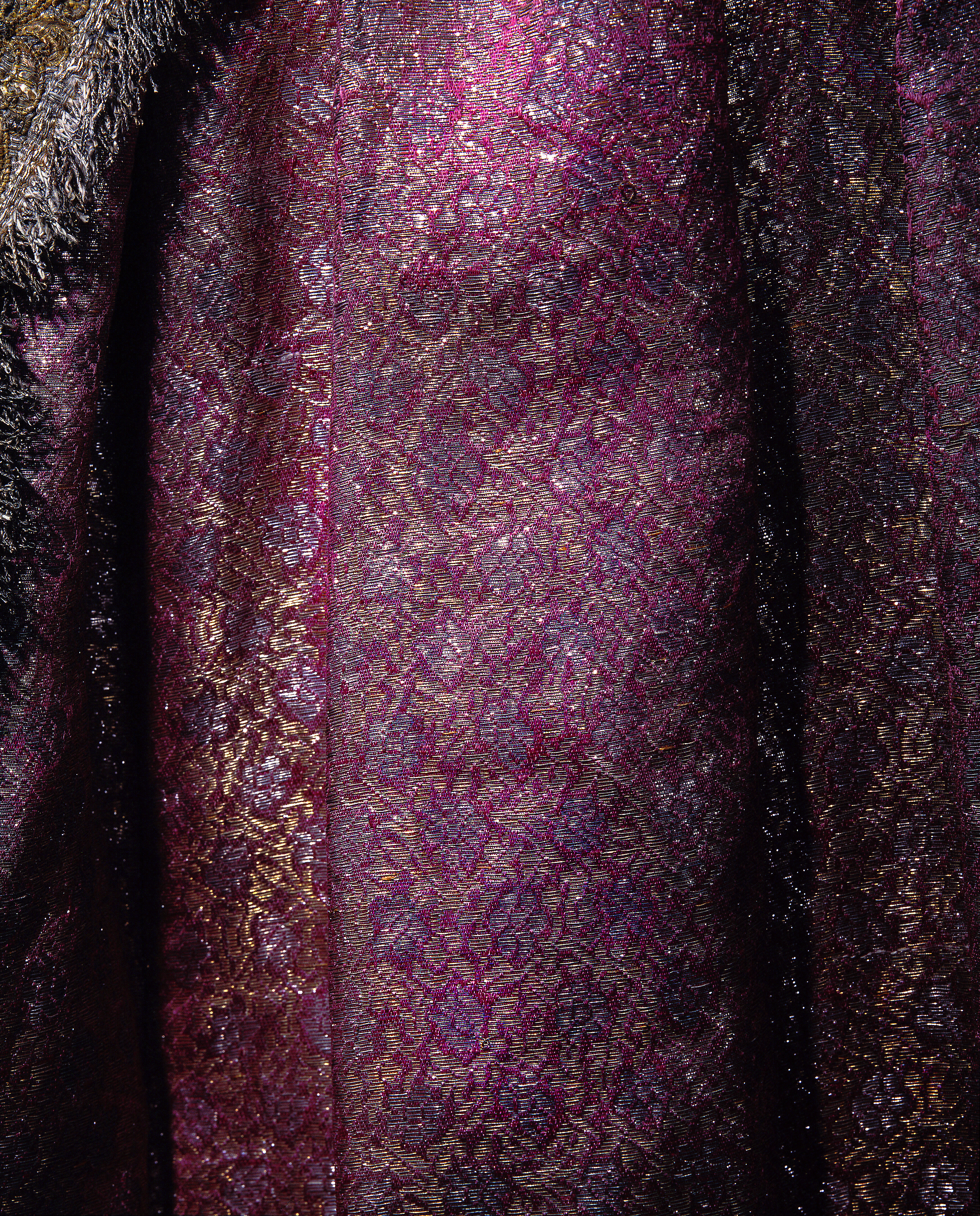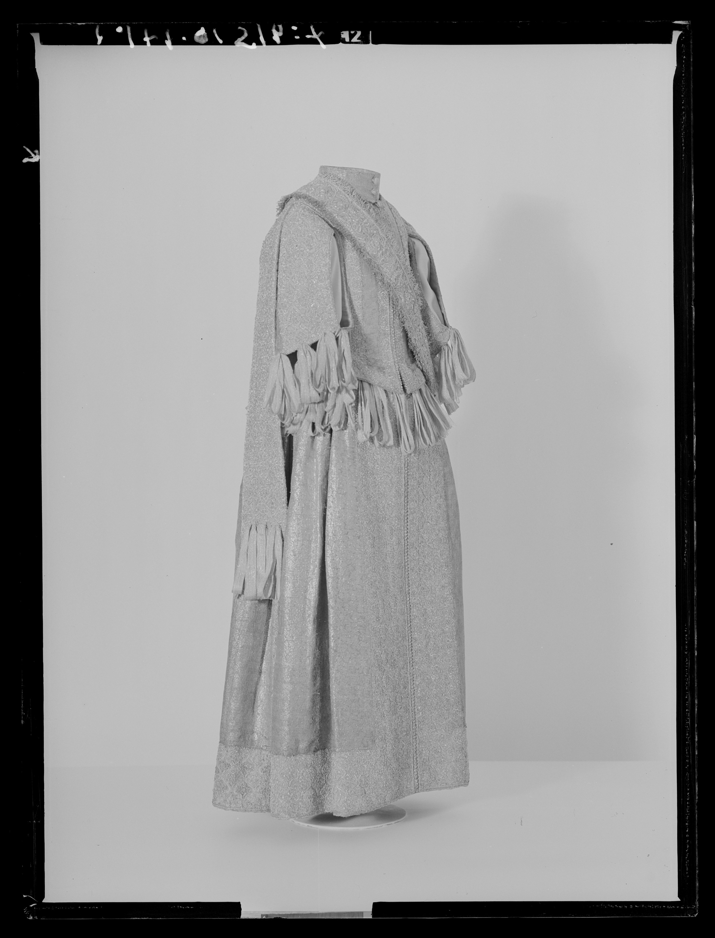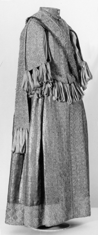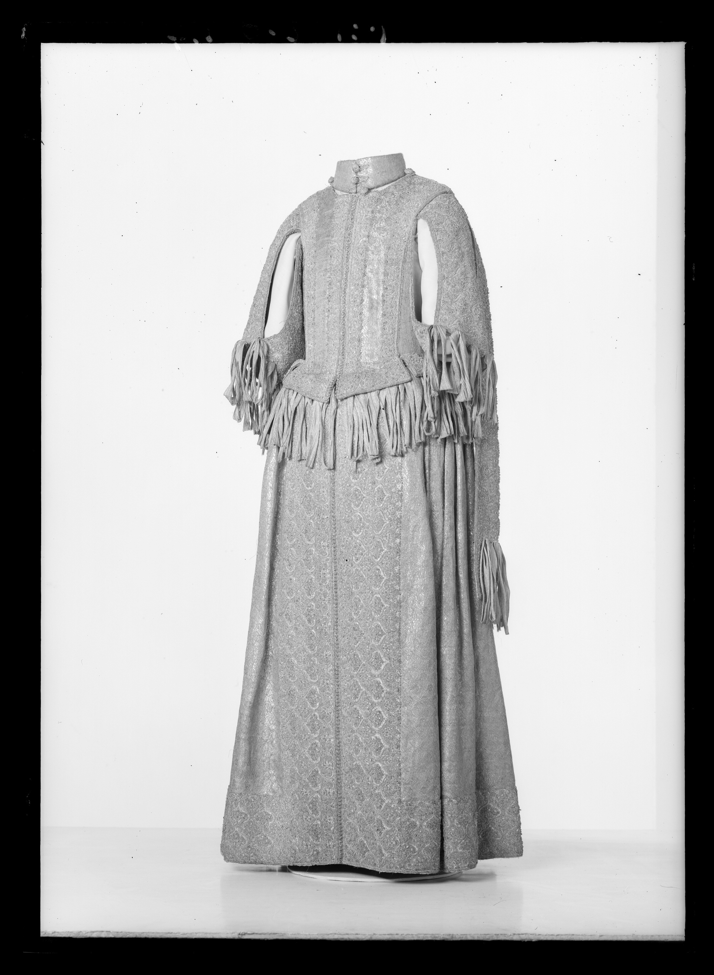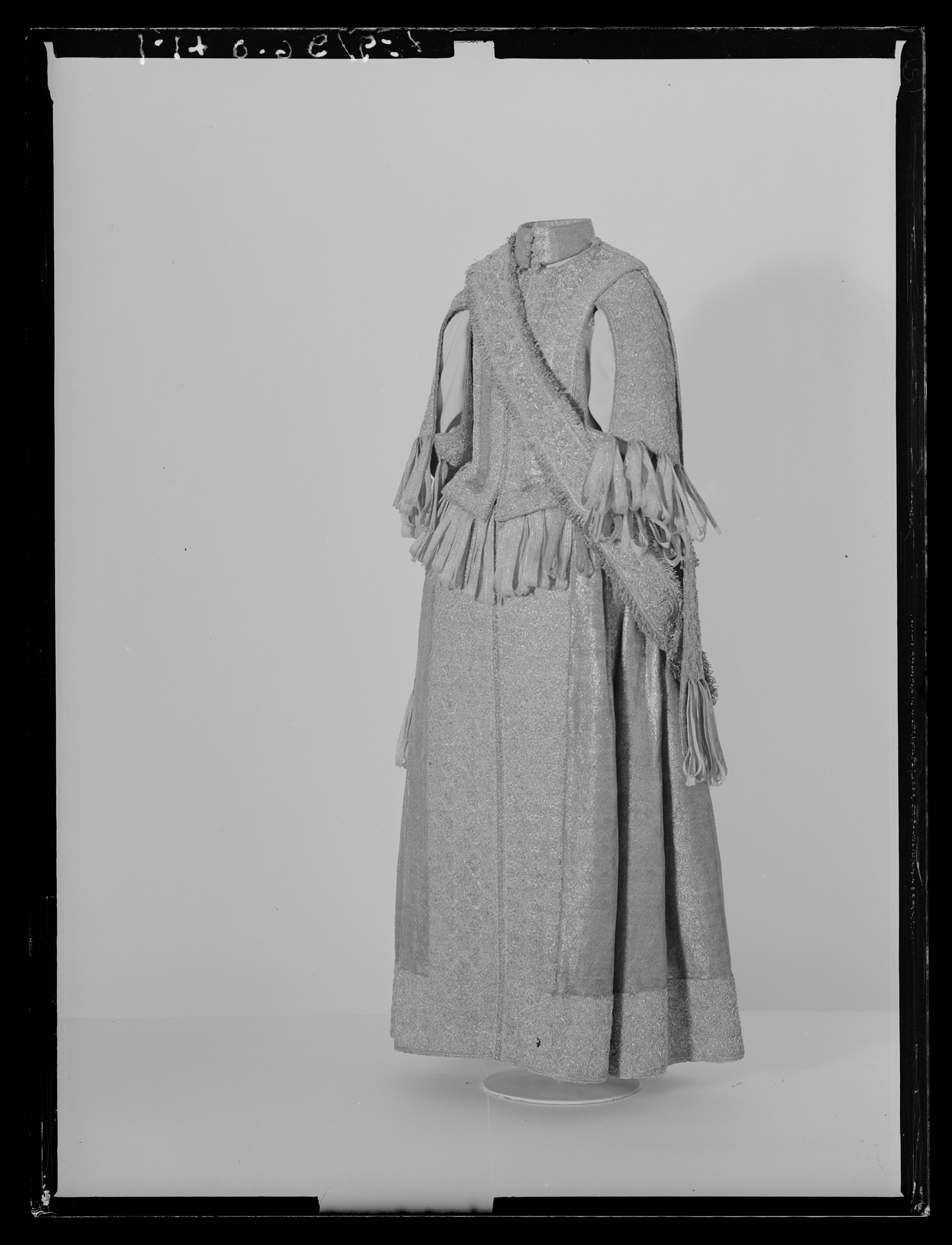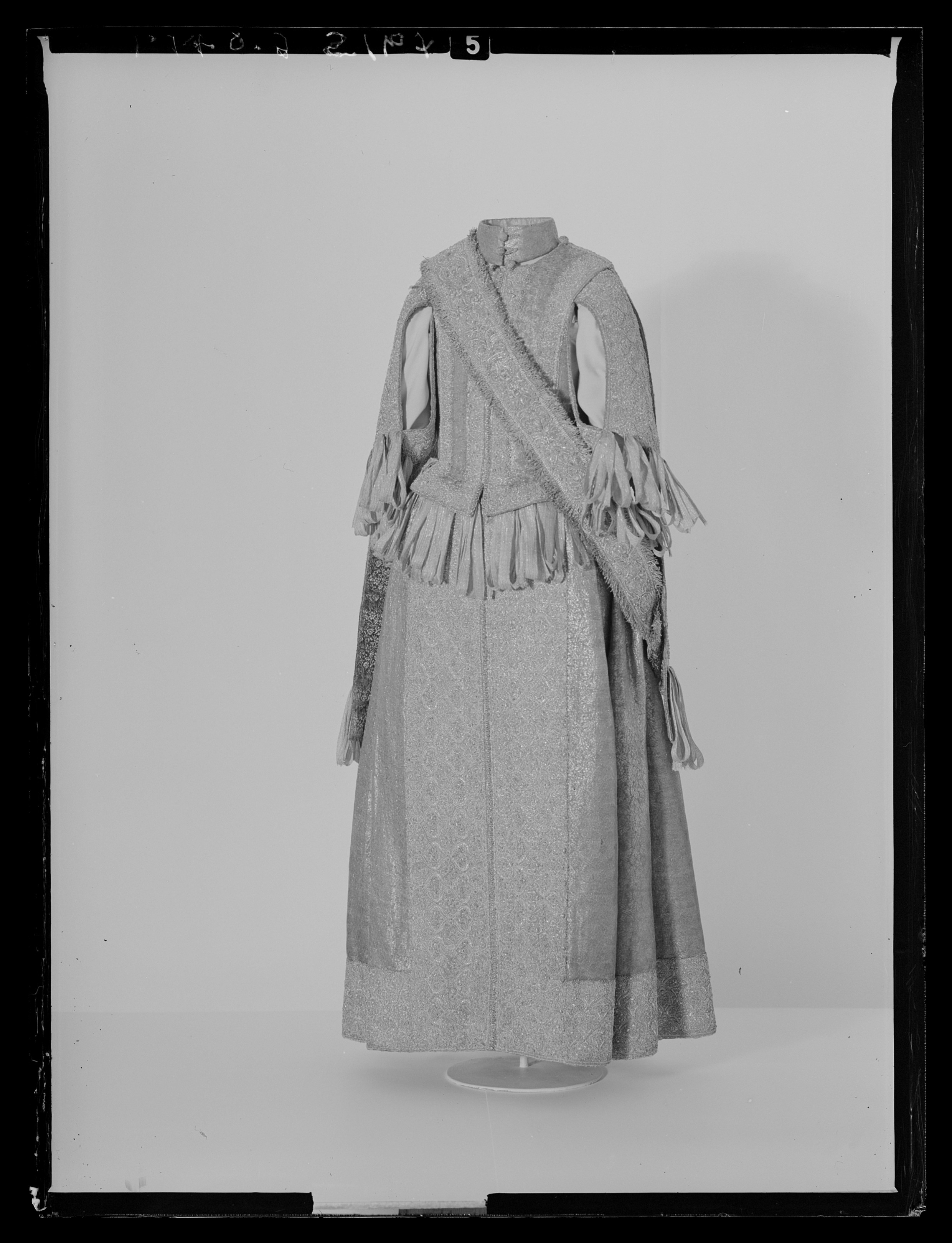 Klänning av purpurfärgad gyllenduk med bårder av silver? och guldbroderi (silverblommor l lövverk av guld). Höjd från axel och ned 95 cm. Lös ståndkrage höjd fram 4,5 cm. bak 3 cm. Klänningen består av ett markerat 30 cm långt liv med 6 små skörtflikar. varav de 2 främre gå i ett med framstycket. Kjolen som börjar framtill i midjan är här 64,5 cm lång och bak 69 cm. Den lösa ståndkragen är fastknäppt med 4 knappar (fram. bak och en på varje axel) av trä. Ursprungligen knäpptes kragen framtill med 2 knappar men den ena har fallit bort. På kragen finnas 5 öglor för fastsättning. Kjolen är i nederkanten broderad med en 9,5 cm bred bård, mitt fram äro 2 sådana bårder broderade vertikalt från midjan och ner till kantbården. Kjolens omkrets nertill är 237 cm. Kjolen är sydd av 5 st. 45,5 cm breda våder (synlig vidd) ? 2 våder stöta mot varandra mitt fram. Mitt bak har kjolen ett 25 cm långt sprund från midjan (en våd har sprättats upp i mitten). I sidsömmarna ha 2 fickor med vardera 13 cm långt sprund passats in (underkanten av ficksäcken sitter 34,5 cm från kjolens nederkant). Livet har broderats med smalare bårder; fram c:a 5,5 cm bred med markerad mittrad. samt c:a 2.,8 cm breda bårder markerande falsk sidsöm från axeln och ner så att avslutningen bildas i de 2 främsta skörten. Livet snöres samman baktill med 16 snörhål (26 cm). Under midjeskörten löper runt hela midjan bandrosetter (silverband med rosa inslag) bildande 2 öglor och 2 band (tampar) i varje grupp. Bandöglorna äro c:a 12 cm långa (varje ögla = 6 x 12 :t 72 cm. Inalles är det 46 rosetter, som alltså dragit en ungefärlig längd band av 33,12 meter. ? Den flätade snodd av guld? och silvertråd som snör samman livet i ryggen är 102 cm lång och i ena änden finns den urspr. 2 cm lång "doppskon" kvar. De 2 korta ärmarna äro framtill öppna (längd fram 18,5 cm). De ha utefter de öppna kanterna. vertikalt broderade bårder som dräkten i övrigt. 7 st. rosettgrupper äro fastsydda nertill på varje ärm. Vid ärmarnas bakre söm äro 2 "hängband" (Flügelärmar) fastsatta. De äro 56 ? 57 cm långa (resp. V och H) och 9,6 cm breda. De äro broderade på utsidan såsom bårderna i övr. och på undersidan fodrade med gyllenduken. 8,5 cm från nederkanten har 3 grupper bandrosetter ) öglorna äro nu c:a 12 cm långa) fastsatts. "Hänghandens" främre sida börjar vid axelsömmen. Framsidan är något längre än den bakre, då sömmen är något sned. (Flügelärmarna äro en rest från det spanska dräkt modet. som eg. upphör omkr. 1625. Dessa kunde bara ifrågakomma när man hade styvt snörliv.) Klänningen är helt fodrad med purpurfärgad (nu blekt) taft. Troligen har samma tyg begagnats som grund för de broderade partierna. Fodrets vådbredd är 105 cm ( 62 varptr x 44 insltr/cm2. Skörtflikarna äro fodrade med taft. C:a 1.95 ? 2 cm under skört flikarnas fästsöm vid livet ha bandrosetterna sytts fast (26 bandgrupper runt midjan något ojämnt placerade). Under det V midjeskörtet baktill sitter en knapp. trol. placerad för värjgehängets skull. Den sitter cm från midjan , och 6,5 cm från sömmen mitt baktill. Knapparna äro små halvklotformiga träknappar med ett hål tvärs igenom, klädda med silver? och guldtråd. Diam. Höjd Å kjolens mittvåd baktill har man inte brytt sig om att öka i något stycke i midjan utan nöjt sig med den 68 cm långa våden och blott låtit underfodret gå ner i livet och detta sitter bart ett stycke under skörtflikarna. I midjan ? under livets nederkant? har men till foder begagnat samma (ljusare) tyg som begagnats till underlag på de broderade partierna, som alltså aldrig sytts genom brokaden. I midjan mitt bak ? under snörningen? knäppes livet med en urspr. hyska och en ny hake. I midjan är foderskarven 3,5 ? 5,5 cm bred (inre midjemått: 51 cm.) Livet är styvt genom foder av kanfas och fiskben. Guldbrokaden har en vådbredd av c:a 51 cm. Den är vävd med inslag av guldtrådar (guldlan spunna över gult silke) och silvertrådar (silverlan spunna över vitt silke) samt platta silverlan och varp av purpurfärgat otvinnat silke. Mönsterrapport: höjd 6 cm bredd 4 cm. (mönster: blommor av silver, bladverk av guld). Sidenbanden äro 14 mm. breda och vävda av vitt silke, smala silverlansomspunna trådar och smala, platta silverlan samt rosa silkestrådar i varpen; glest inslag av smala silveromspunna trådar (14 insltr/cm).