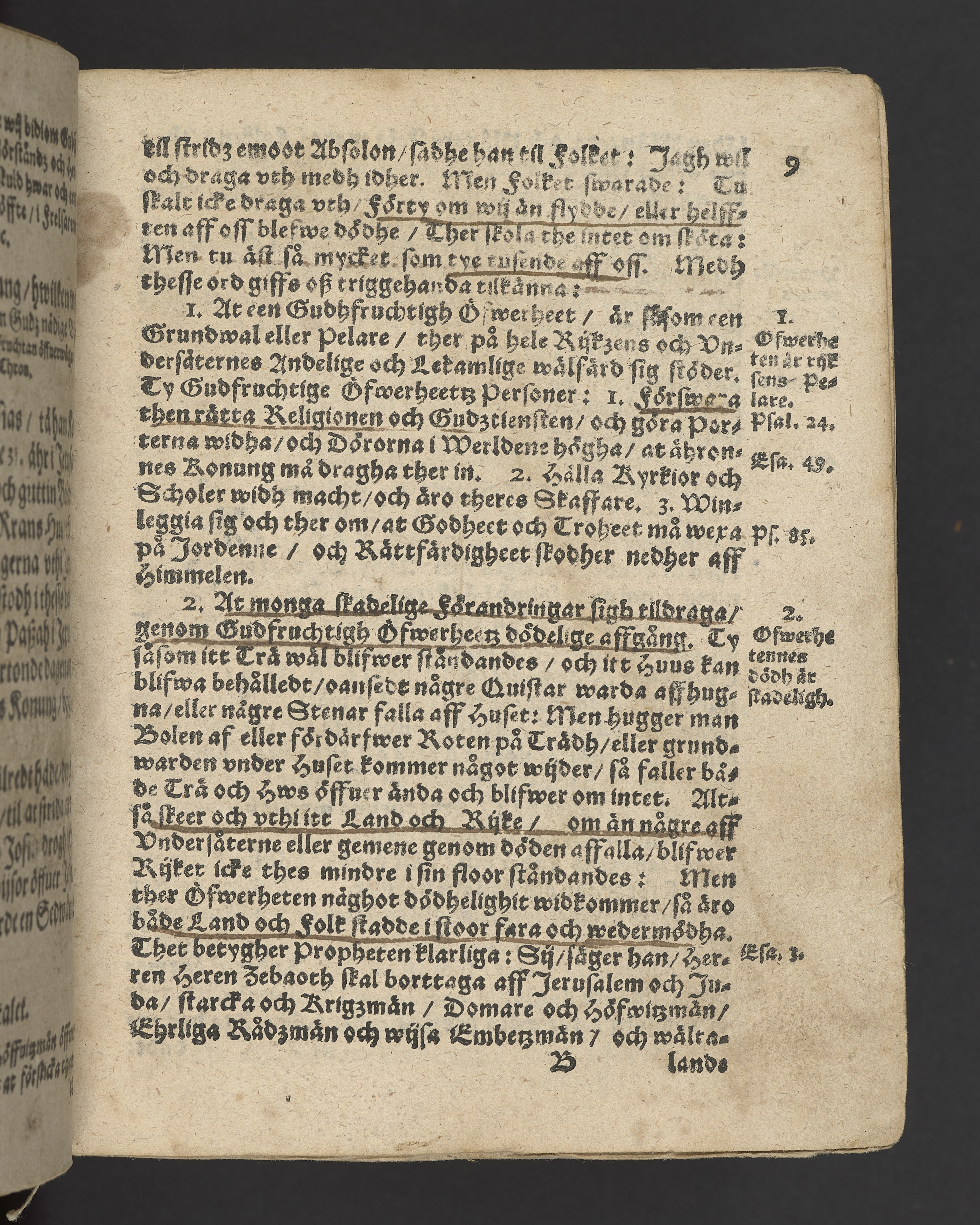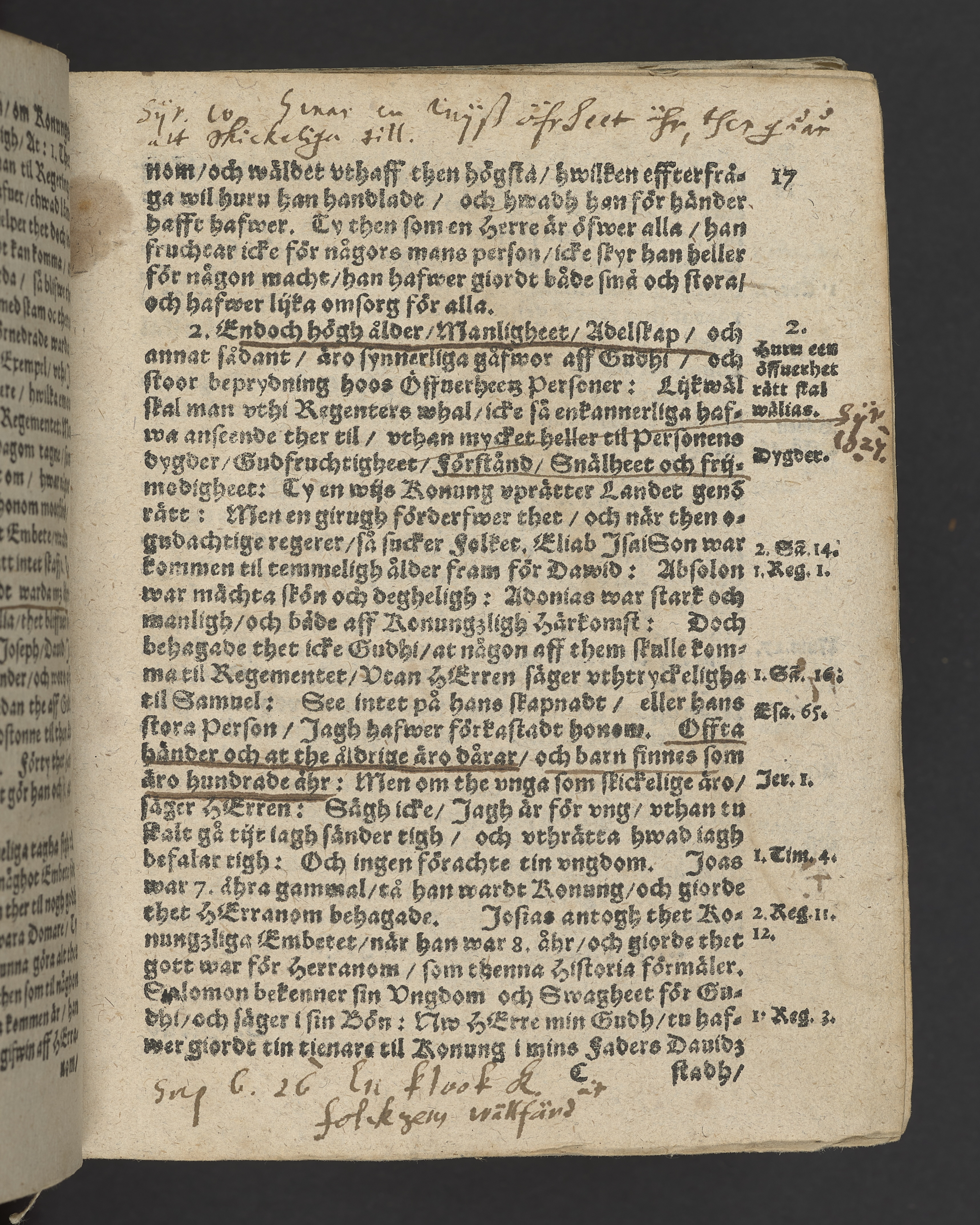 Nedre högra hörnet av titelbladet avrivet, så att en del av impressum saknas. Omfattande anteckningar och understrykningar.