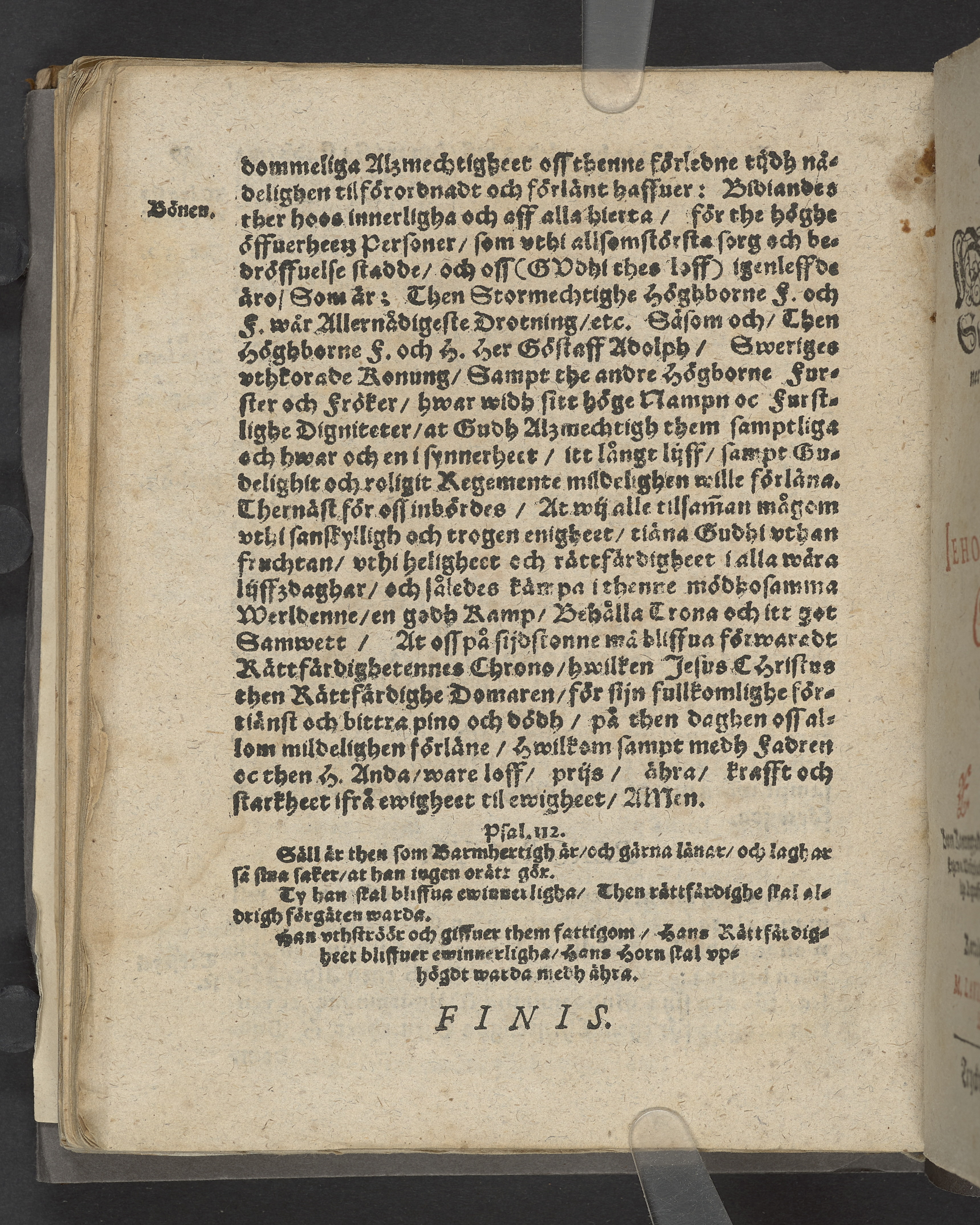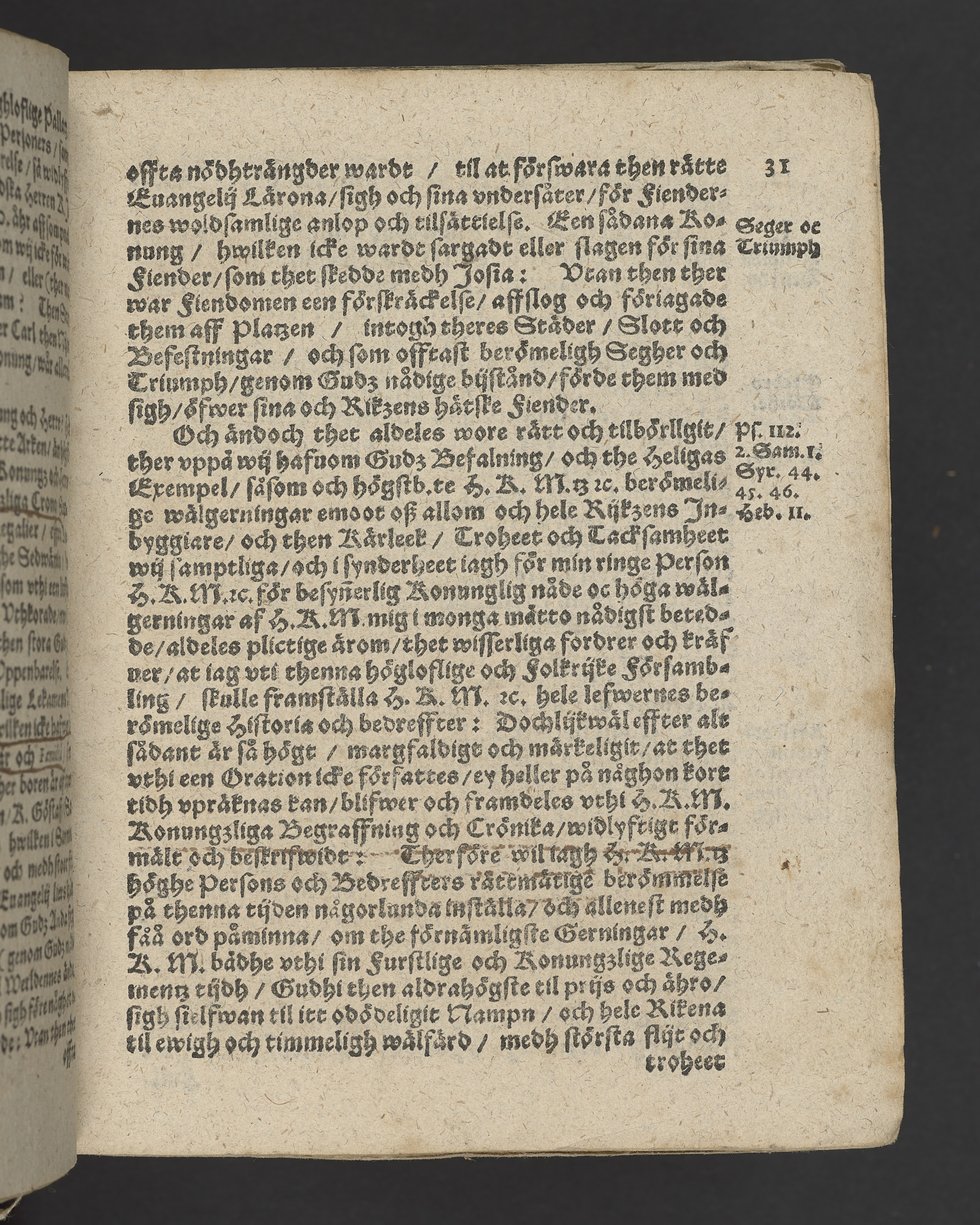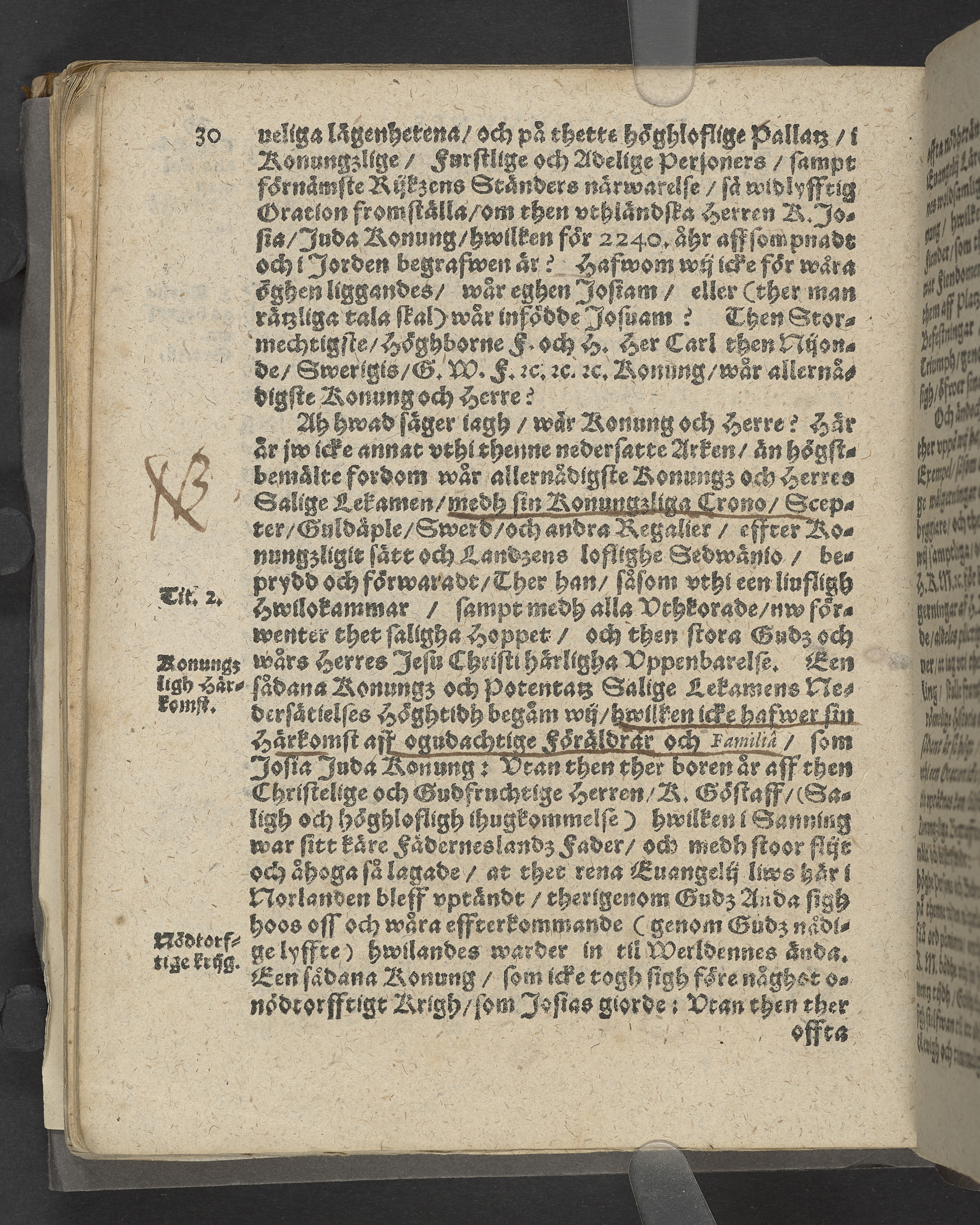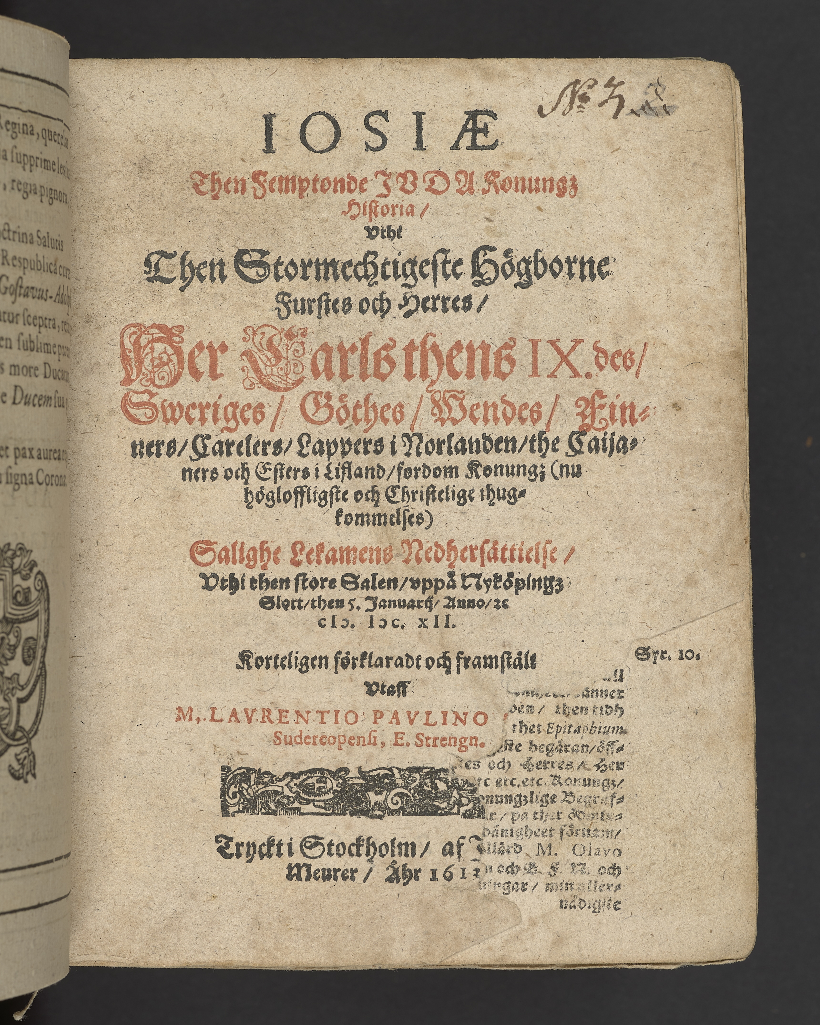 Iosiæ then femptonde Iuda konungz historia, vthi... Carls thens IX.des... salighe lekamens Nedhersättielse... vppå Nyköpingz slott, then 5 Januarij, anno ec. MDCXII... Framstält vtaff M. Laurentio Paulino [Gotho]... Tryckt i Stockholm, af [Ignatio] Meurer, åhr 1613.