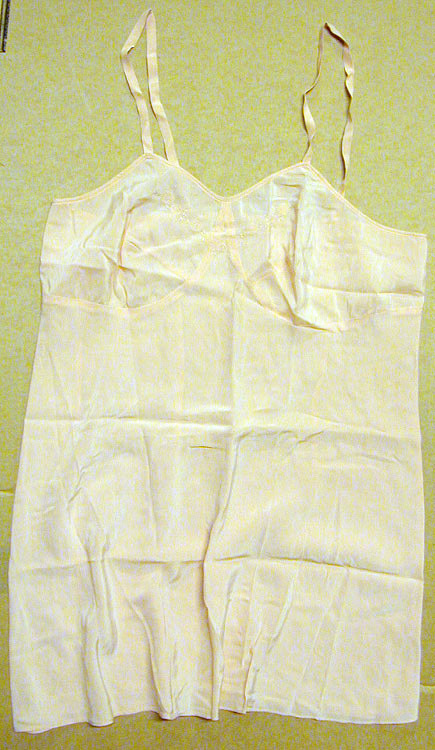 Underklänning av rosa crèpe. Svagt utställd. Figursydd upptill. Två sömmar i ryggen. Smalaaxelband, b: 11 mm. Längst upp på framsidan dekor av två smala rankor av broderade ochpåsydda blomrankor.