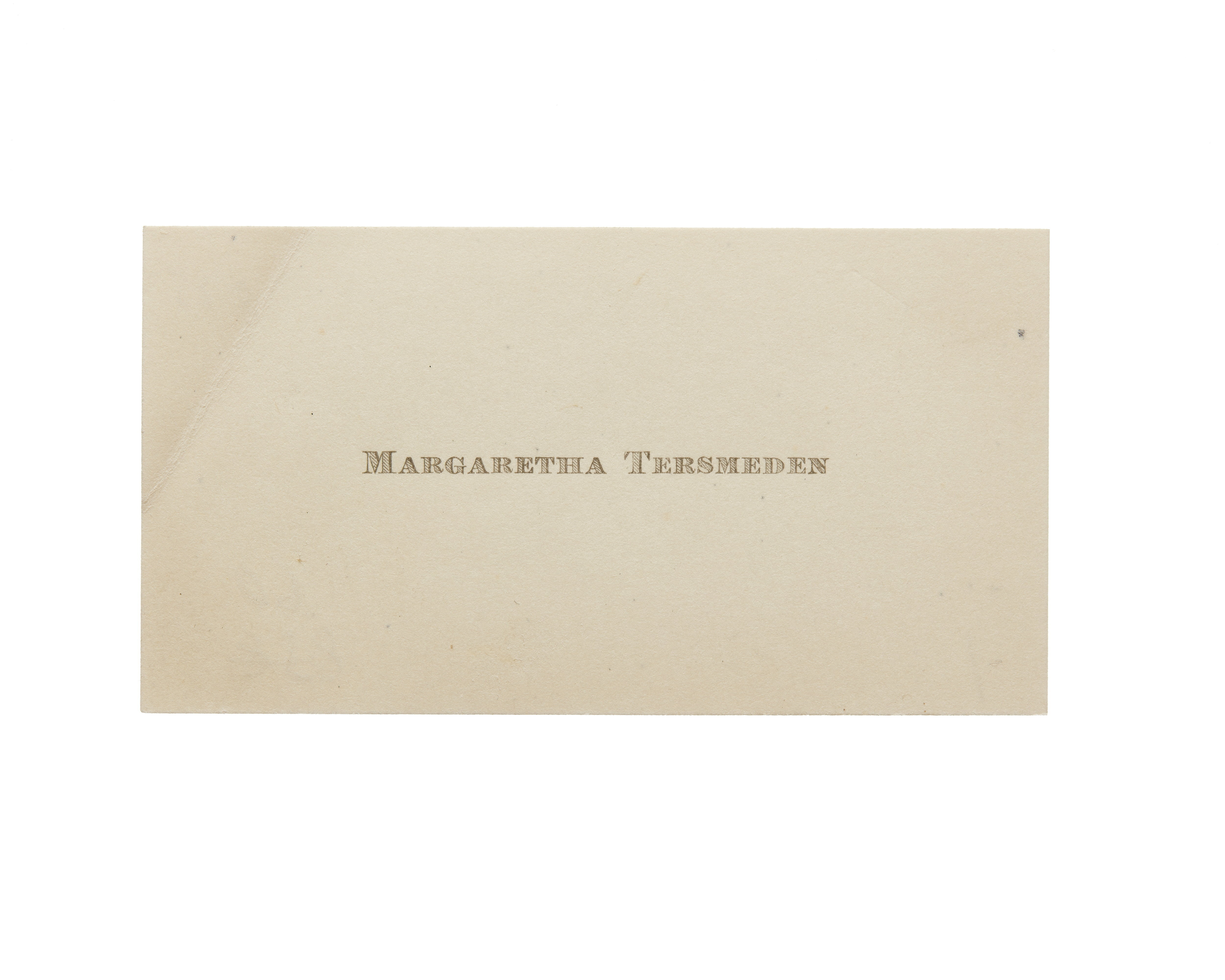 Ett visitkort från Margaretha Tersmeden, daterat 1925, vikt i övre vänstra hörnet.