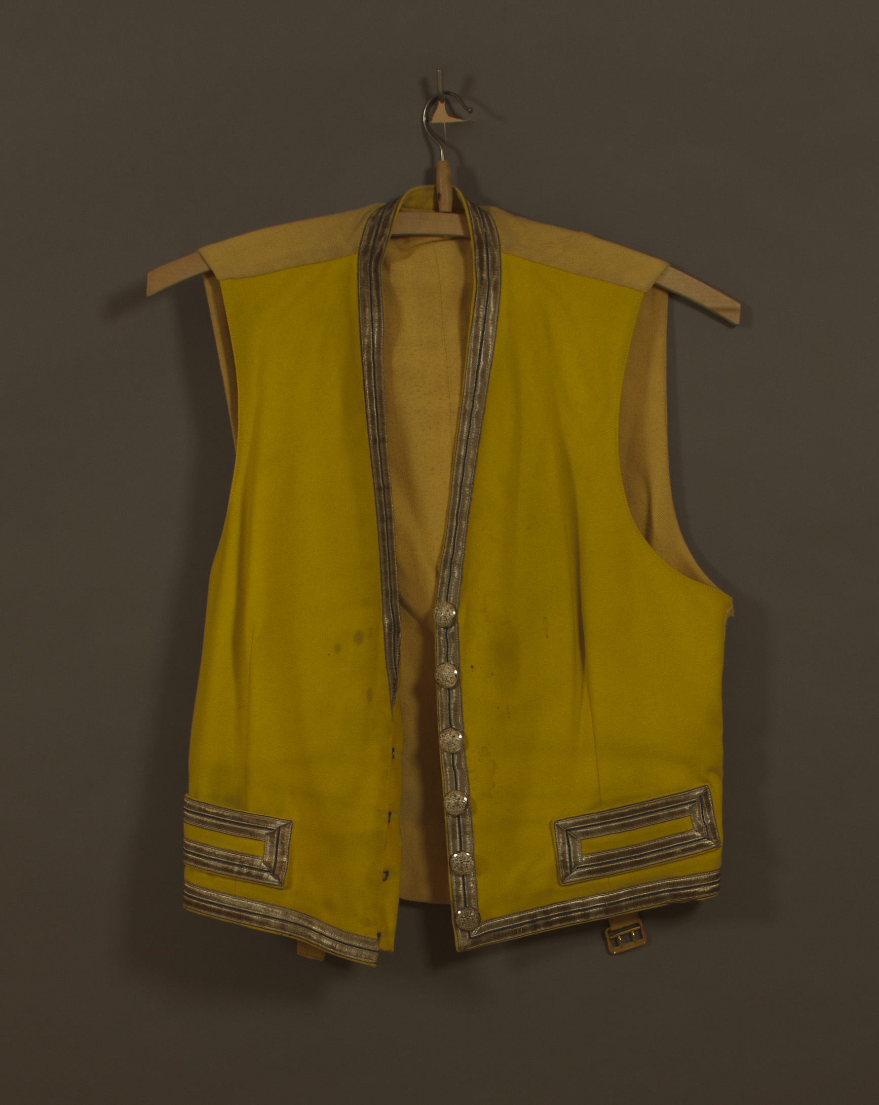 Väst av gult kläde tillskuren utan slag och ärmar. Enkelradig med sex knappar avsilver med stora riksvapnet, d: 19 mm. På insidan firmanamn: "CC SPORRONG & CoSTOCKHOLM" På insidan av varje knapp en grov hake av mässing, vilka knäpps i hyskor,120 mmbreda stolpfickor nedtill. Framstycket, fickor samt krage kantade medsilvergaloner 20 mm bred med invävd blå tråd. Ryggstycke av kyprat, gult ylle med spänntampar och spänne av gul metall. Hela västenfodrad med gult ylle.