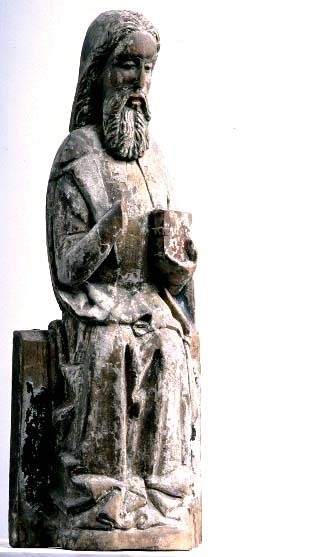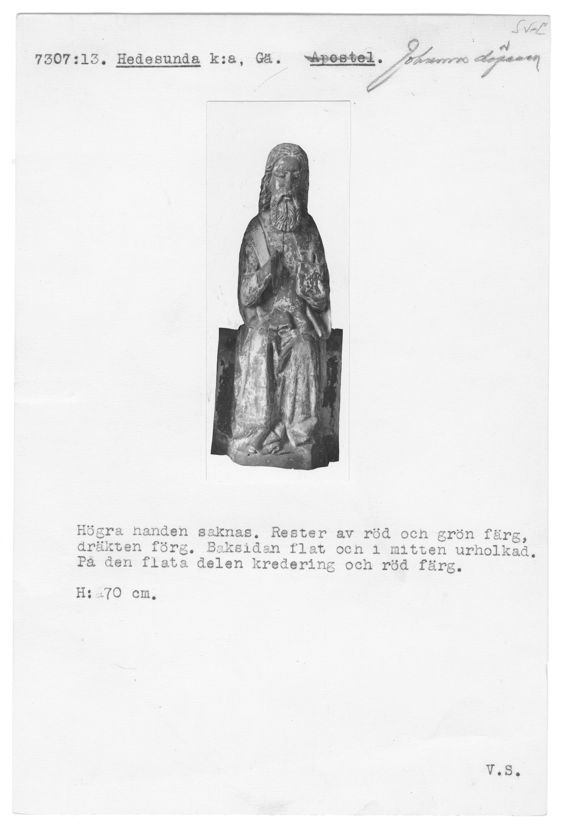 Kondition: höger hand bortbruten, näsan avslagen, lammet som haft sin placering på boken förlorat - stiften finns kvar. Färg: färgen till stor del bortflagnad, medan krederingen finns kvar.