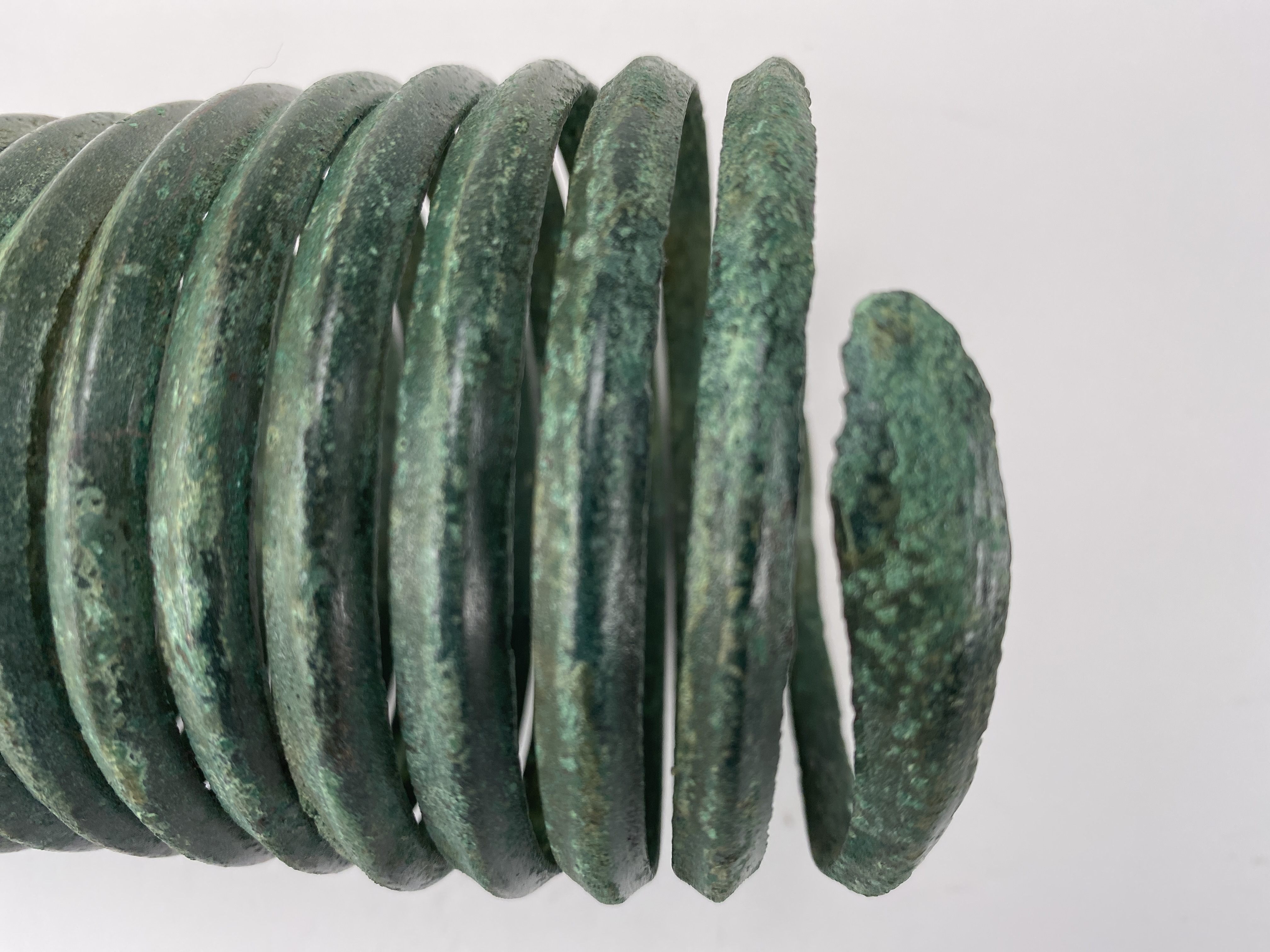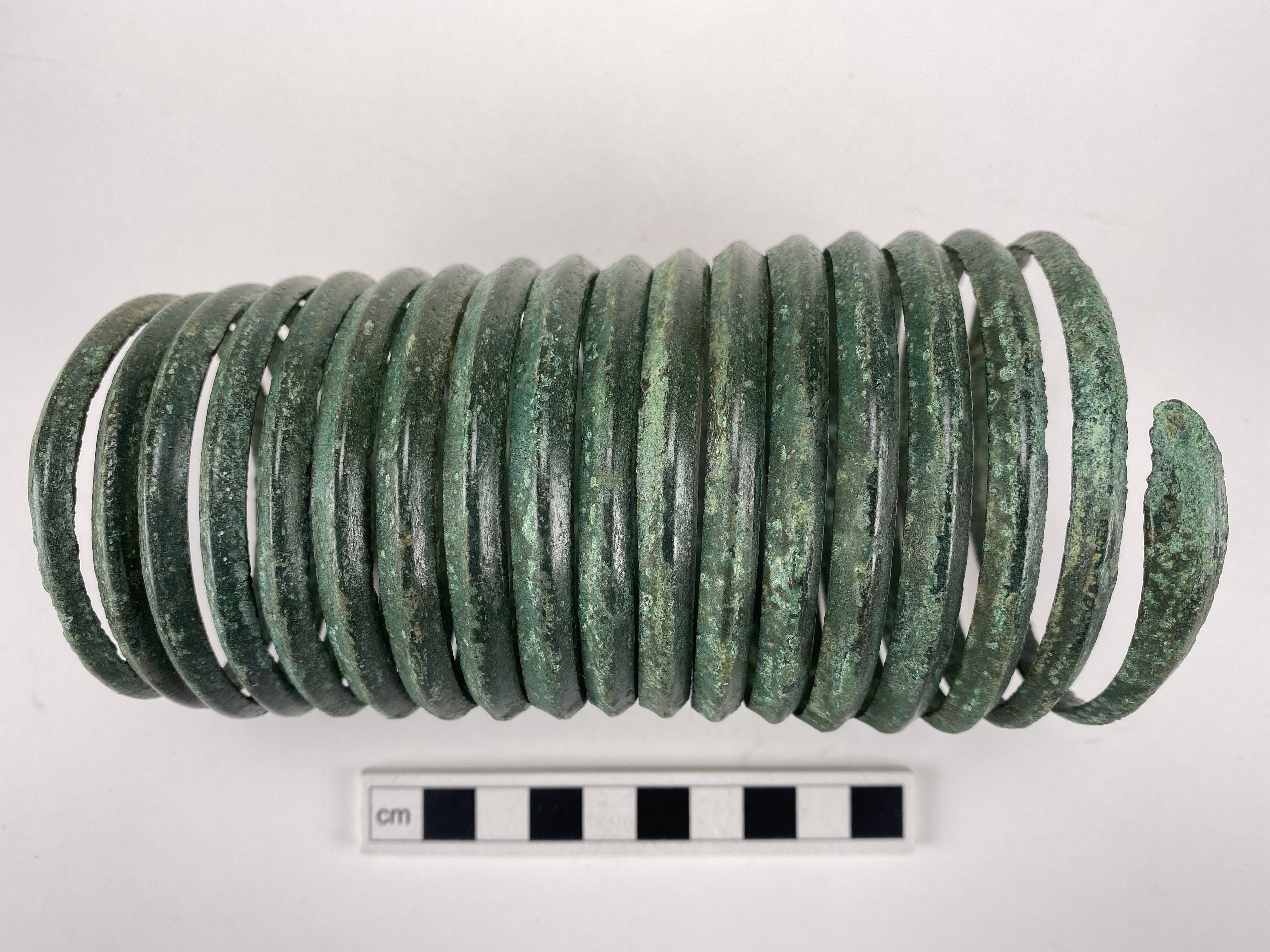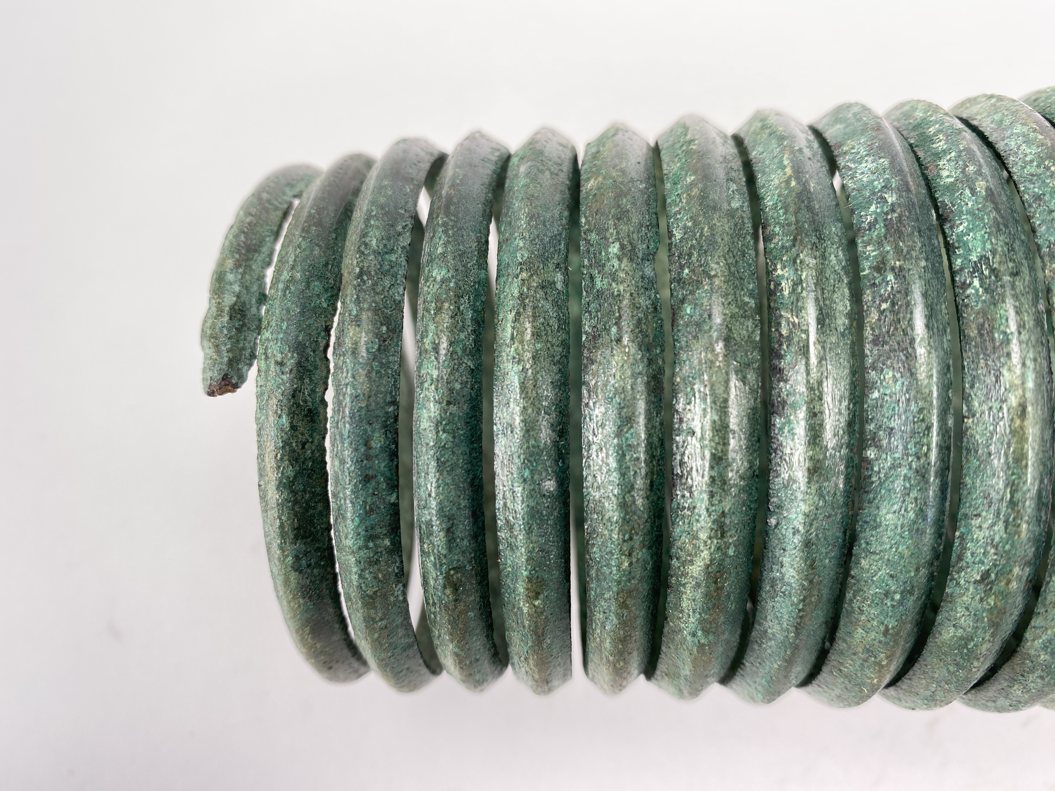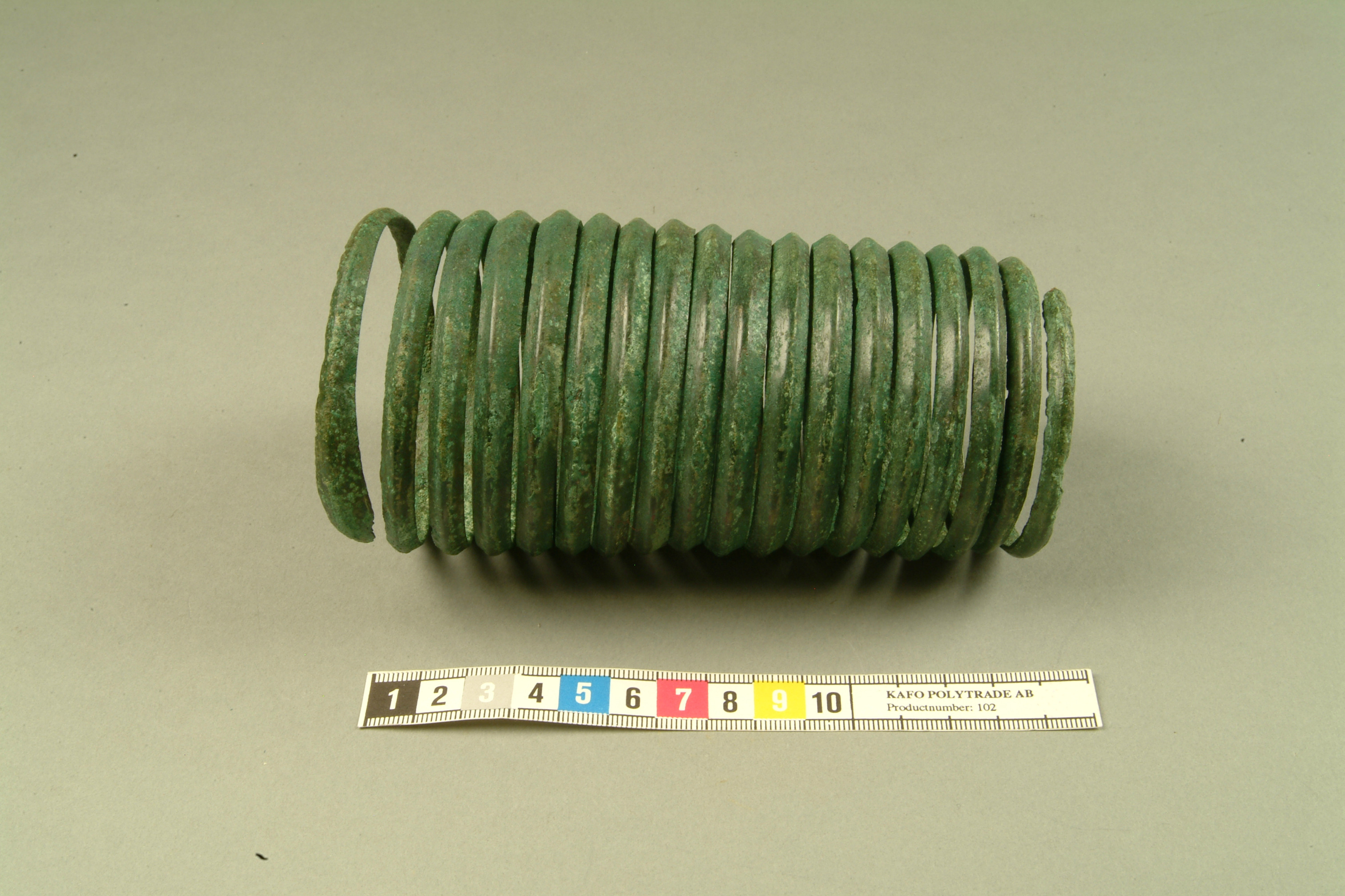 Spiralarmband av brons. Den är tillverkad av en i spiral lagd bronsten med varven tätt intill varandra. Slutändarna är tillplattade och avrundade. Ena änden är avbruten. Tenarna är släta på insidan och kupiga på utsidan.