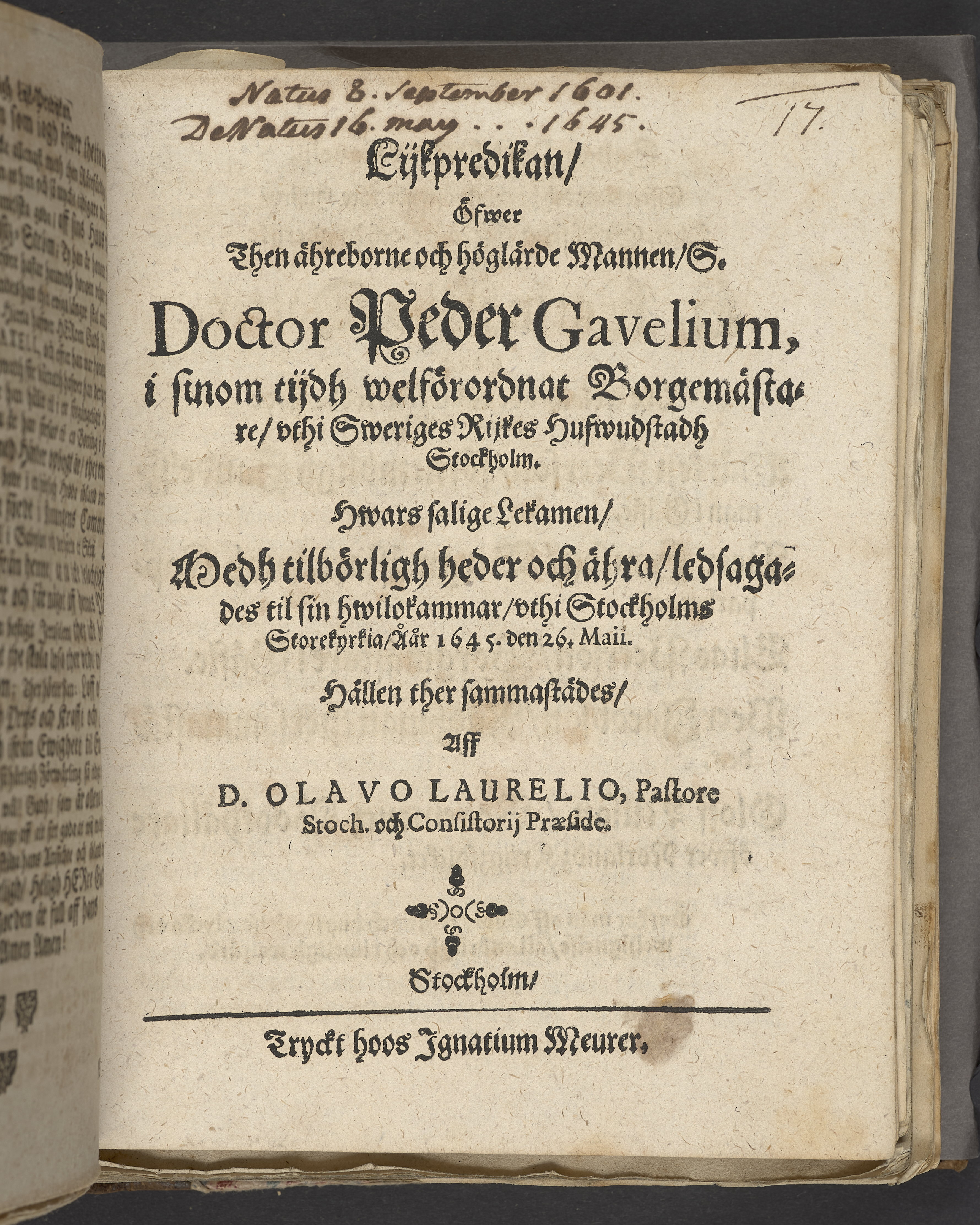 Lijkredikan, öfwer... doctor Peder Gavelium... bormästare, uthi... Stockholm... uthi Stockholms storekyrkia, åår 1645. den 26 Maii. Hållen... aff D. Olavo Laurelio... Stockholm, tryckt hoos Ignatium Meurer.