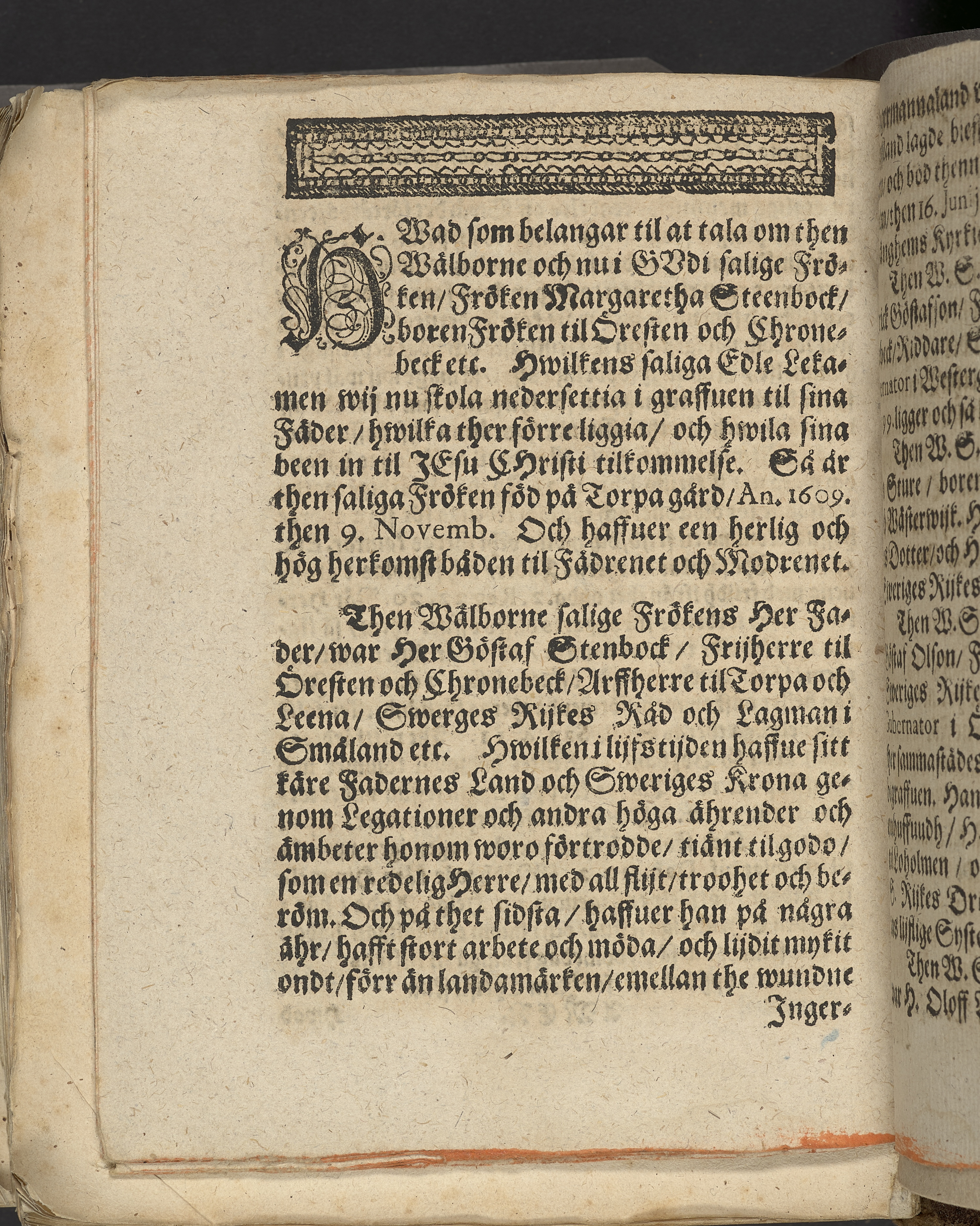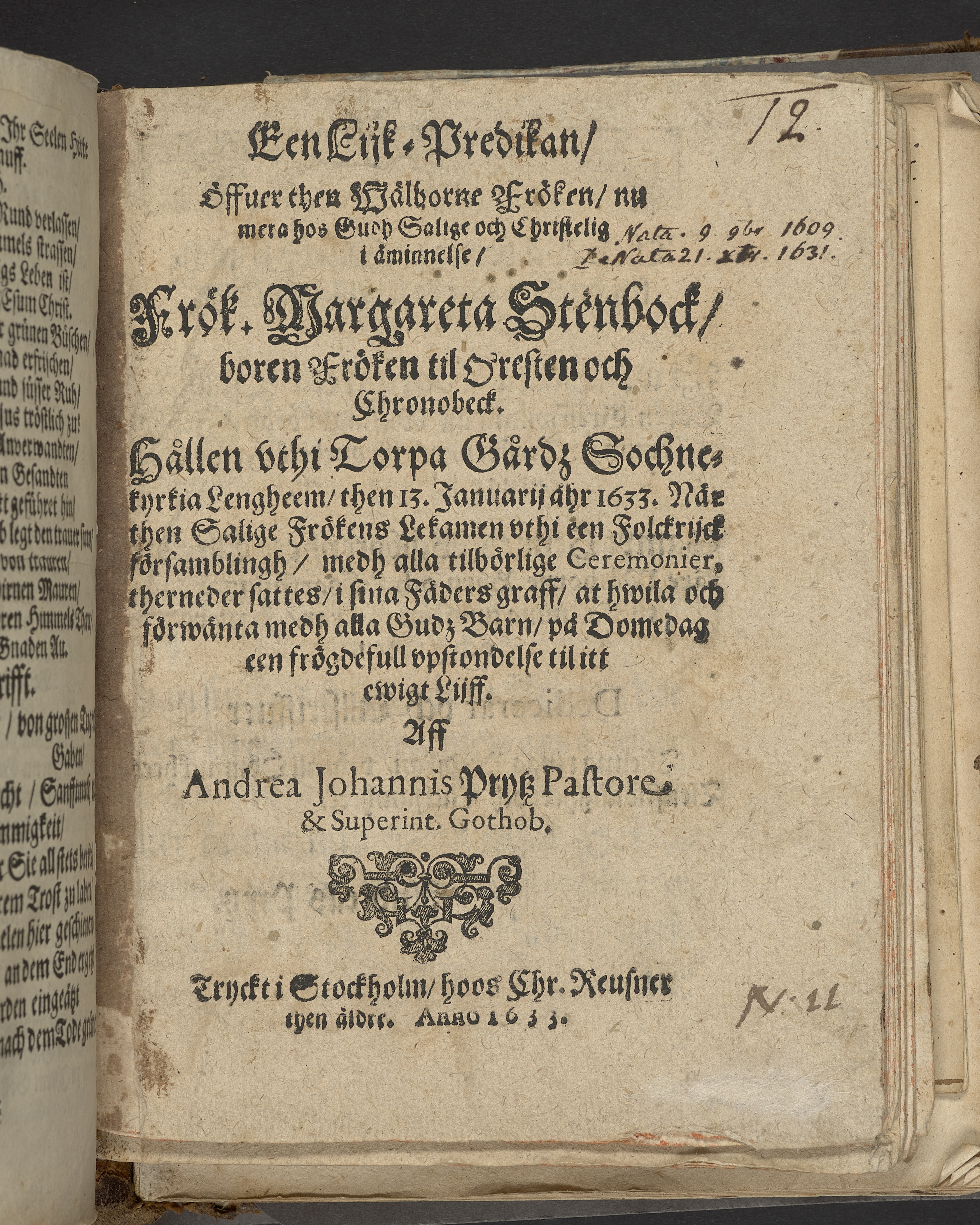 Een lijk-predikan, öffuer... frök. Margareta Stenbock, boren fröken til Öresten och Chronobeck. Hållen vthi Torpa gårdz socknekyrkia Lengheem, then13 januarij åhr 1630... Aff Andrea Johannis Prytz... Tryckt i Stockholm, hoos Chr. Reusner then äldre. Anno 1633.