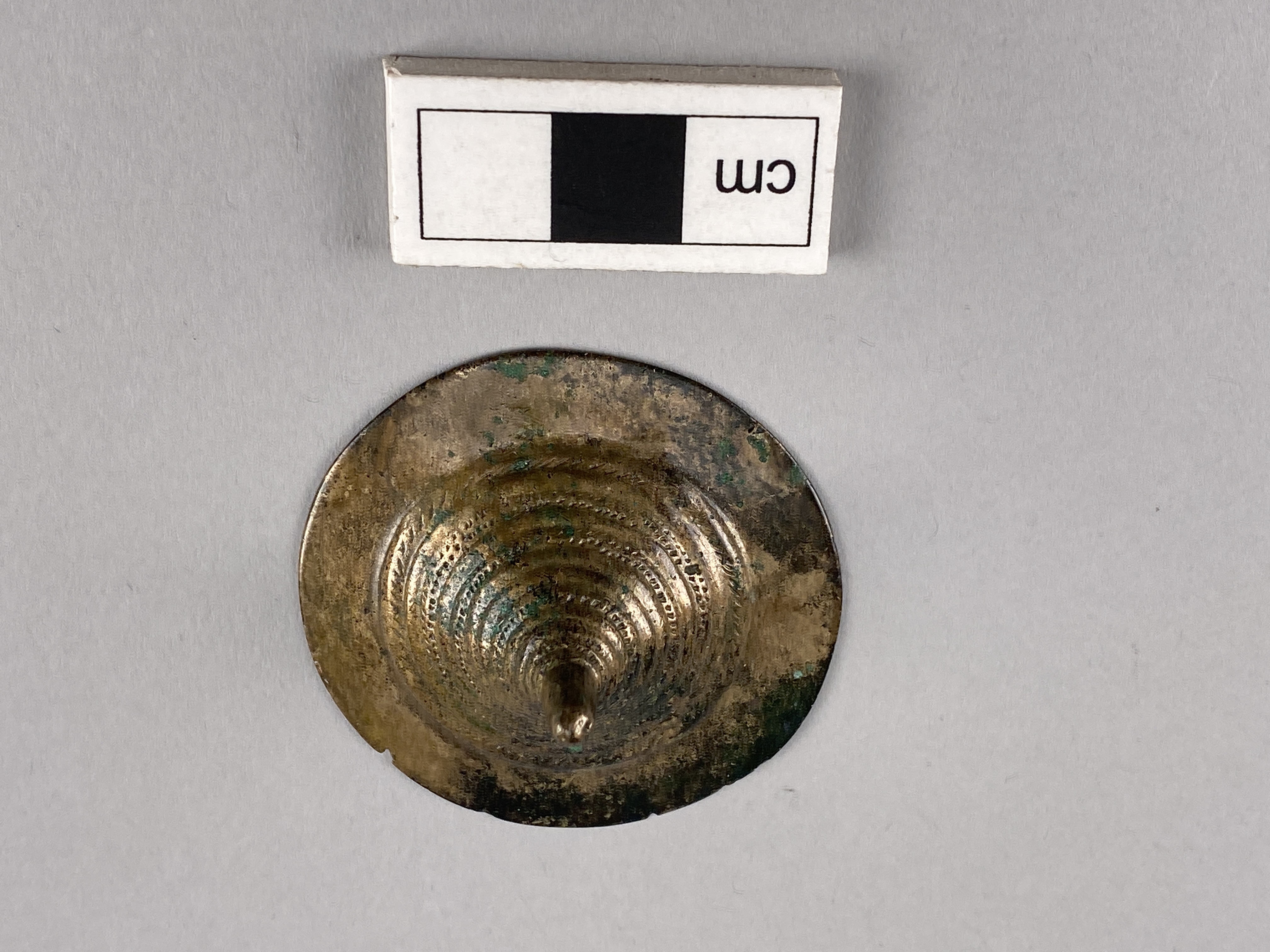 Tutulus av brons med låg, flat topp, möjligen avbruten. Ornerad med koncentriska ringar.