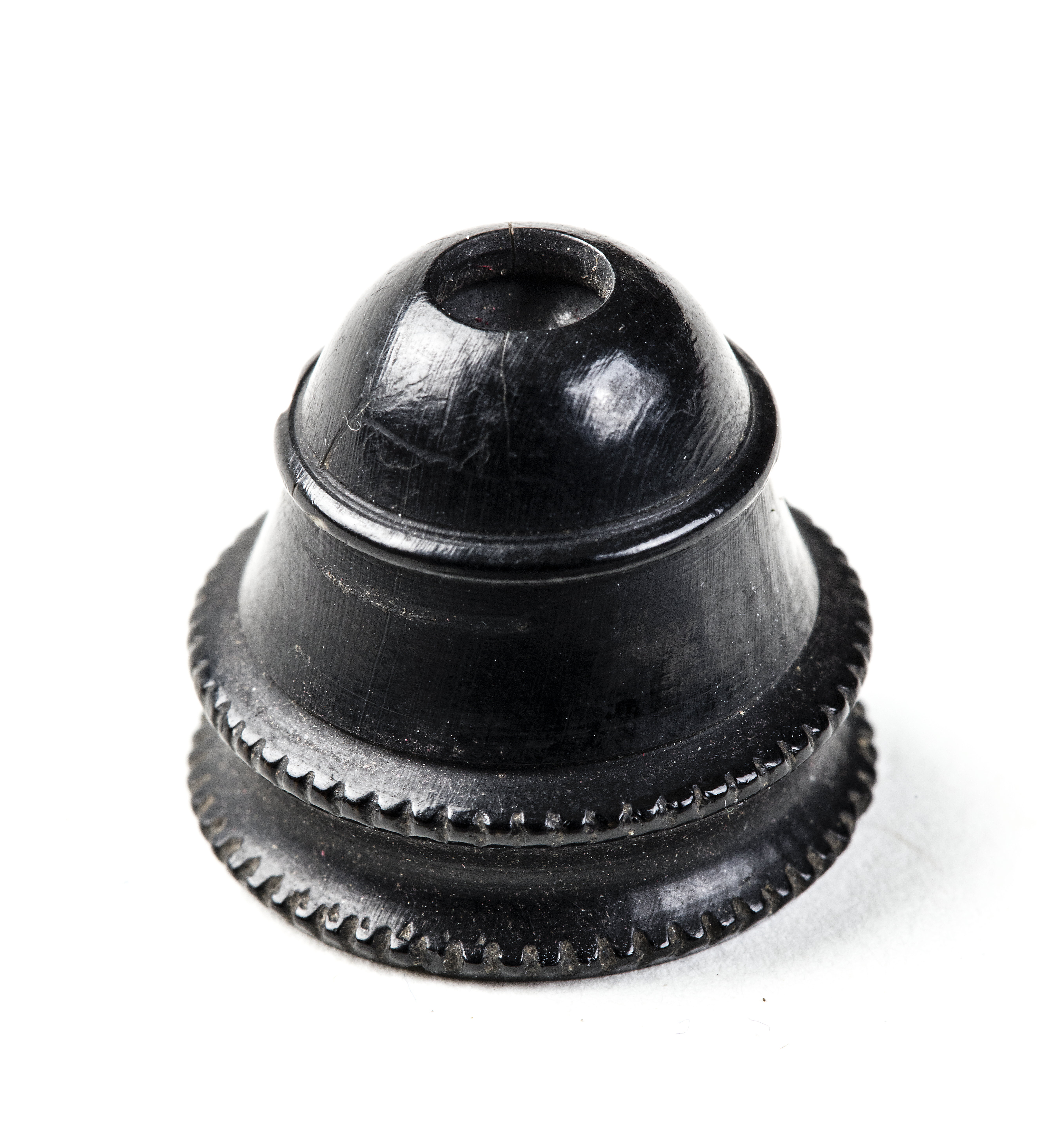 1700-talets mitt. Hus tillskuret i svartmålat horn el. ben? Konisk form med nertill två räfflade ringar och upptill rundat lock med centrerat titthål. Hus och lock gängade. Linsen saknas. I den breda änden skuret streck och en punkt.