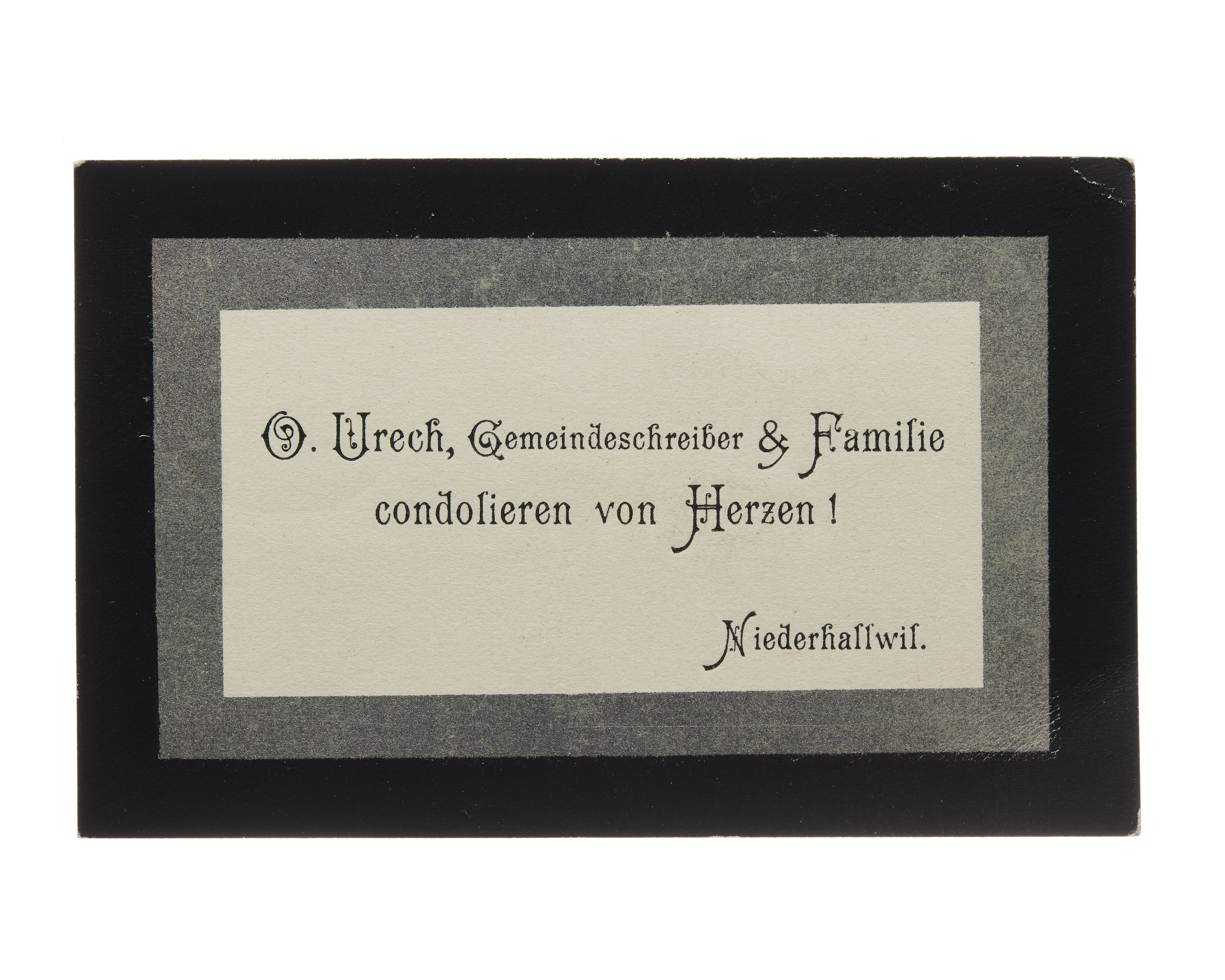 En kondoleanshälsning med sorgkant från sekreterare Otto Urech med familj, daterat 1921. Adress (nedre högra hörnet) Niederhallwil.