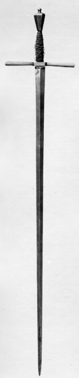 Fäste av slätt stål, korsformigt. Knapp omvänt konisk, åttsidig; nitknapp hög, lös (ej smidd i stycke med knappen). Parerstänger raka med sexsidigt tvärsnitt, något avsmalnande mot krysset. Kavel lindad med tvinnad mässingstråd, omväxlande tjock och mycket tunn. Upptill och nertill en flätad krans av tvinnad mässingstråd (lindningen söndrig och lös). Klinga rak, tvåeggad, slipad med mötande, jämnbreda skär, slipningen polerad.