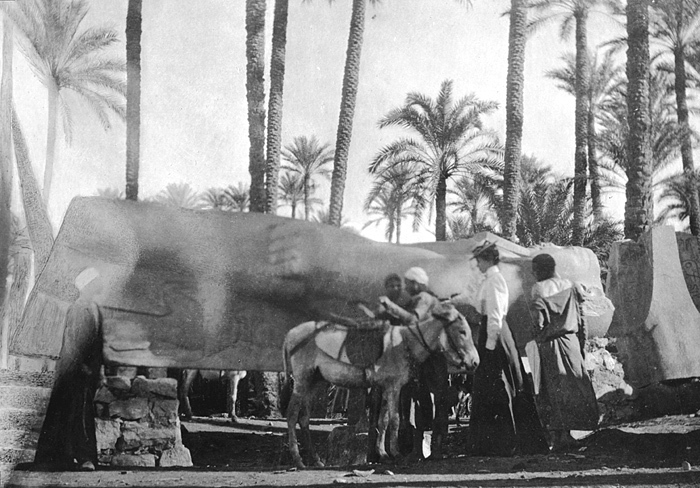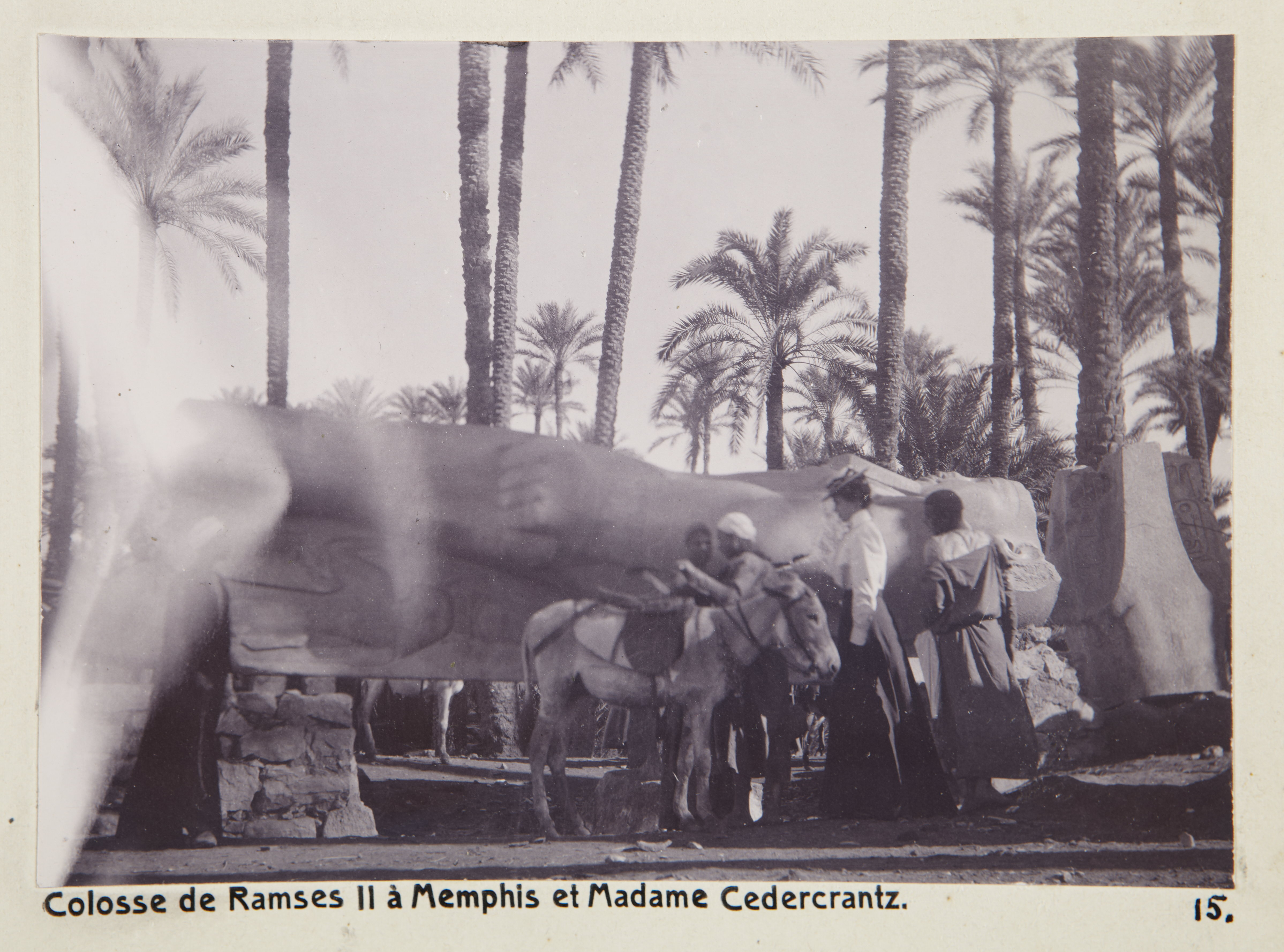 Ramses II-statyn i Memfis och fru Cedercrantz. Egypten. Text på fotografiet: Colosse de Ramsès II à Memphis et Madame Cedercrantz. Fotografierna LXVI:M.01.- 201. kommer från resan till Egypten och Sudan som Wilhelmina och Walther von Hallwyl gjorde vintern 1900-1901. De lämnade Sverige den 5 november 1900 och fortsatte från Egypten till Palestina den 28 mars 1901. Med på resan var döttrarna Ellen med maken Henric de Maré och Irma med maken Wilhelm von Geijer. Wilhelminas sällskapsdam, fröken Ida Uhse reste också med. Under en del av resan anslöt sig ledamoten av Internationella domstolen i Kairo, assessorn Otto Conrad Waldemar Cedercrantz med makan Anna Elisabeth. Vid resan uppför Nilen hade Walther von Hallwyl hyrt ångfartyget Columbia med besättning. Båtresan startade i Kairo 27 december 1900, gick ända till Wadi Halfa varifrån man reste vidare med tåg till Khartum och tillbaka till Wadi Halfa. Båten vände åter i riktning mot Kairo, men det verkar som att sällskapet tog tåg sista biten, från Luxor. Henric och Ellen de Maré samt fru Cedercrantz lämnade båten redan då de passerade Luxor första gången. Resten av sällskapet återvände till Kairo den 1 mars. Fotografierna LXVI:M.01.-120. togs av resenärerna själva, de största av Ellen de Maré, de mellersta av Wilhelmina von Hallwyl och de minsta av Wilhelm von Geijer. Resten köptes av professionella fotografer i Kairo, de flesta från Studio Photogr. Artistique G. Lekegian & Cie. Alla uppgifter kommer från Ida Uhses reseanteckningar.