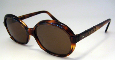 Ljusbruna solglasögon med slipade plastlinser, rundade bågar. Skänklarna förstärkta medmetallband och dekorerade med V:n. I högra skänkeln inpräglad text: "CIVA B-te // MADE INFRANCE" och fastgjutet siffran 1033.
