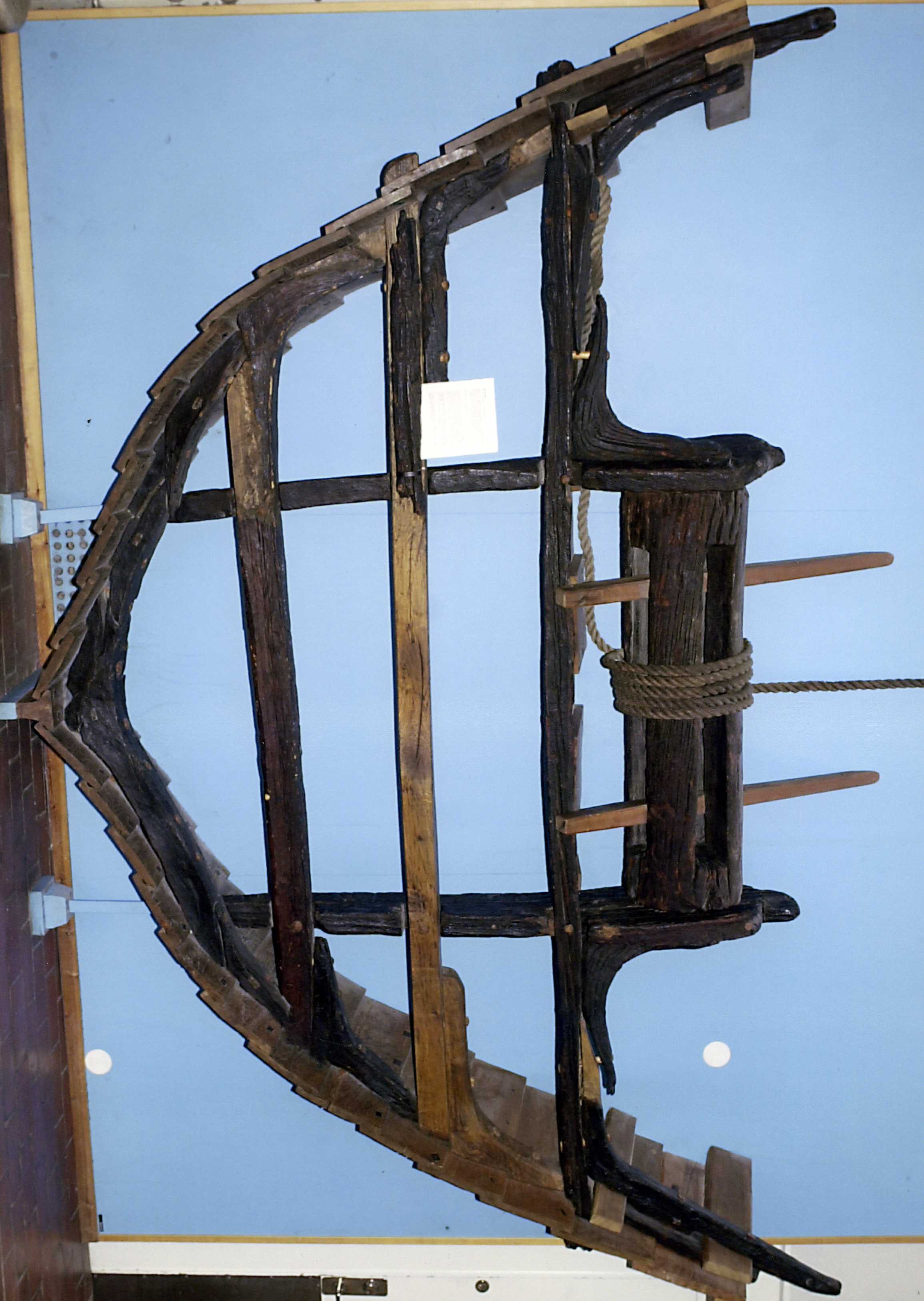 Delar av klinkbyggt, enmastat fartyg.