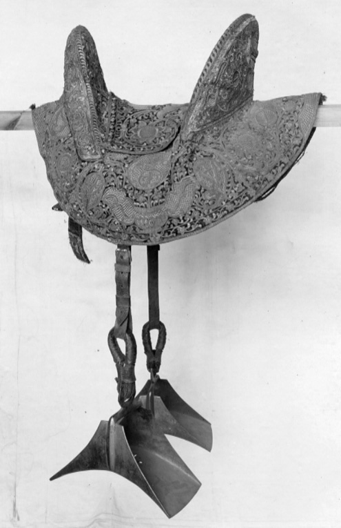 Stigbygel av förgyllt stål, triangulära skänklar med konkav bas, på mitten en vertikal mittås övergående i rak bygel med rund remögla, plan på ovansidan. Trampstöd, rektangulärt välvt på ovansidan med en utsparad rektangel med genombrytningar av nyckelhålsform och runda hål ordnade i stjärnmönster. L: 329 mm, b: 160 mm, h: 246 mm, vikt: 1750 gr