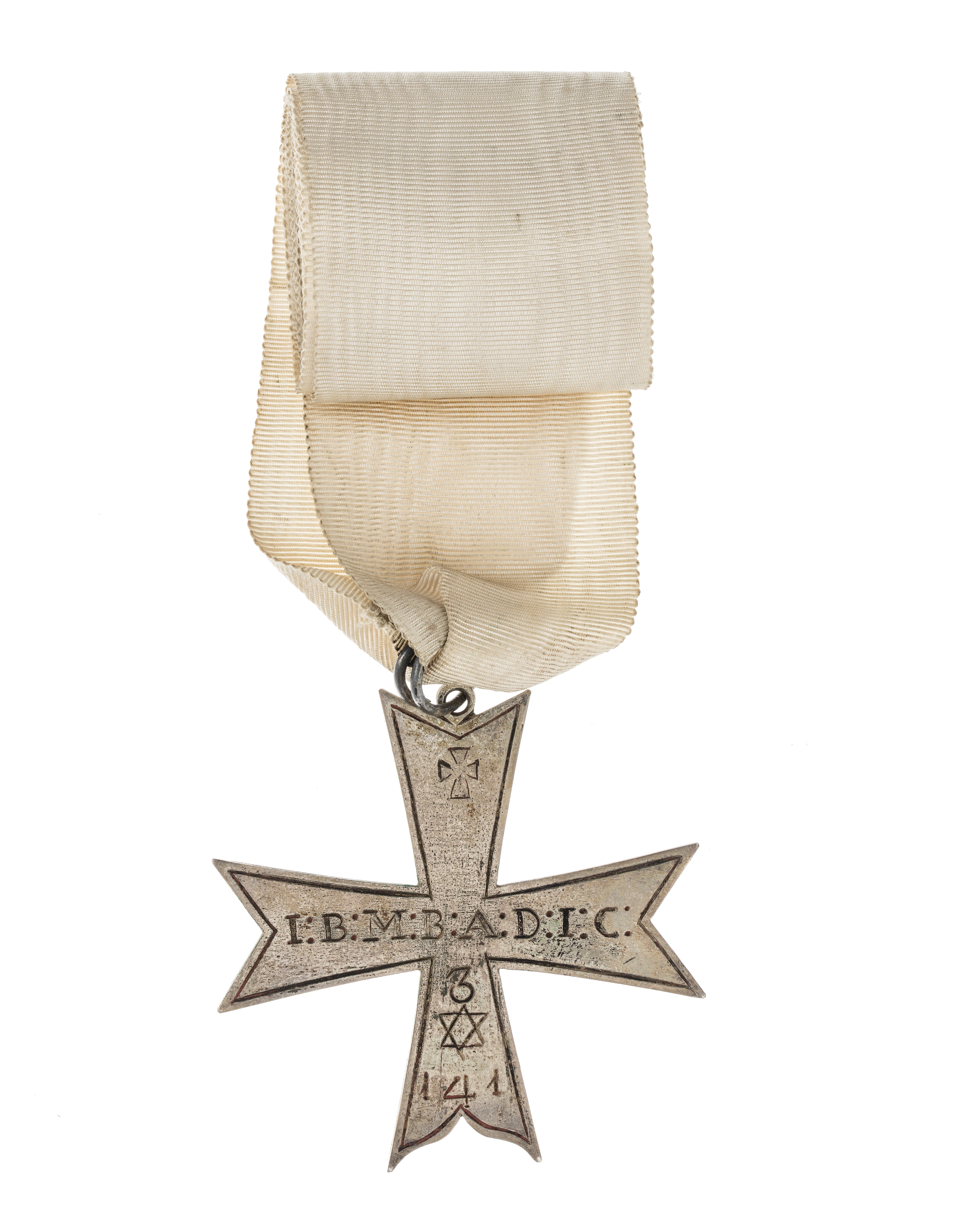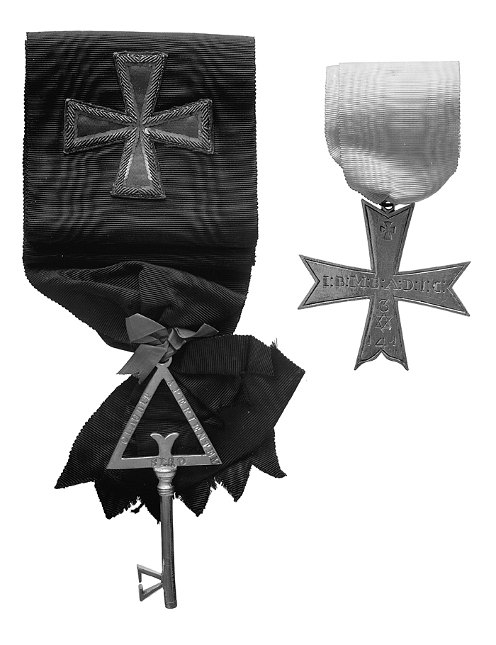 INSIGNIER TILL FRIMURARORDEN Bestående av ett gradband till 8:e graden samt en halsdekoration. Gradband med nyckel: Av svart vattrat siden (moiré). Dubbelt, på ena hälftens utsida i mitten ett påsytt kors av rött siden, korsarmarna i form av likbenta trianglar, kring kanterna en pålagd kordong i guld, med inkanterna begränsade av en paljettrad; bandets ändar sammanfästa till en stor rosett, vari nyckeln är fäst. L (dubbelt) 83 B 10 cm. Nyckel: Av förgylld mässing. Handtag i form av en liksidigt triangulär ram, på vars båda sidor inslaget latinsk inskrift, på övre vinkelspetsen en rund ögla, på ramens mitt över skaftet ett tvåflikat ornament. Skaft rundstavigt, upptill på detta en profilerad utsvällning; ax liksidigt triangulärt, med en öppning på den fria sidan. Nyckeln fäst vid bandets rosett medelst ett rött sidenband. L 11,8 B 5,2 cm. Halsdekoration med kors: Av silver. Grekiskt kors med kluvna ändar, på övre armen mellan spetsarna en rund ögla, vari en oval dubbel ring av rundstavig ten (för bandet). Band (dubbelt): Av vitt vattrat siden (moiré). H 6 B 6 cm Band, L (dubbelt) 42 B 4. Gradbandet bärs från vänster axel till sedvanlig aftonklädsel med svart väst i frimurarsammanhang. Halsdekorationen bärs endast i sammankomst i gr. VIII. Walther von Hallwyl recipierade (erhöll 1:a graden) i S:t Johanneslogen S:t Erik 6 december 1873 och erhöll 8:e graden 23 februari 1884