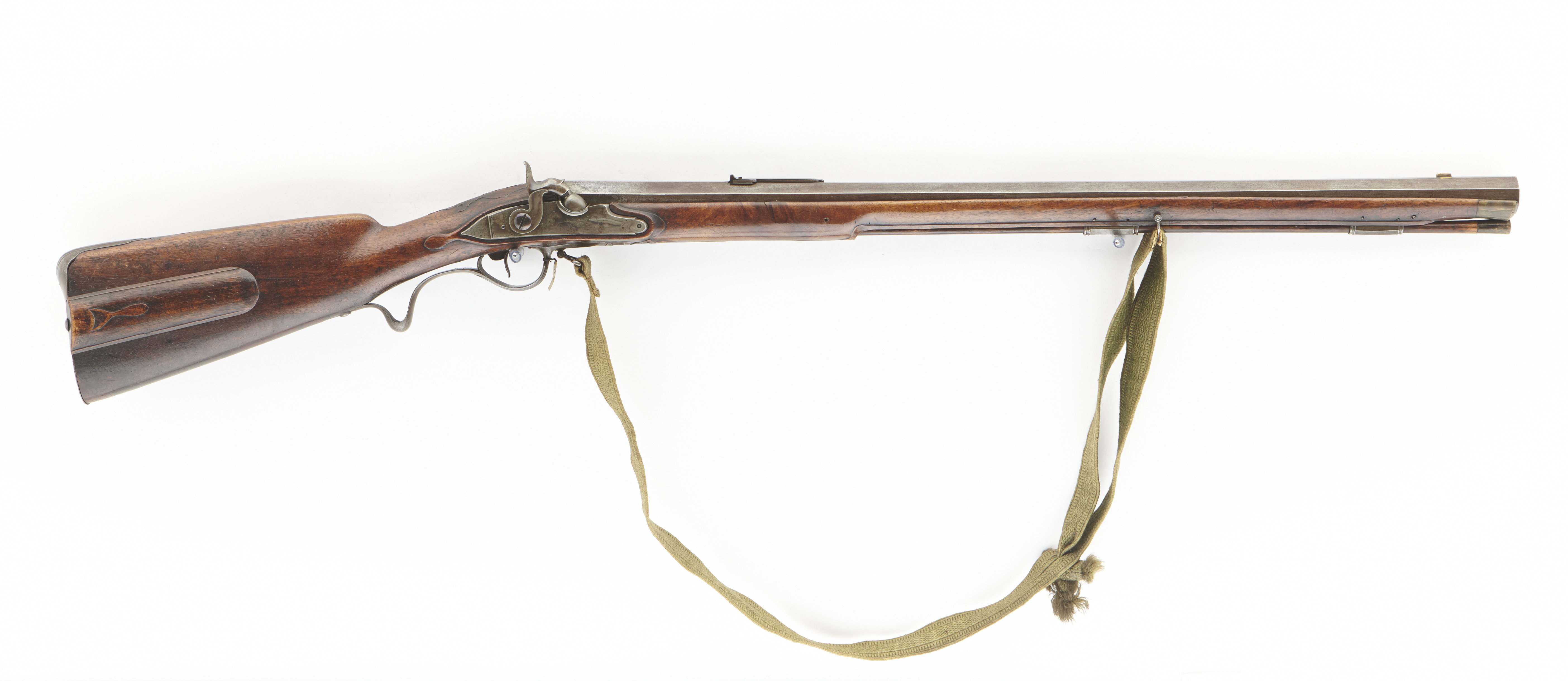 Åttsidig, brunerad, räfflad pipa av stål med trumf, 8 räfflor, skålade bommar. I fänghålet på h.sida fastlött en tändhattssnäcka. Flammigt svansskruvblad, över skarven stämplat: I. Riktmedel: Fjädersikte av blånerat stål, graderat 1-12. Inlaxat stolpkorn av koppar. Fästning: Två häften. Pipan fäst med krysskruv, två pipstift av stål samt främre rembygelskruven. Flintlås ändrat till slaglås. Plant låsbleck med fasade kanter, försänkt bakre spets, graverade rankor. Framför hanen graverad signatur: "FRENBERG", bakom hanen: "STOCKHOLM". Platt hane med blånerad, slät, välvd nötskruv. Harmynt slaghuvud, nätskuret tumgrepp. Fästning: Två blånerade låsskruvar. Avtryckaren svagt böjd. Helstock av valnöt med kolv av fransk typ med kindstöd och kolvåda. Vid kindstödet snidade voluter. Näsband av horn, övriga beslag av stål. Bakplåt av brunerat stål med bardisanliknande spets på kolvryggen, list över hälen. Sidbleck av brunerat stål med rokokodekor. Två kantiga rörkor. Brunerad varbygel med konturerad list på bygeln, rund framstolpe, kluven bakre stolpe, fri bakre arm, baktill pungformigt nedsvängd. Främre armen plan, balusterformig med fasade kanter, avslutning i form av urna och slätt, flikigt blad. Framför framstolpen en rembygel av stål, den andra vid bakre rörkan. Tillbehör: Laddstock av trä, l: 730 mm, med horn- och mässingsbeslag.