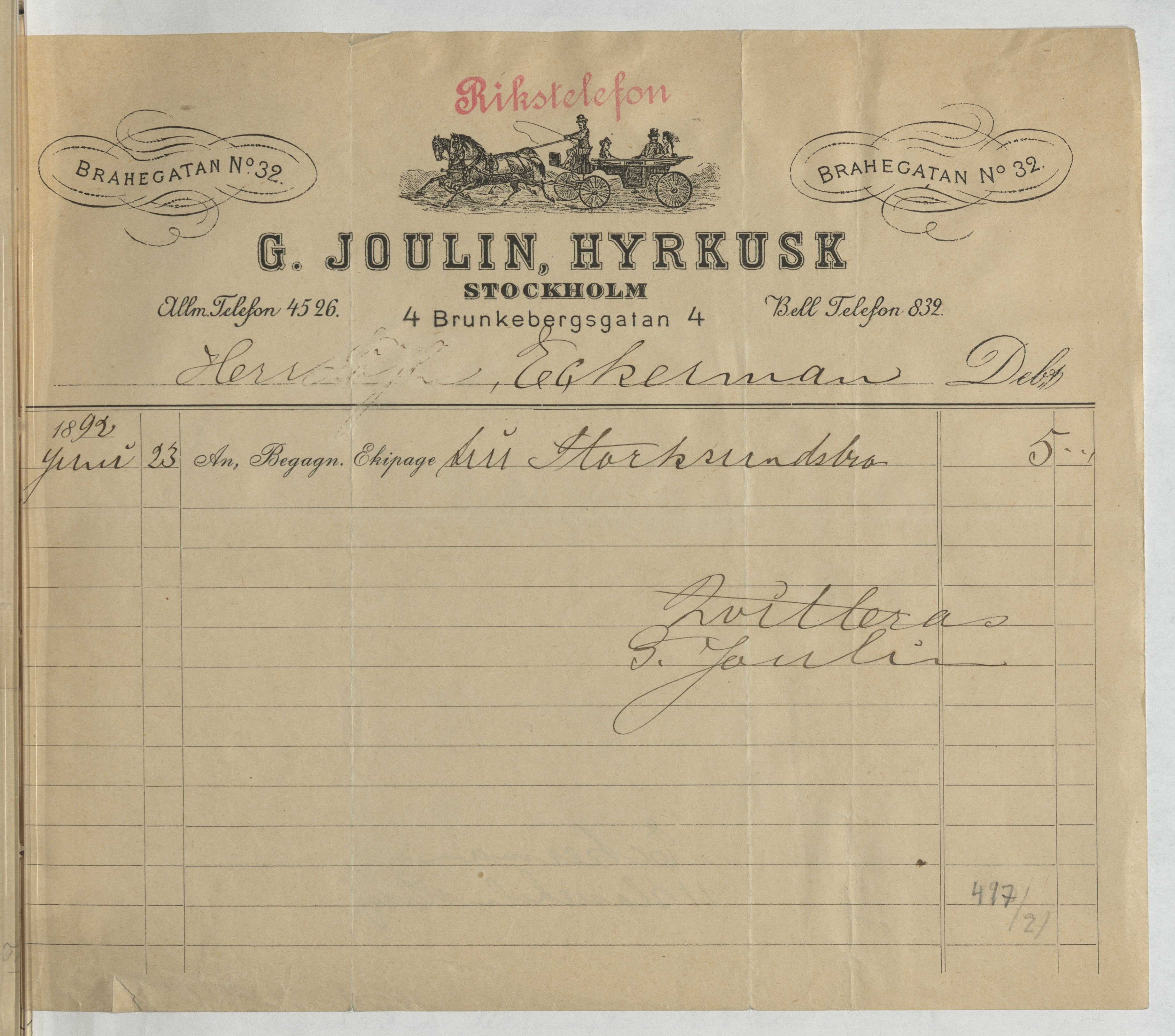 Kvitto från G. Joulin, Hyrkusk. Stockholm, 1892.
