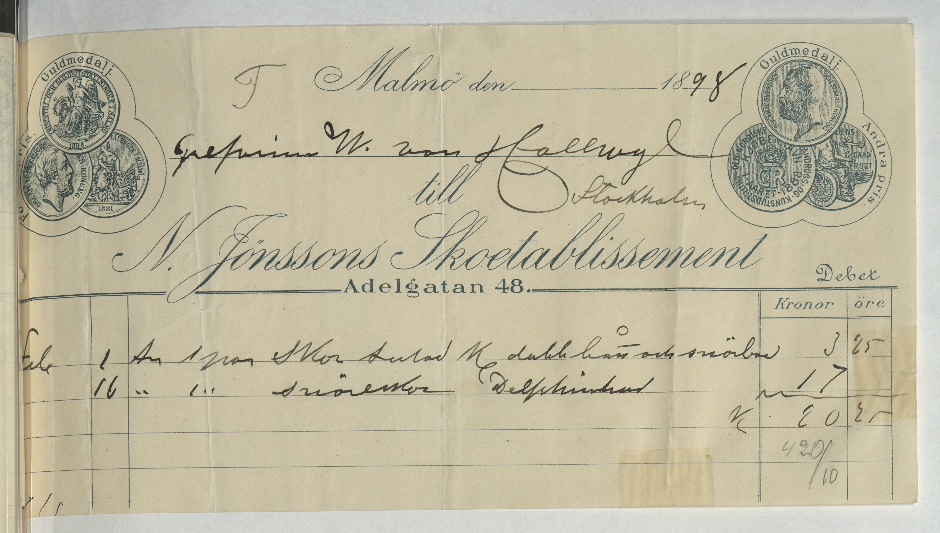 Kvitto från N. Jönssons Skoetablissement. Gällande lagning och inköp av skor. Malmö, 1898.