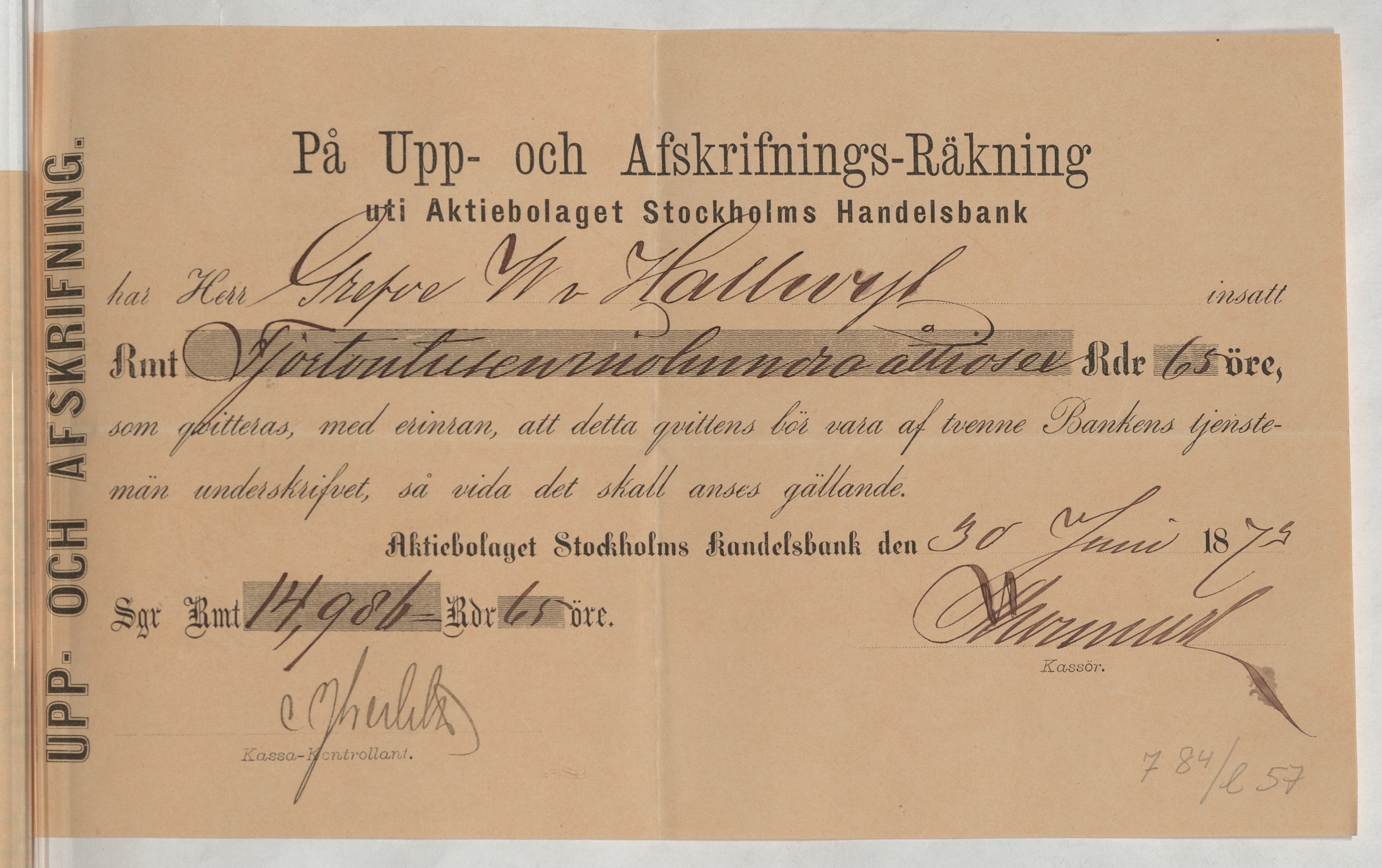 Kvitto från Aktiebolaget Stockholms Handelsbank rörande Upp- och Afskrifnings-Räkning
