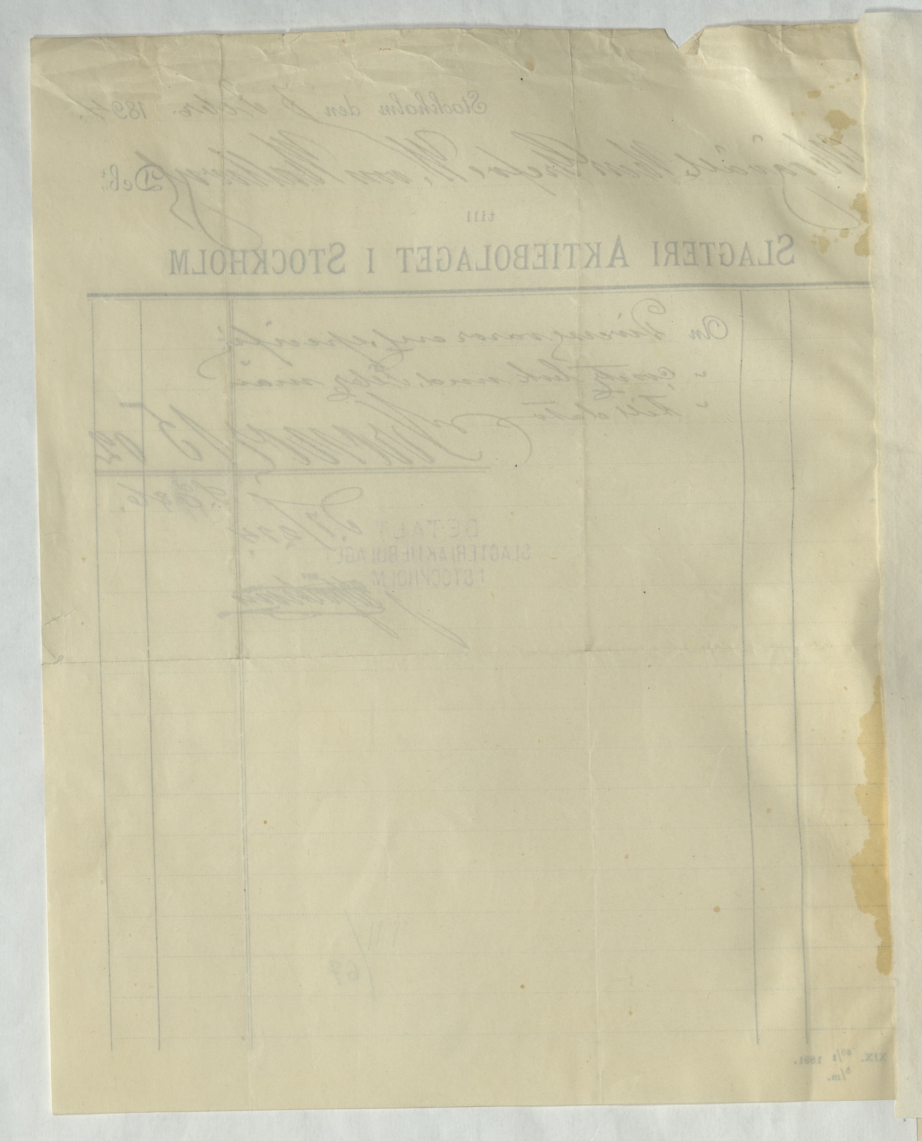 Kvitto från Slagteri Aktiebolaget i Stockholm