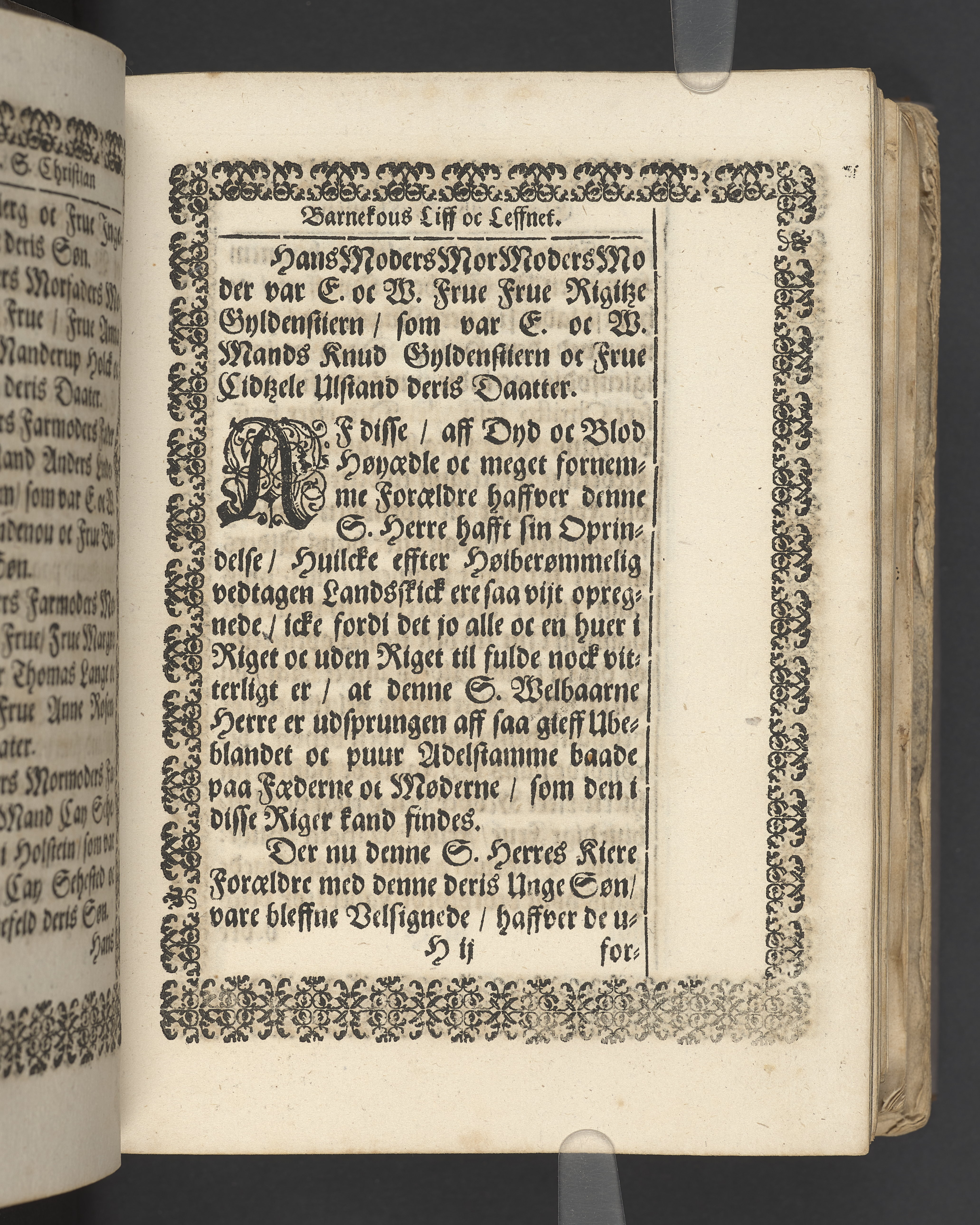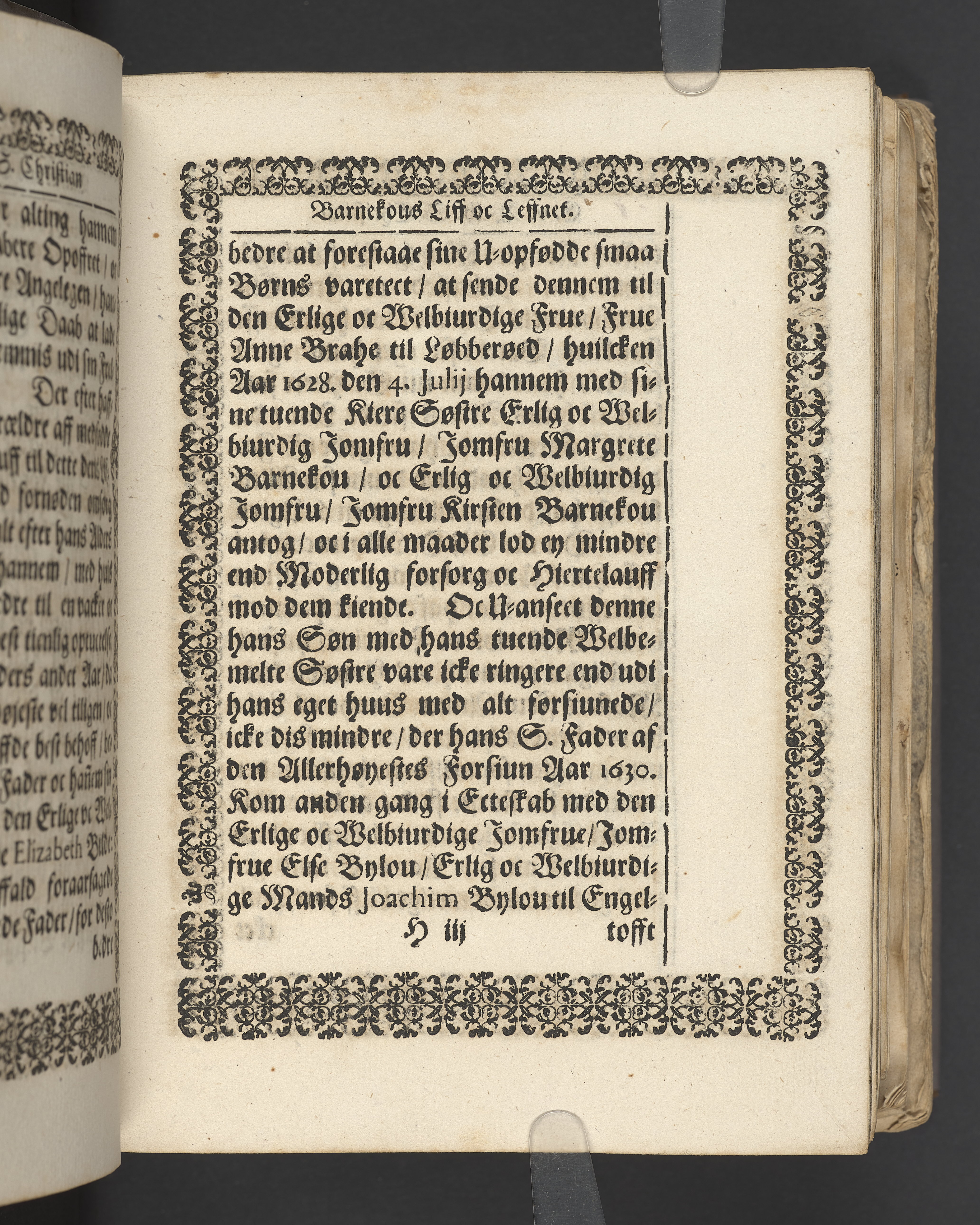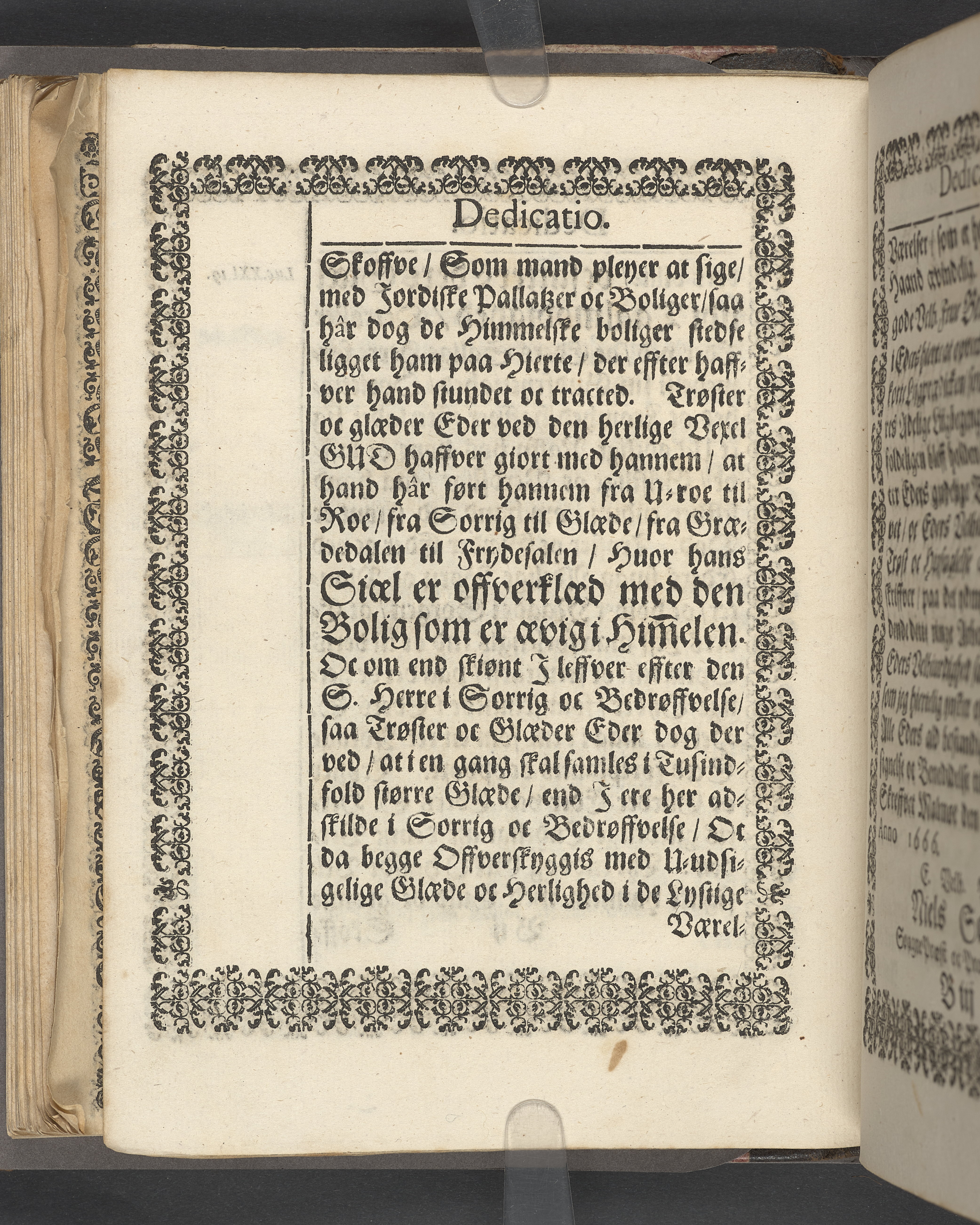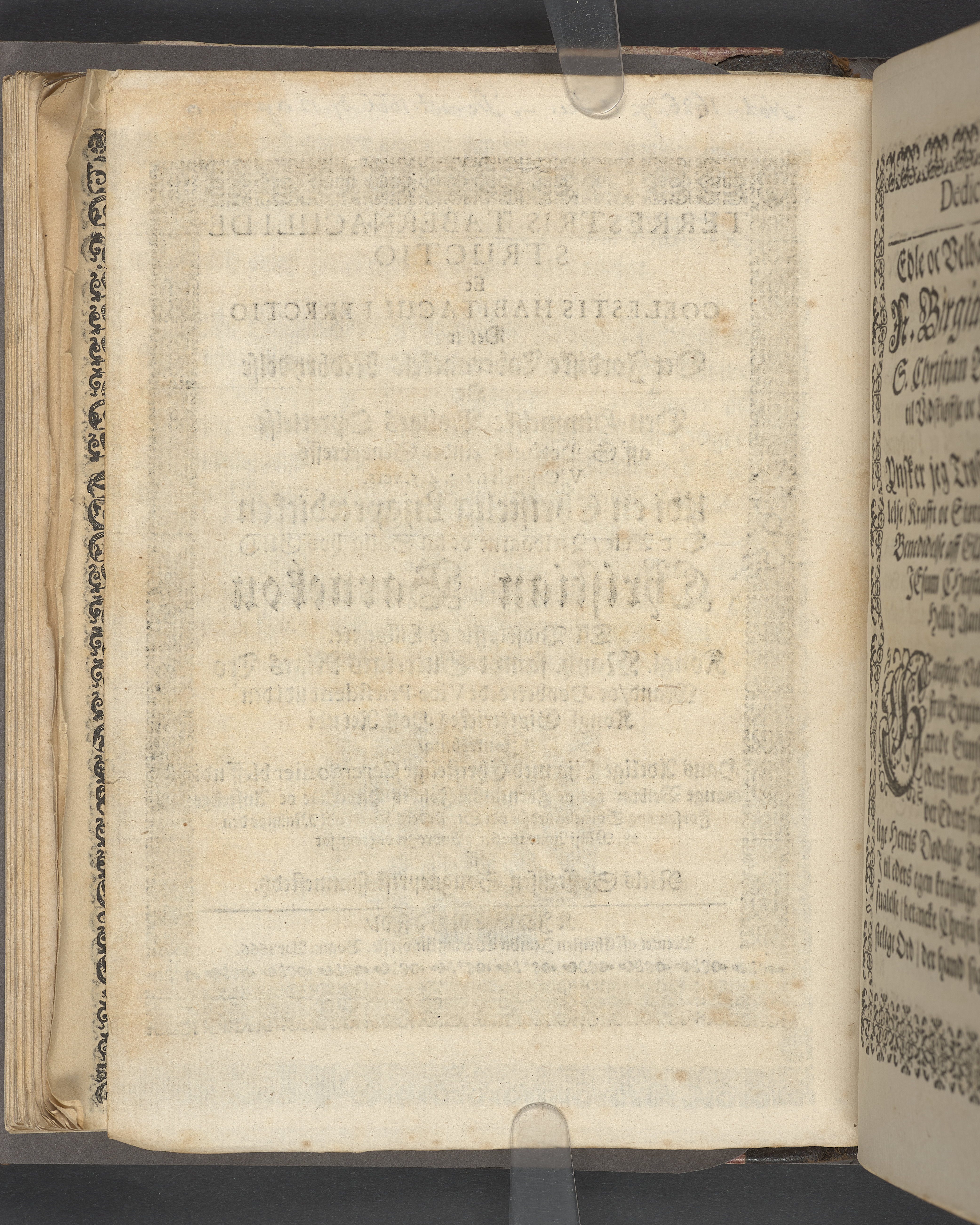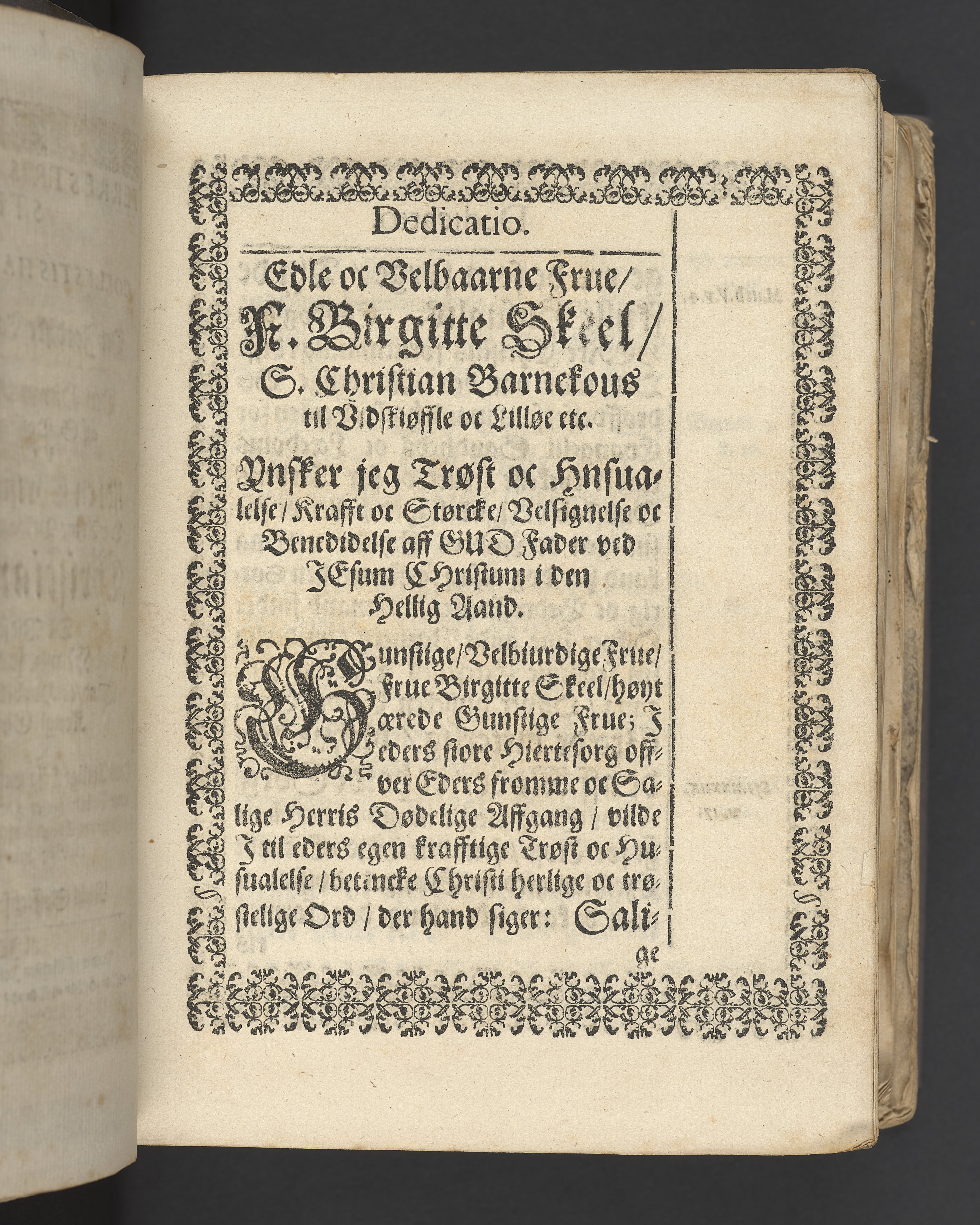 Sprängt snitt. Högst upp på titelsidan anteckning i bläck med uppgifter om födelse- och dödsdatum för den avlidna. Tryckt dedikation till änkan Birgitte Skeel.