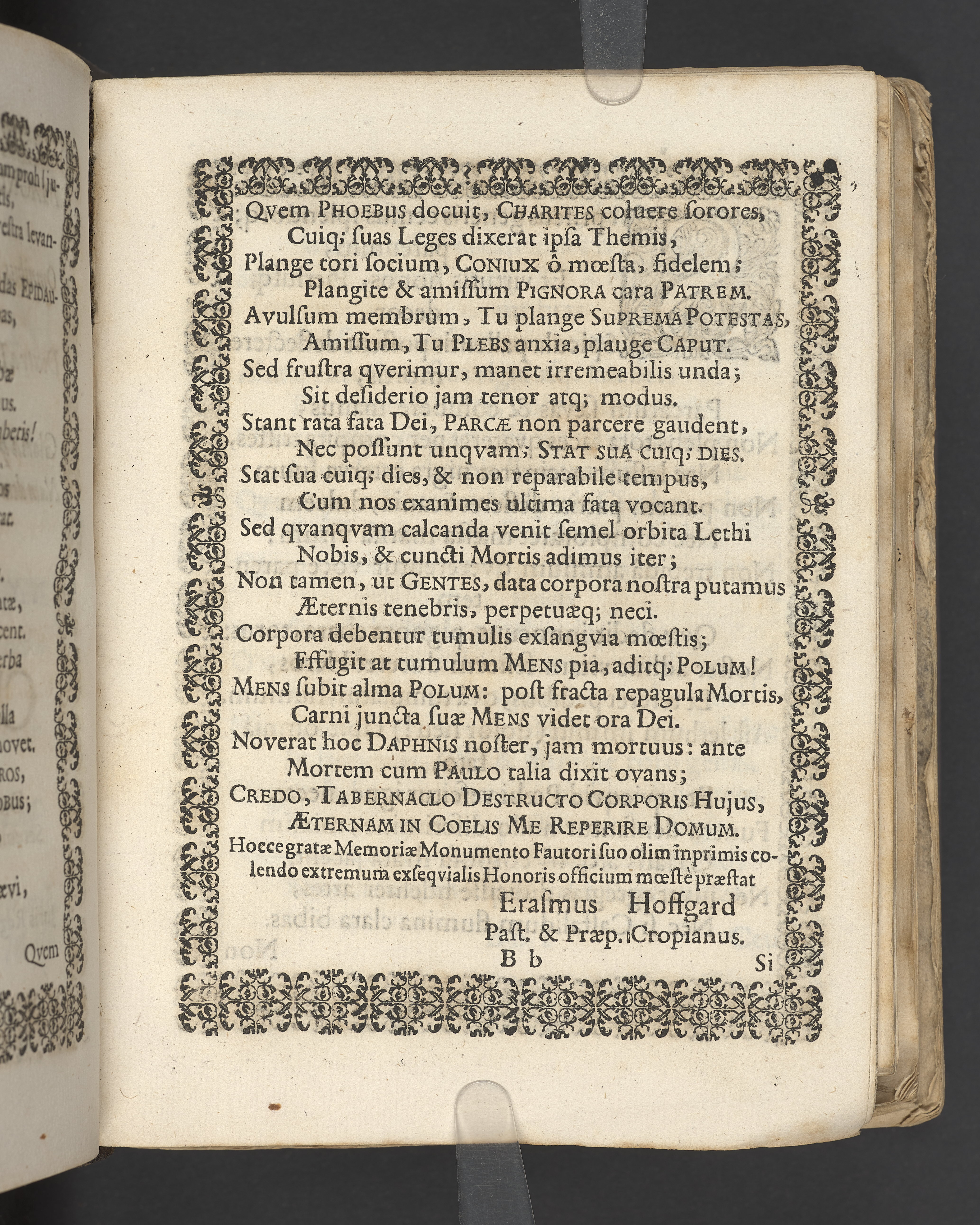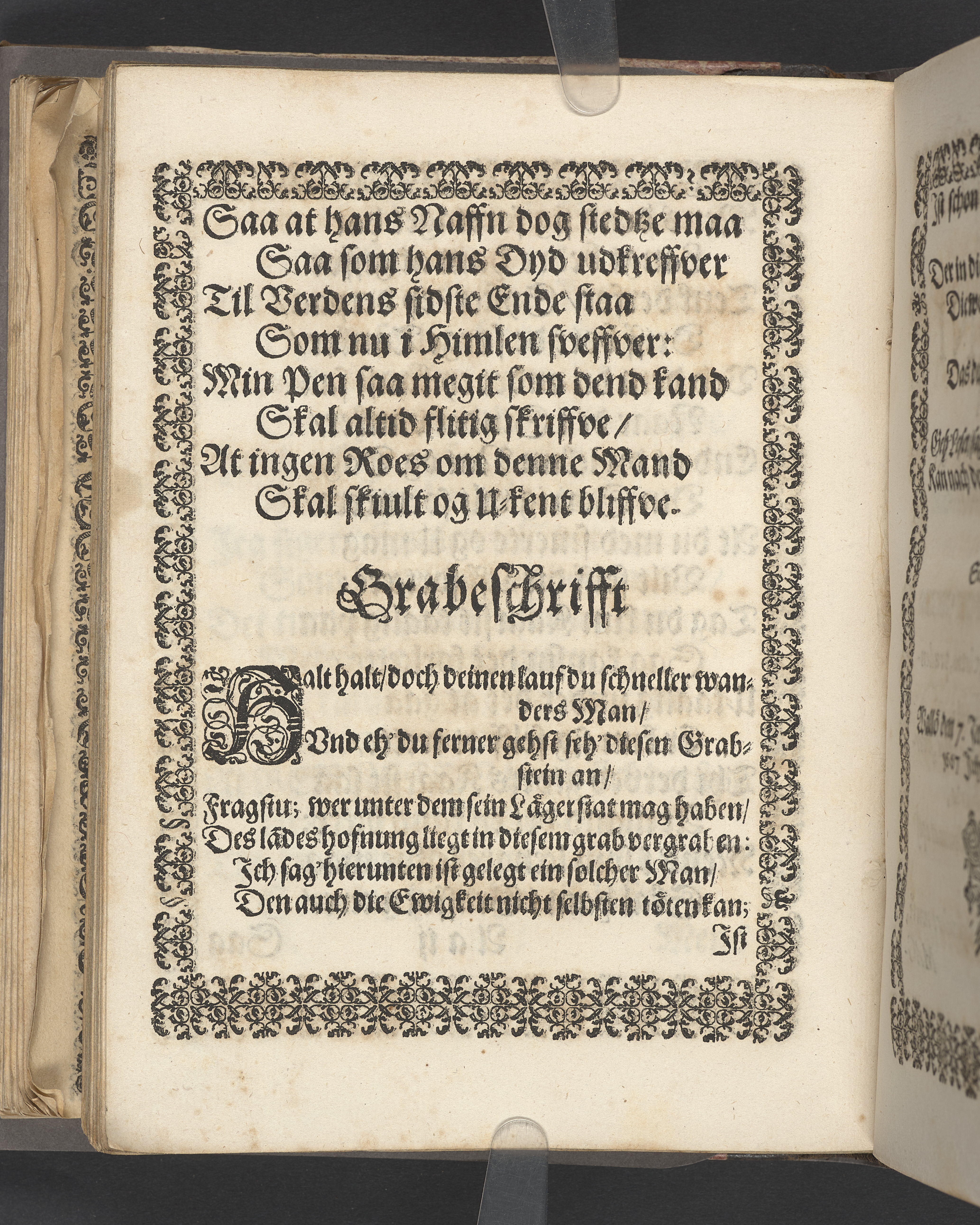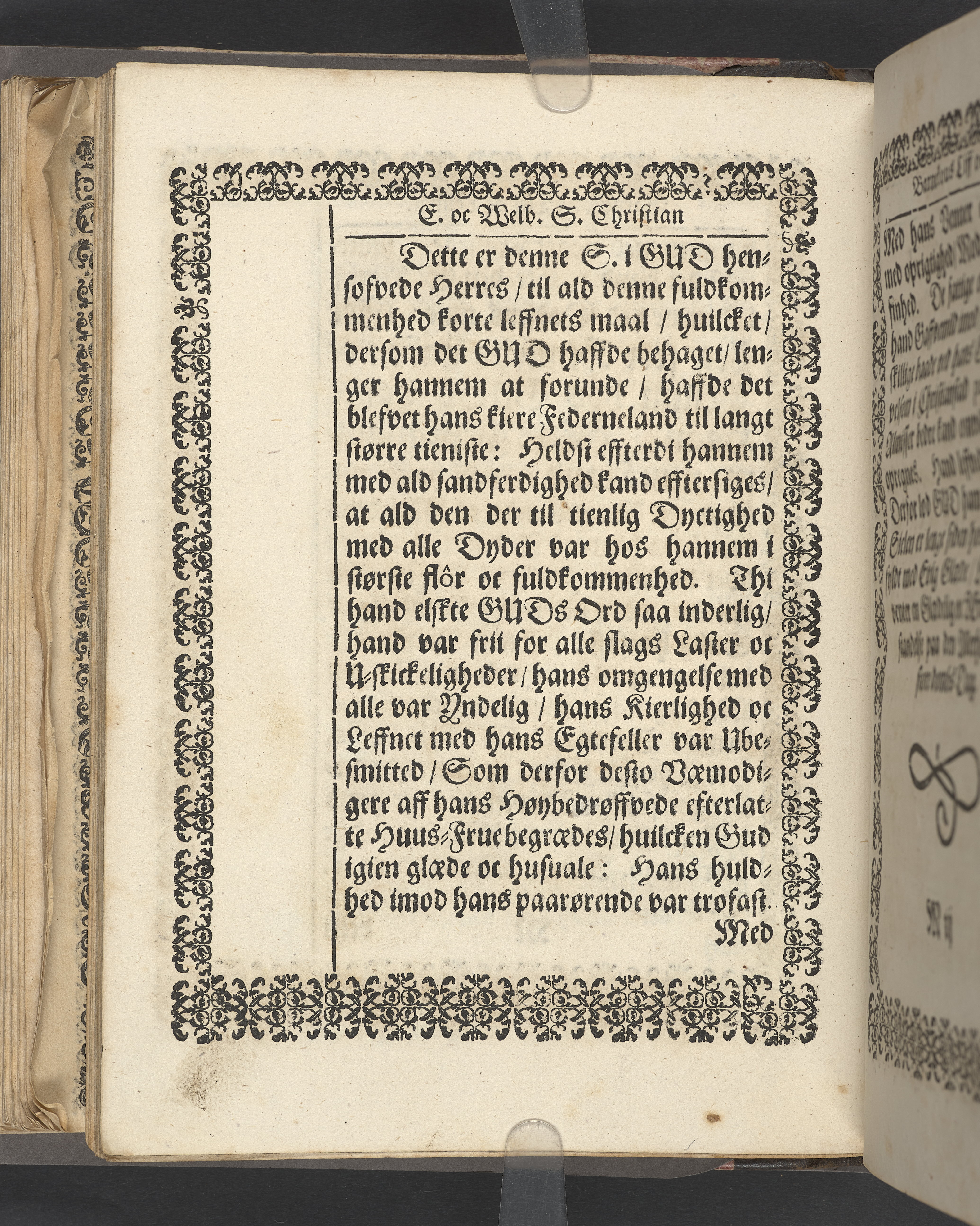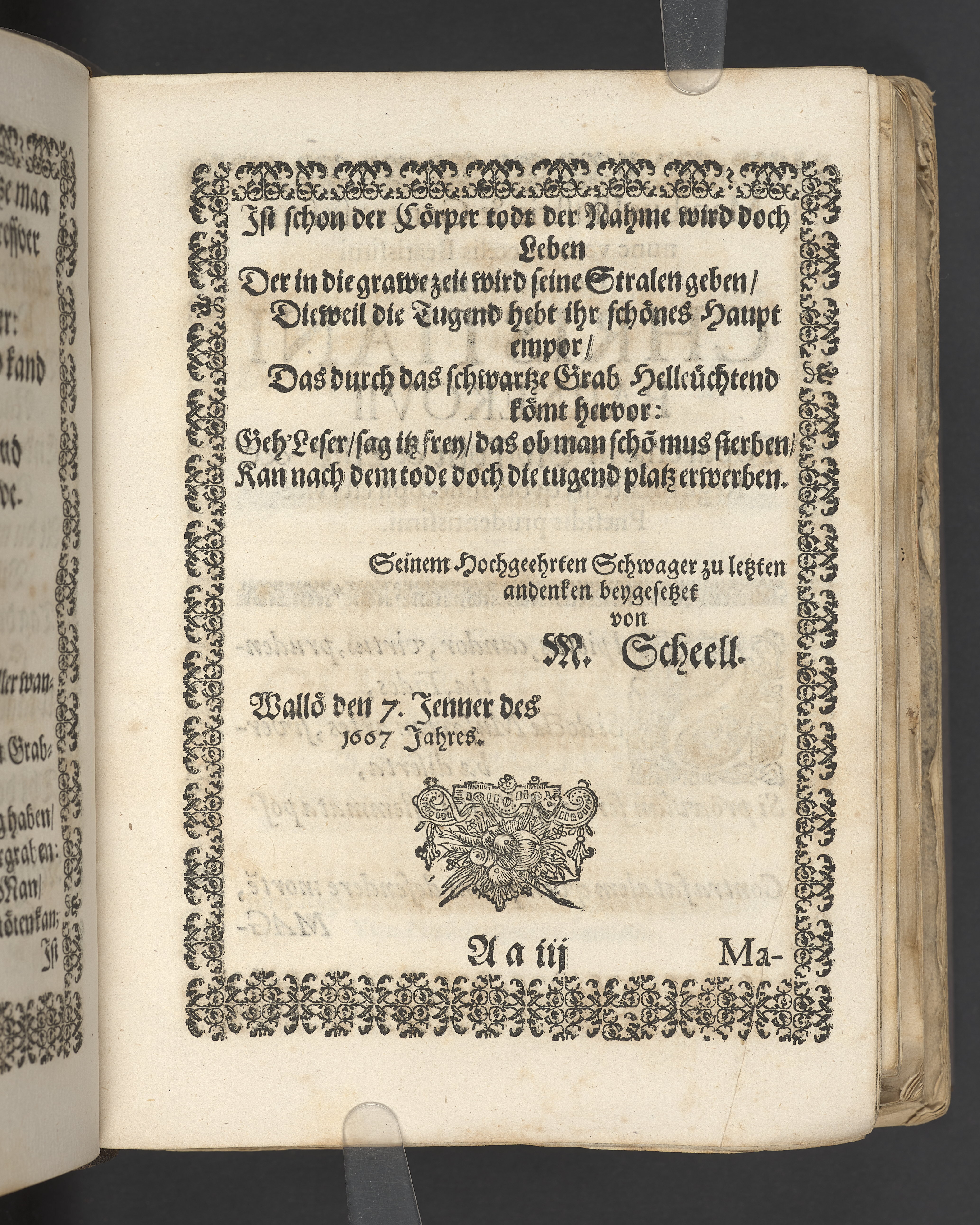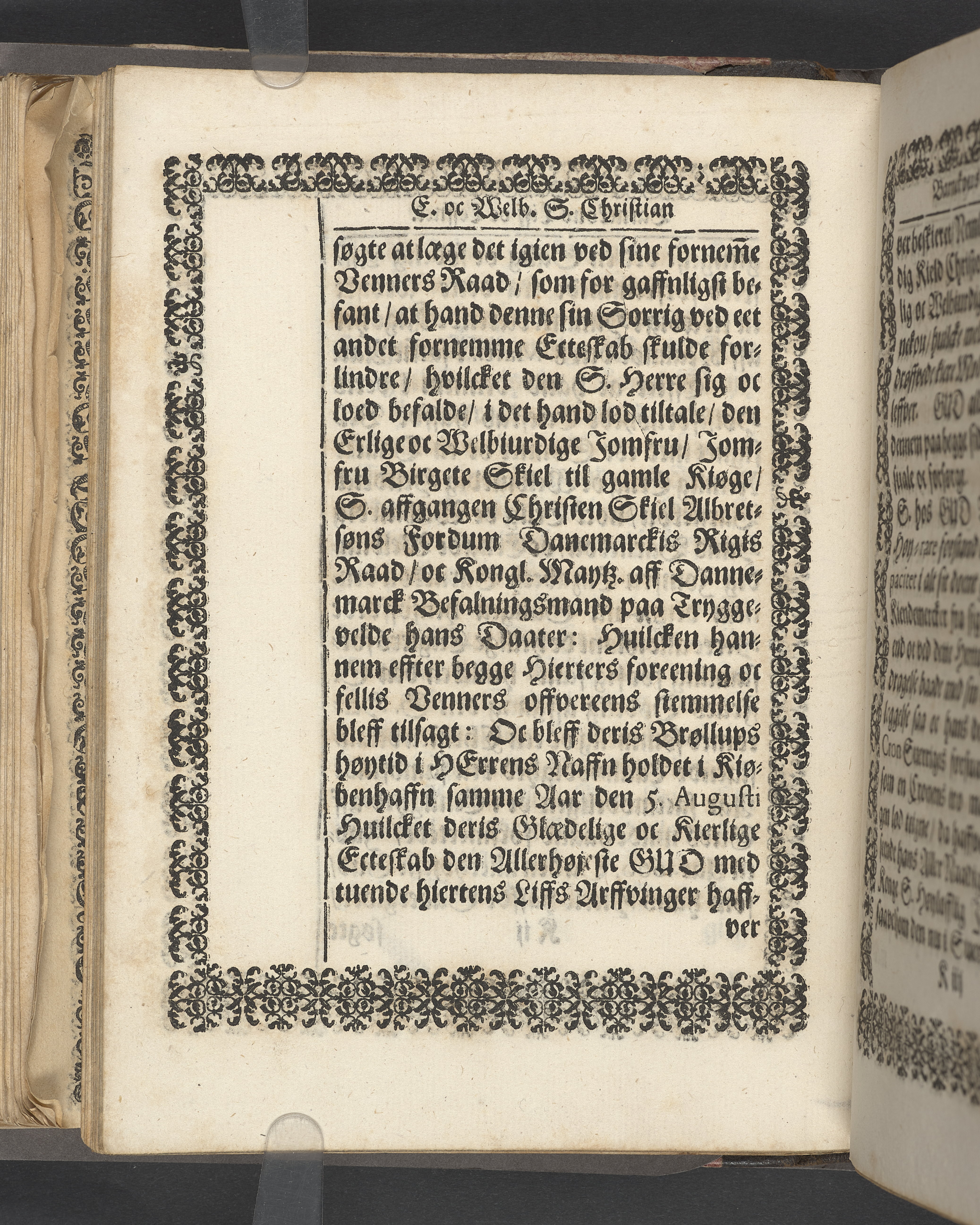 Sprängt snitt. Högst upp på titelsidan anteckning i bläck med uppgifter om födelse- och dödsdatum för den avlidna. Tryckt dedikation till änkan Birgitte Skeel.
